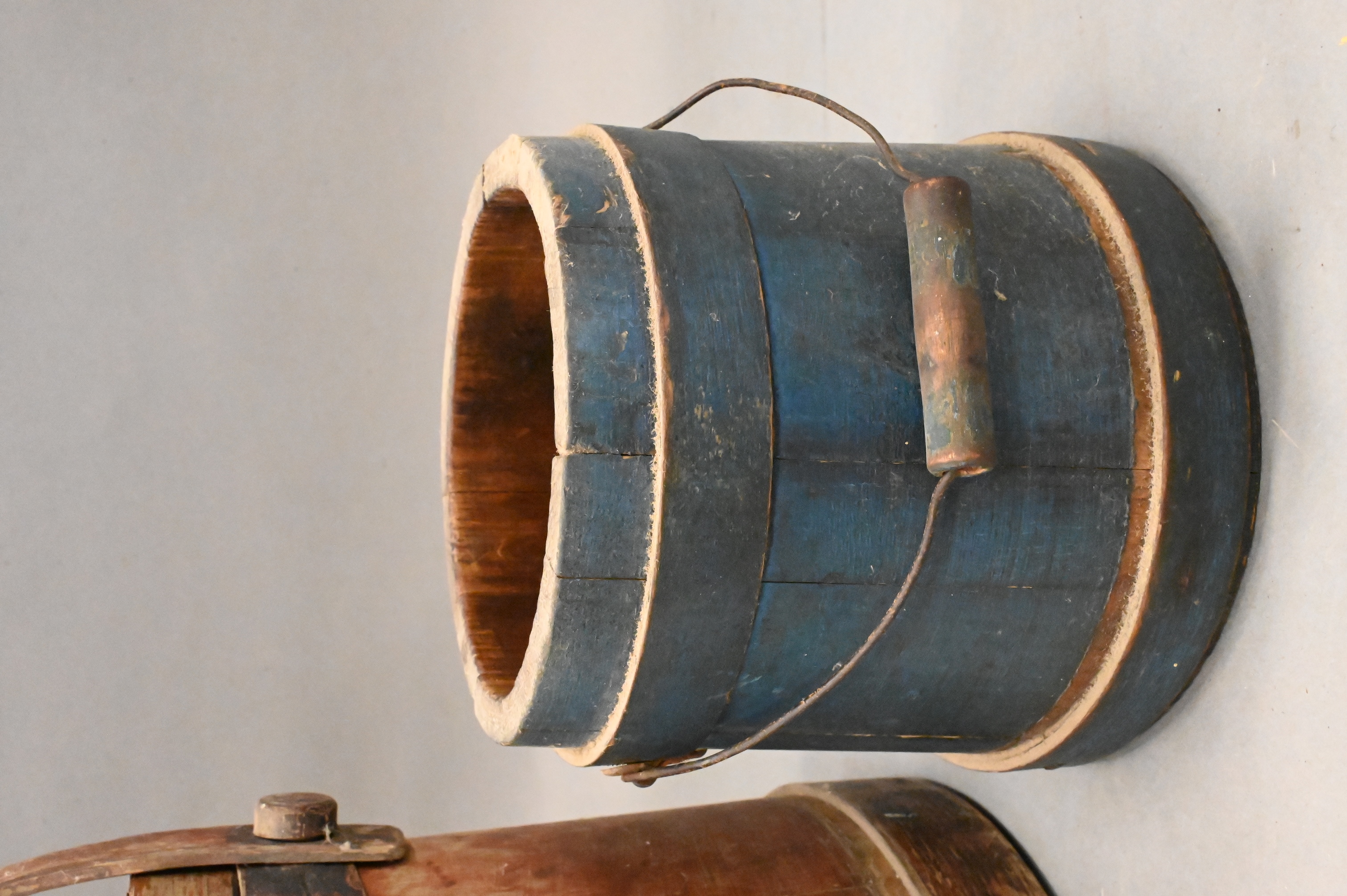 larger one in old paint marked aluminum, having wood swing handle cover and copper nails along with smaller having metal swing handle and copper nails without cover in blue paint