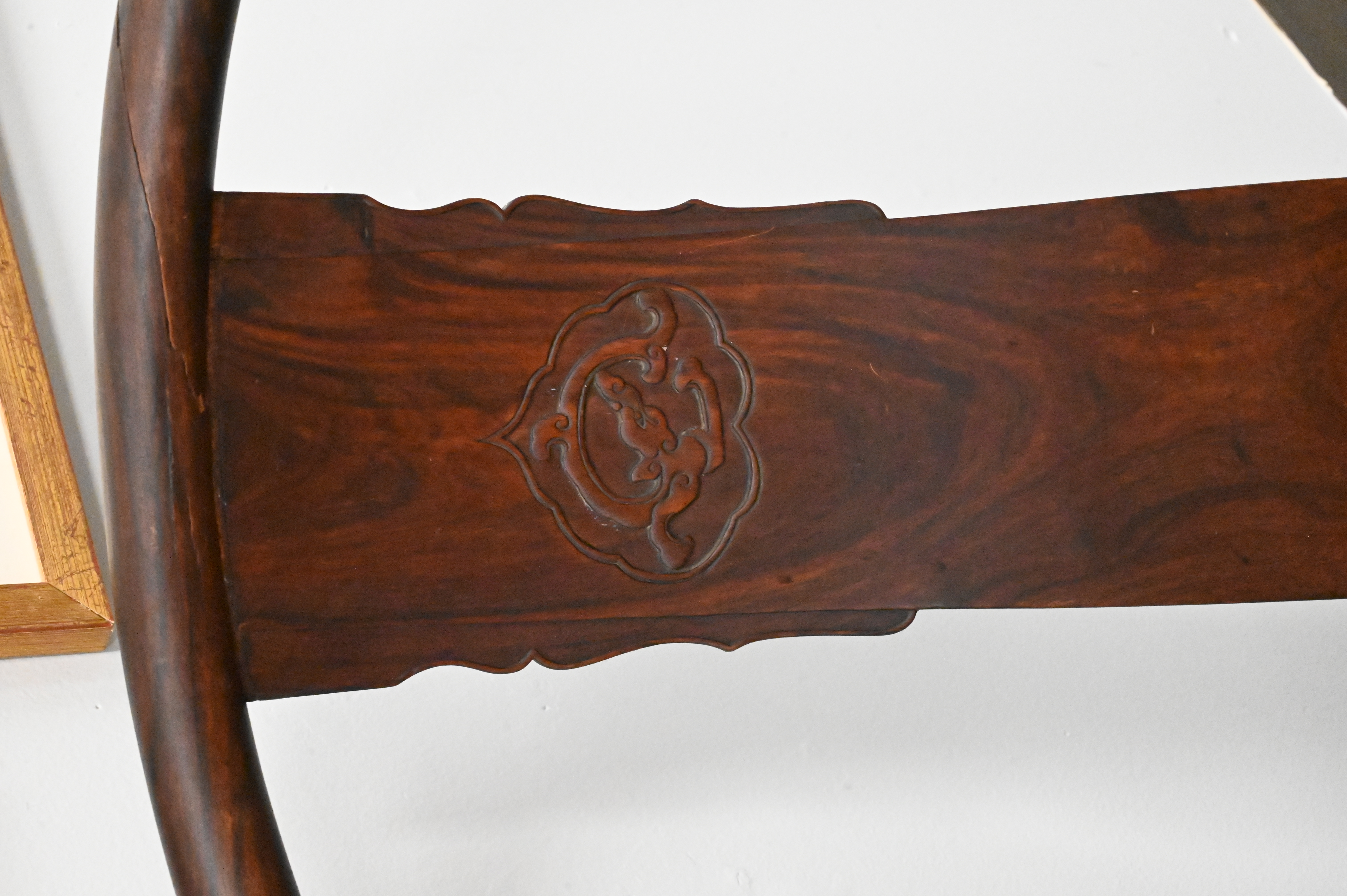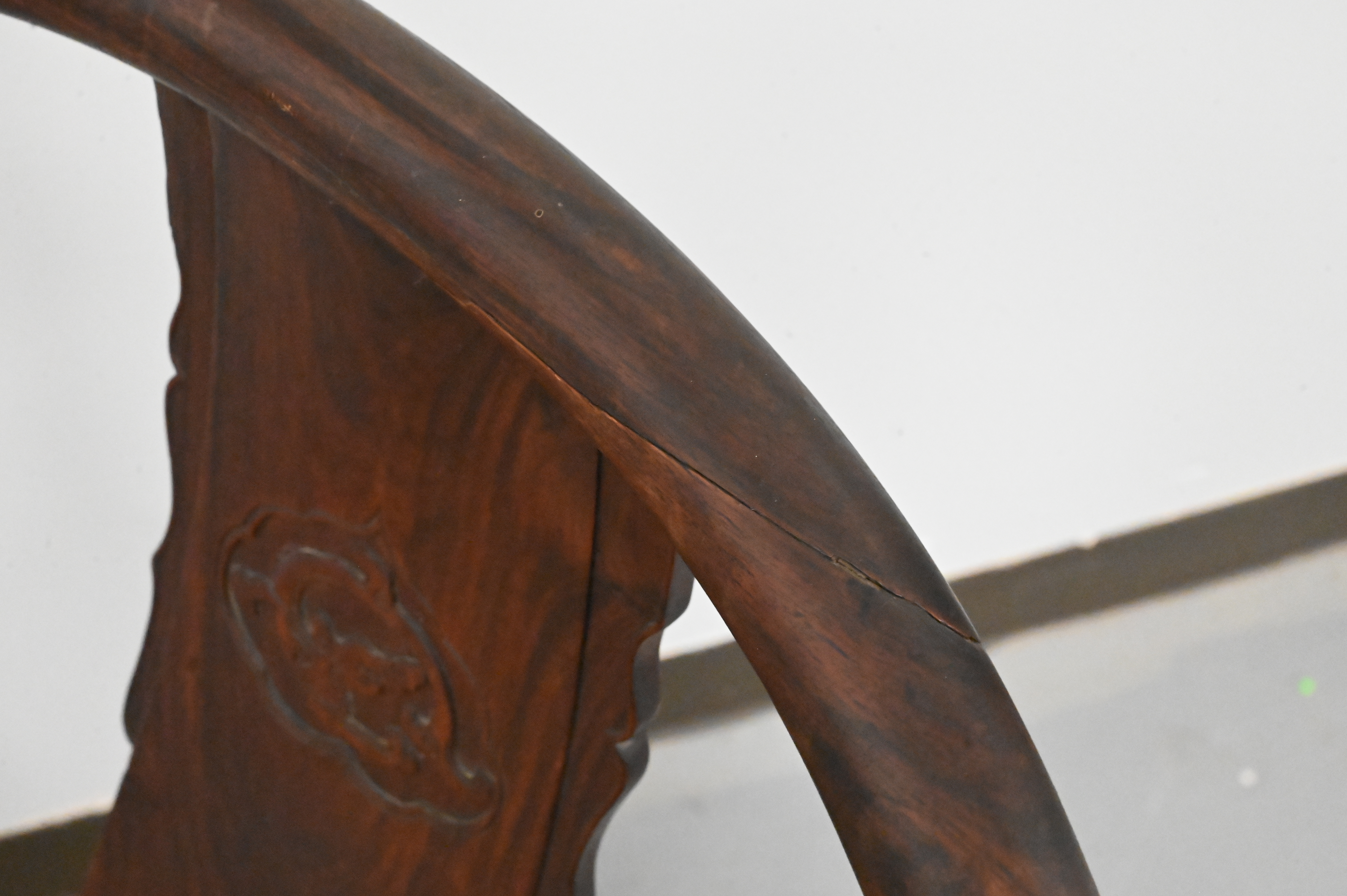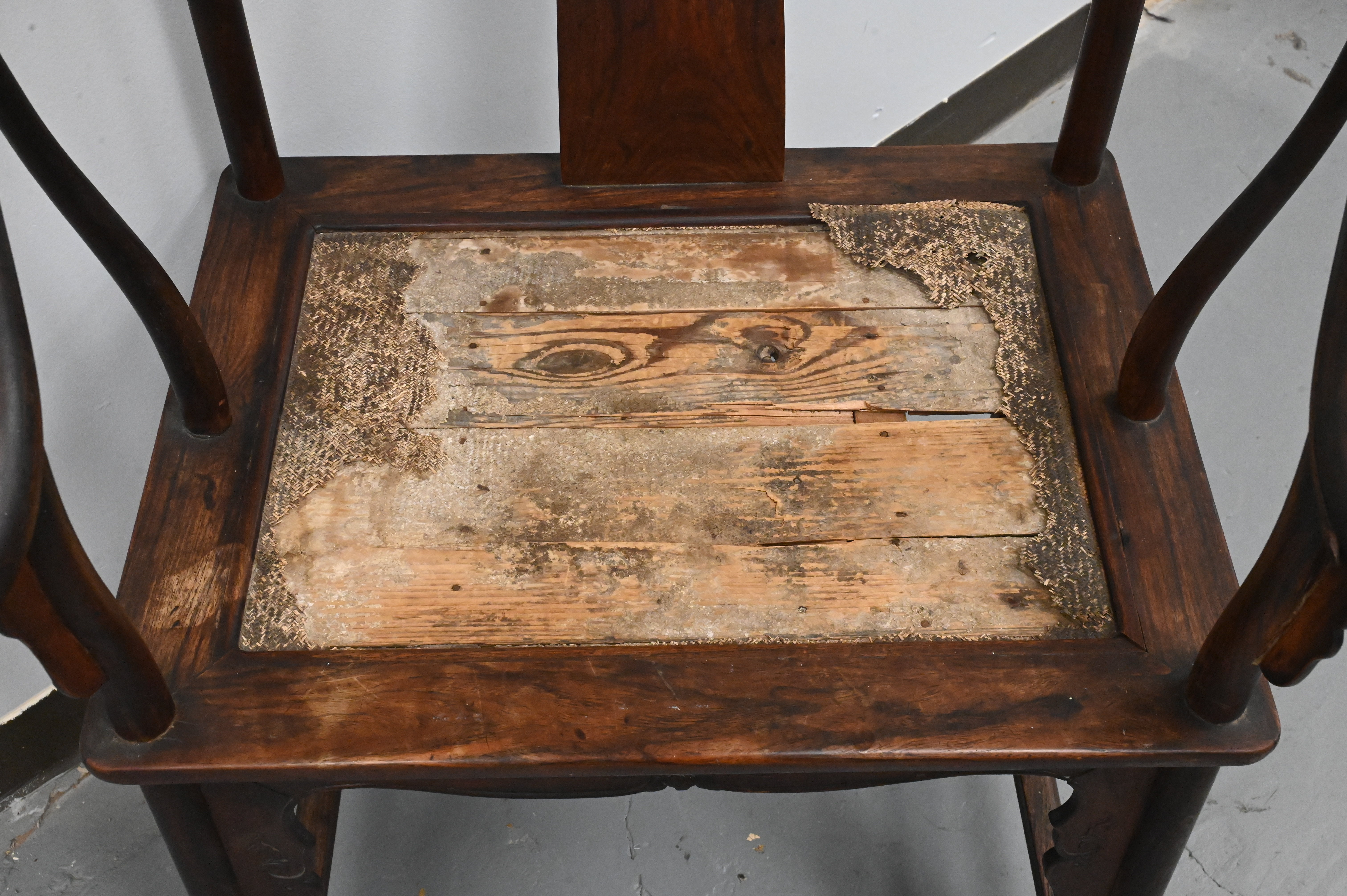 Constructed of Huanghuali wood with a sweeping yoke-shaped crest rail, stylized dragon medallion on back splat, and light carving on front apron. Plain square legs and stretchers, woven seat missing