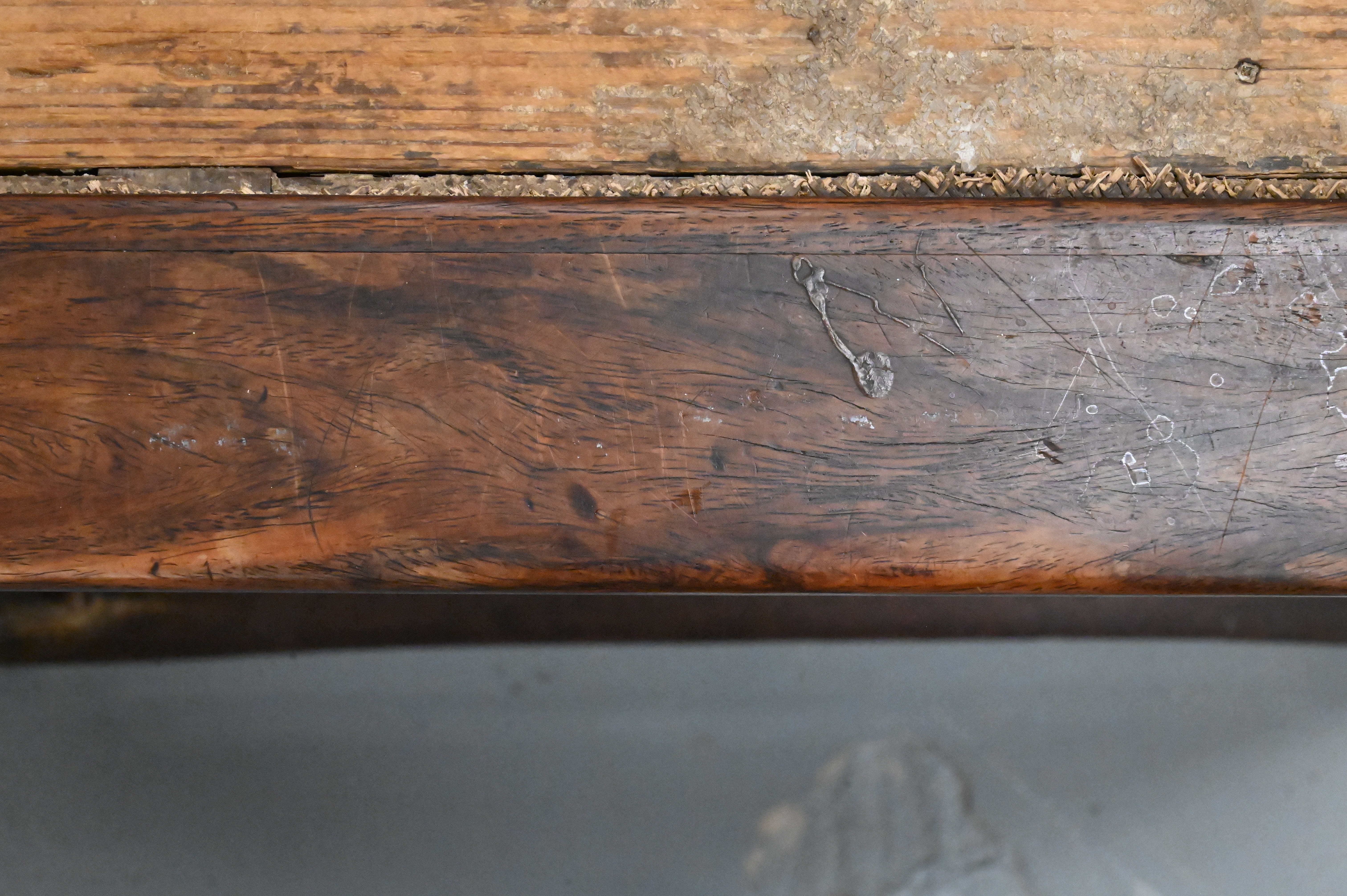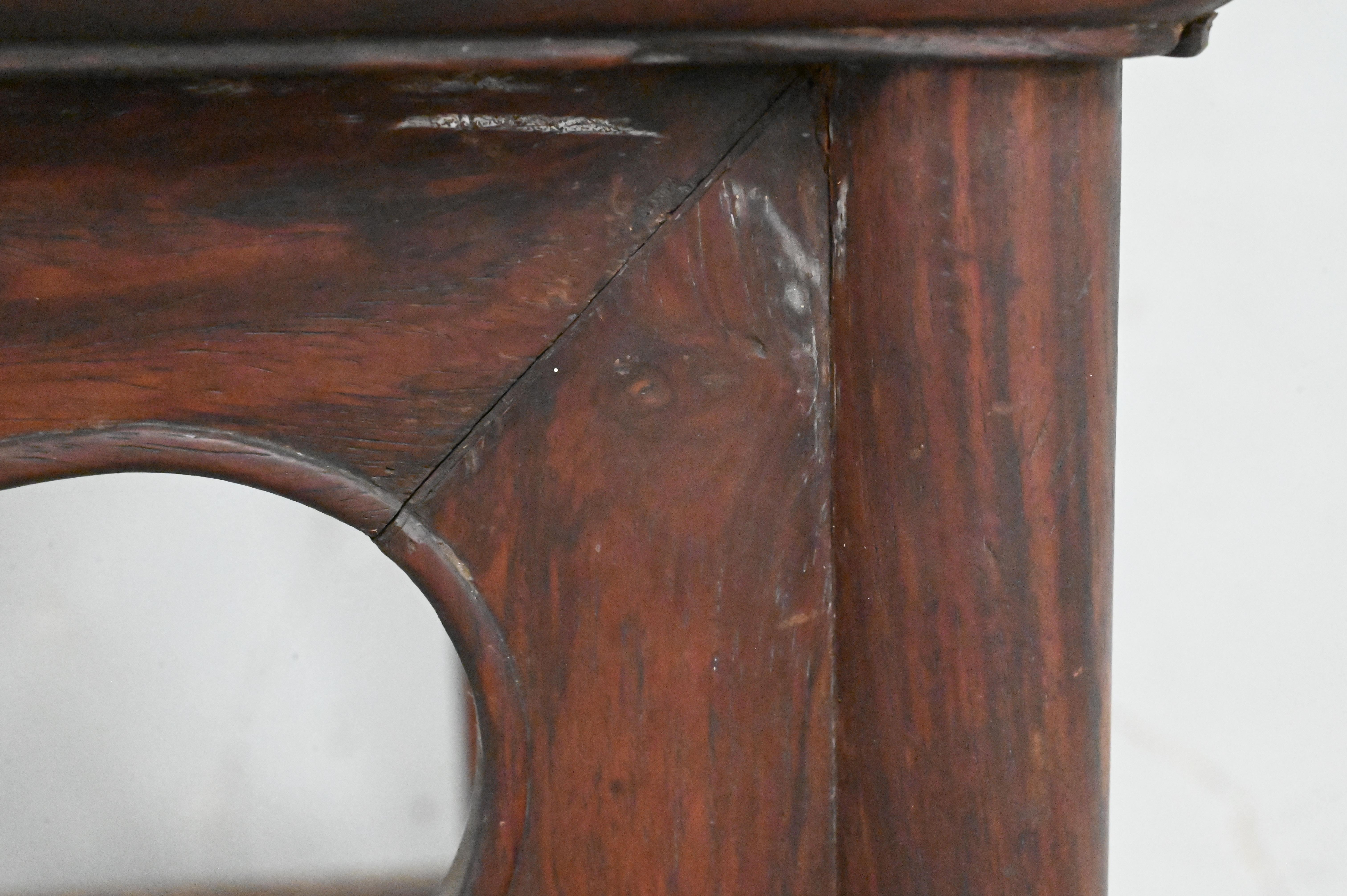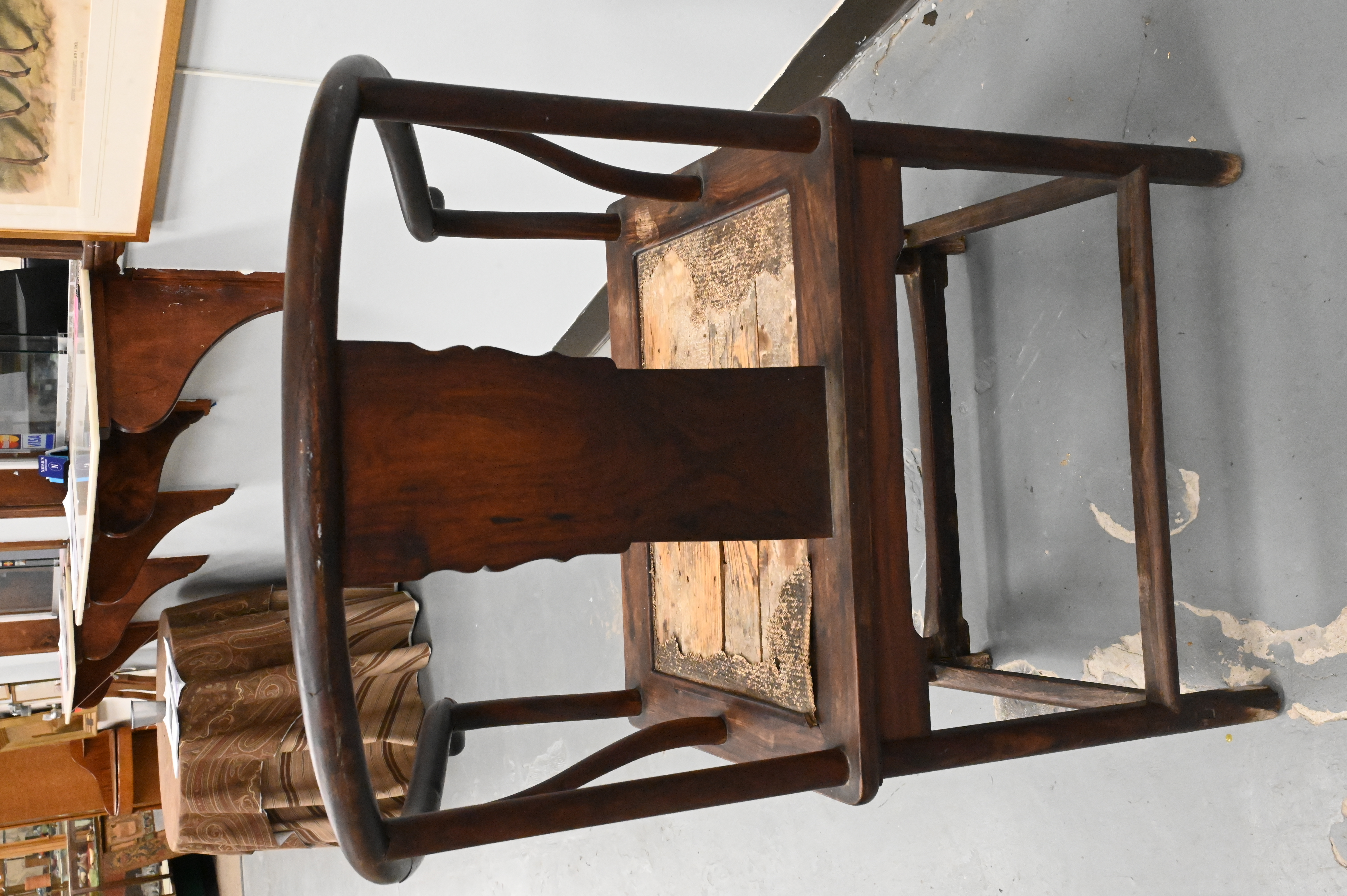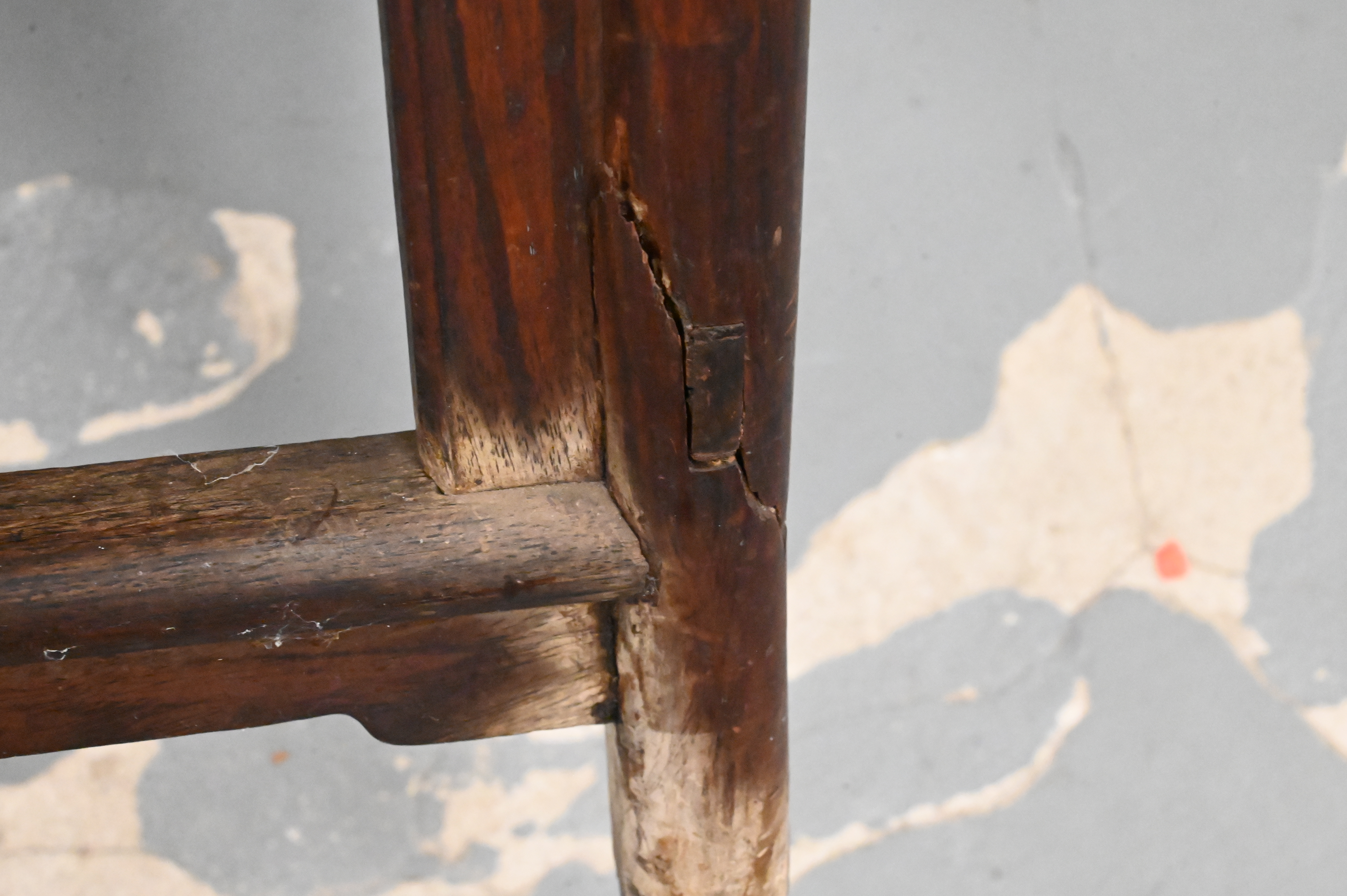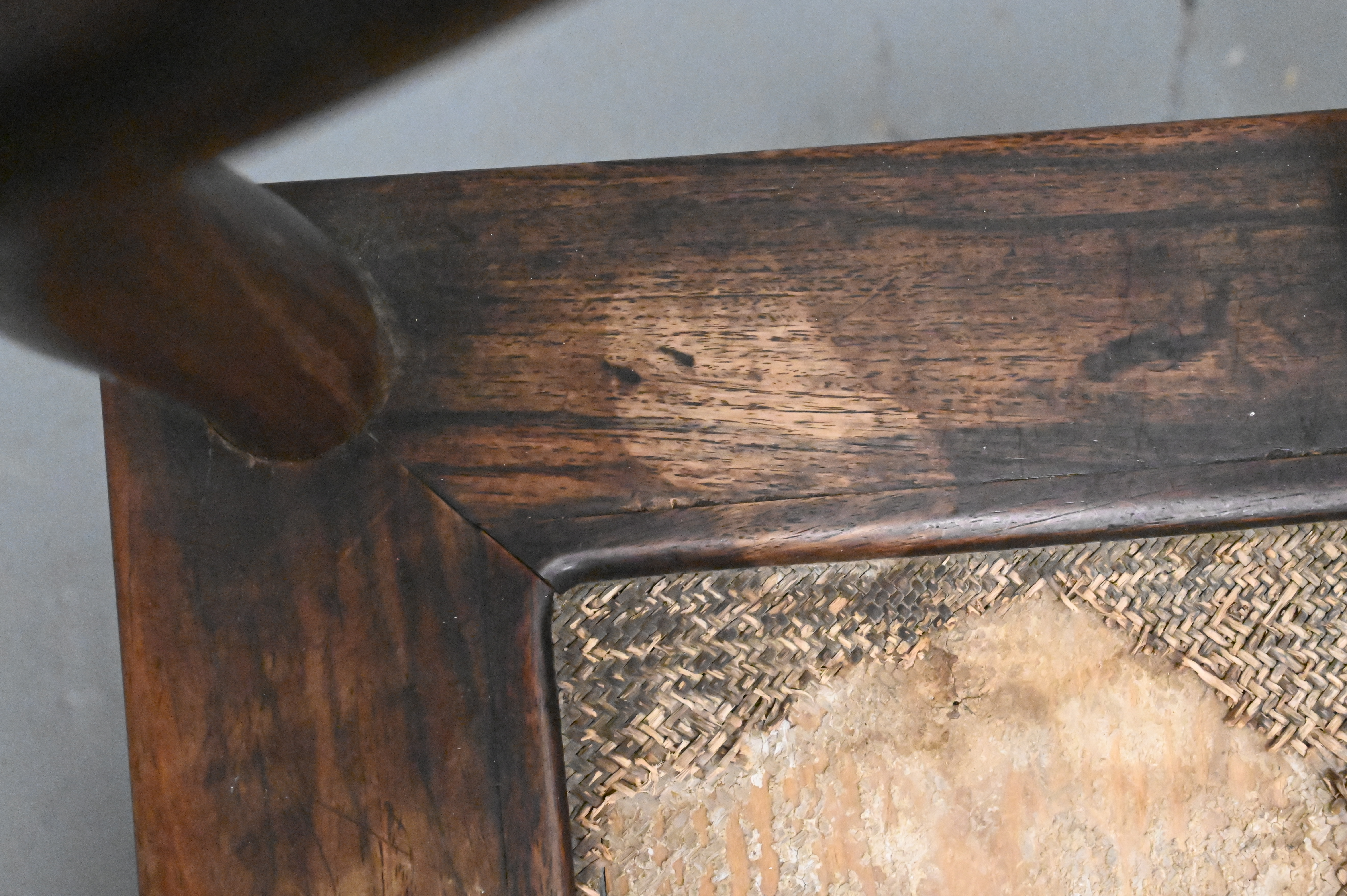 Condition: Split to left armrest and back left leg; woven seat lacking; a few small repairs; expected wear and patina consistent with age.