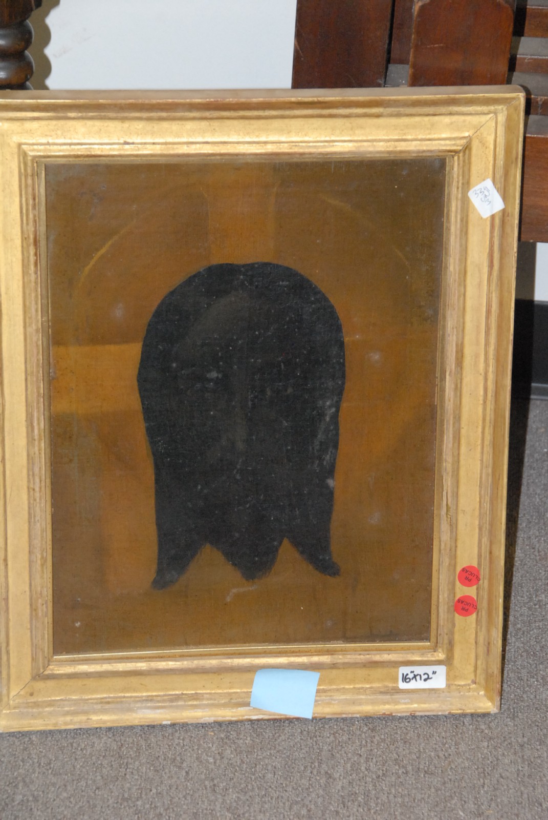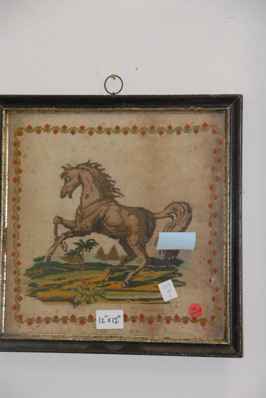 4 piece lot, horse needlework, 2 oil painting, federal style mirror
