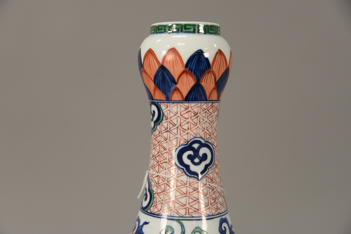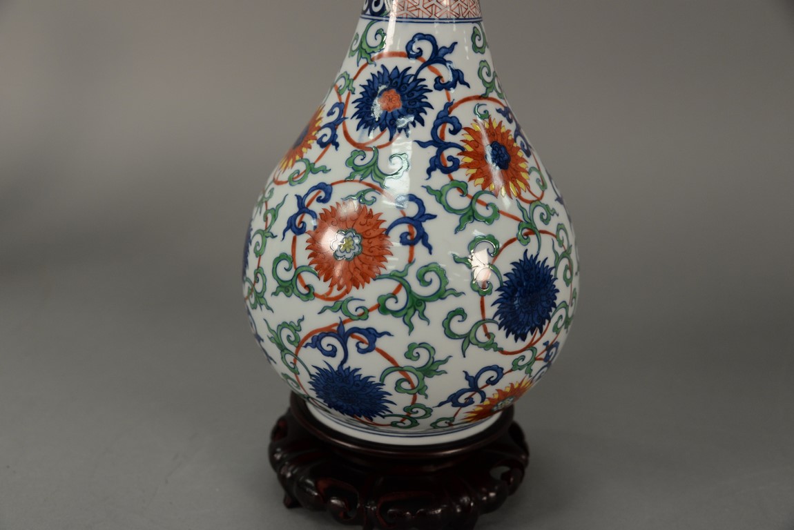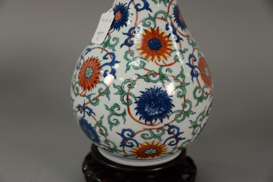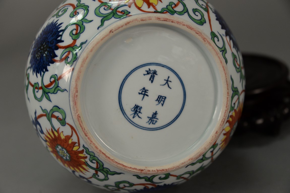 Lot 334: Chinese porcelain double gourd vase with painted blossoming flowers and scrolling vines having Jiajing mark on bottom, in fitted box, 19th – 20th century. vase ht. 13 in.