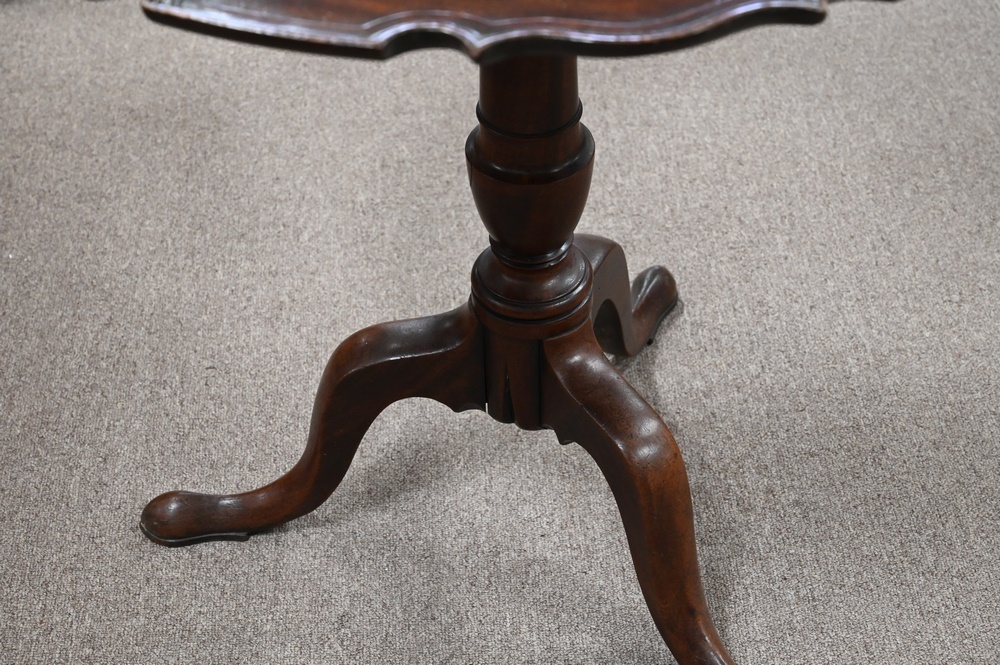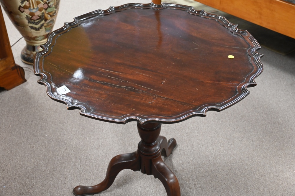 Chippendale Mahogany Tip Table, having pie crust top on urn turned shaft set on tripod base,
