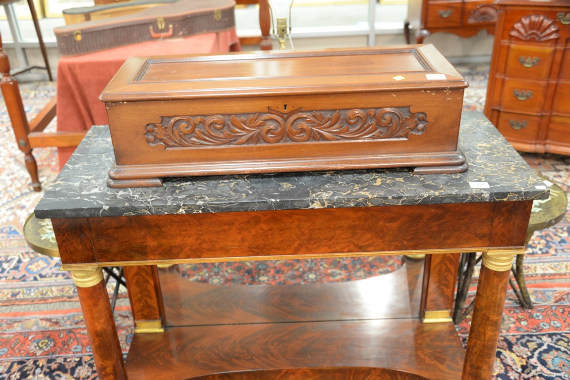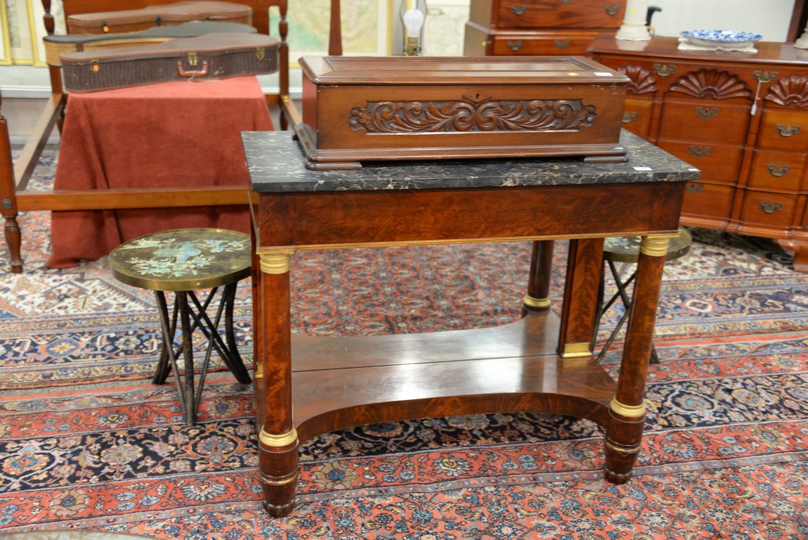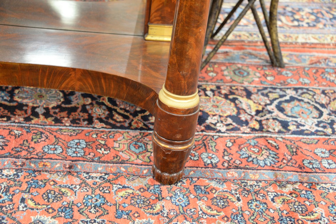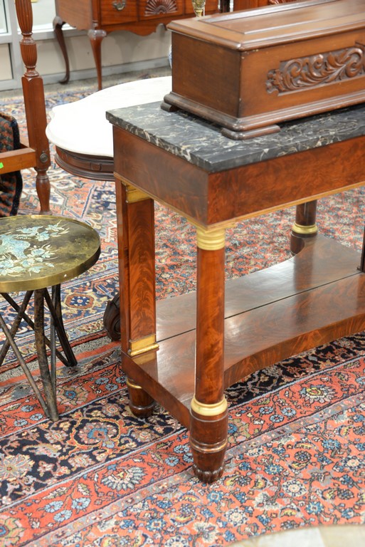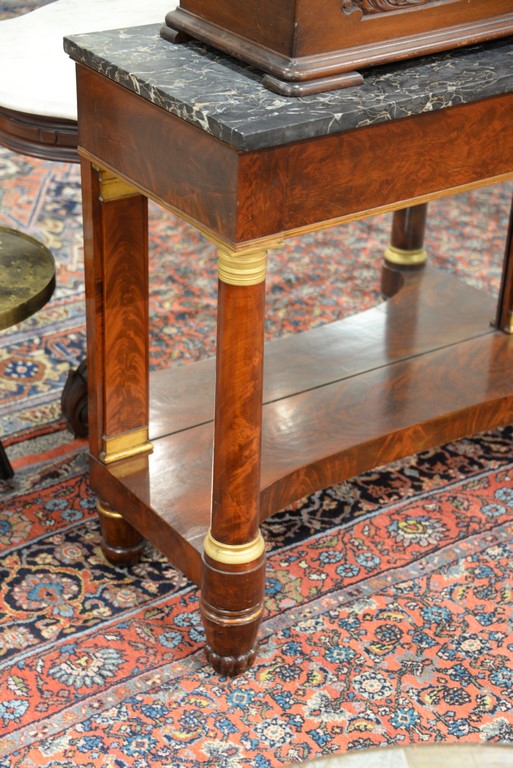 Lot 334: Classical mahogany pier table having grey marble top on base with gilt bronze mounted columns, mirror back with carved and turned fe…