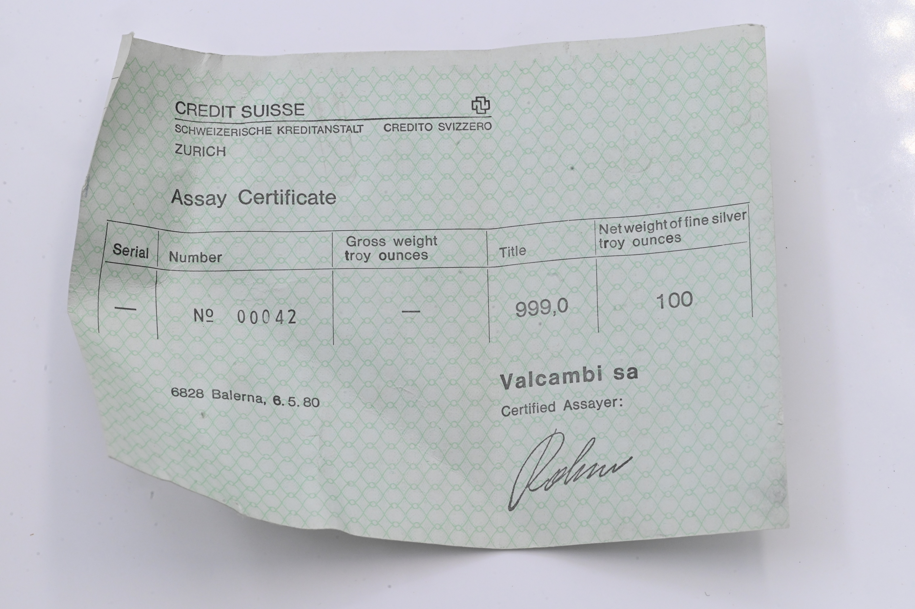 Lot 334: Credit Suisse 100 T.OZ Silver Bar