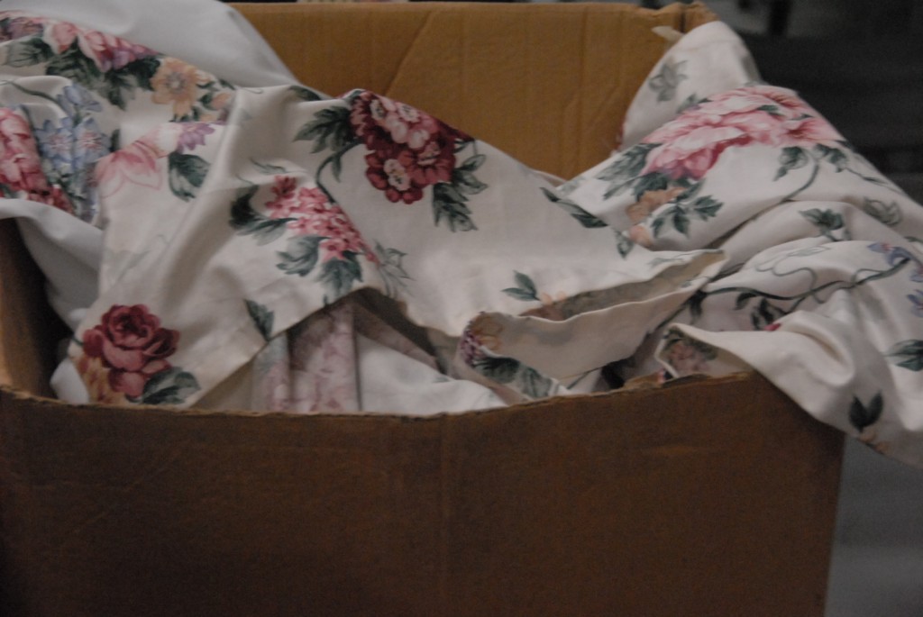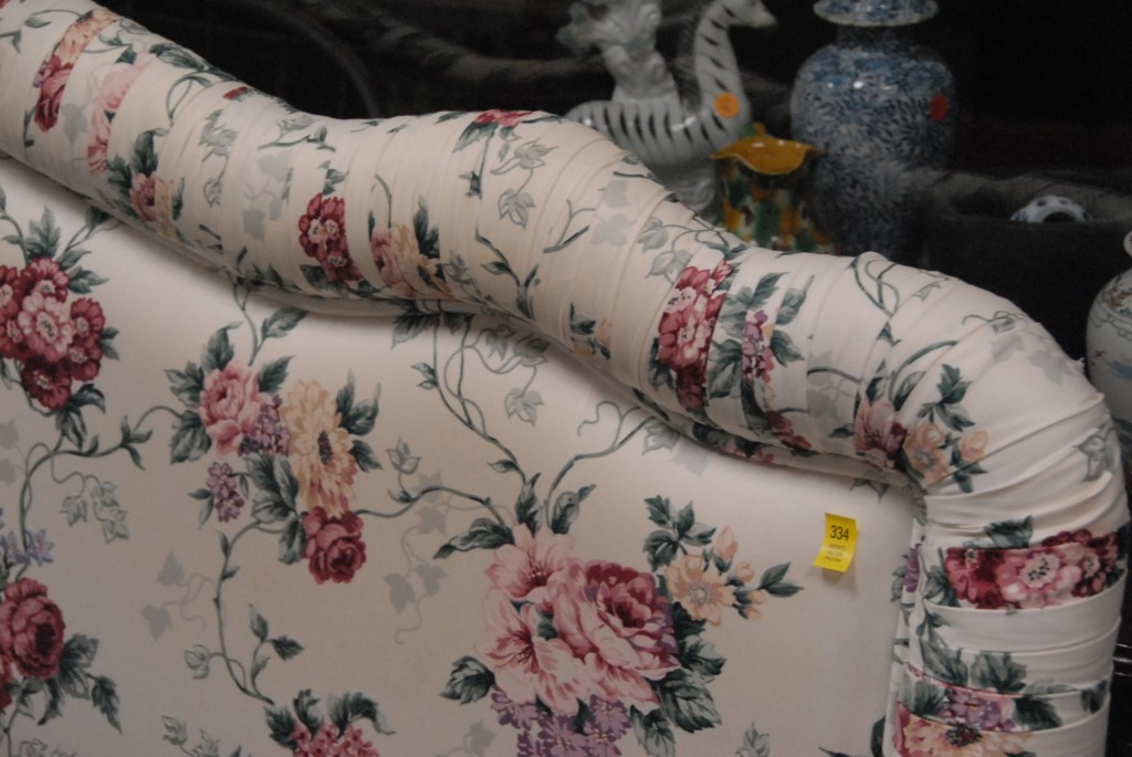 Custom upholstered headboard and two matching skirts for twin beds.
