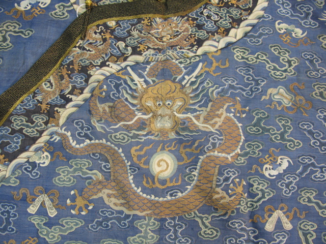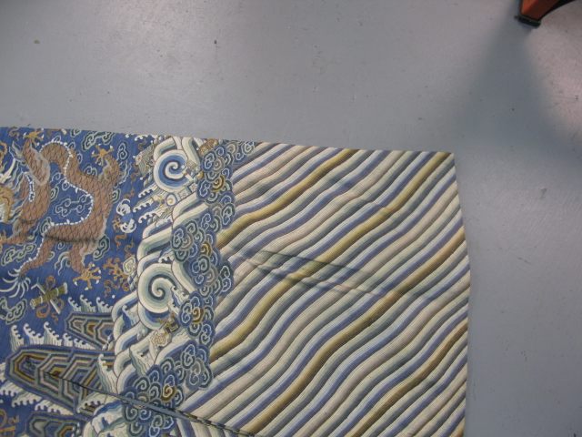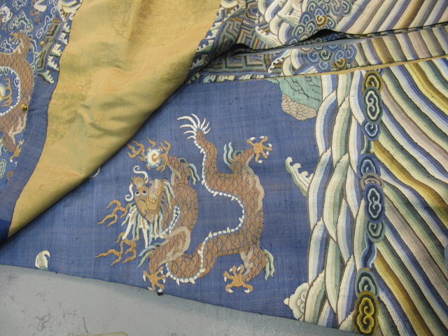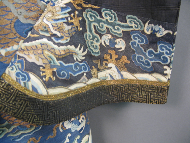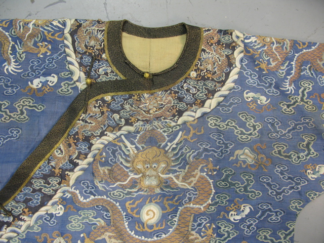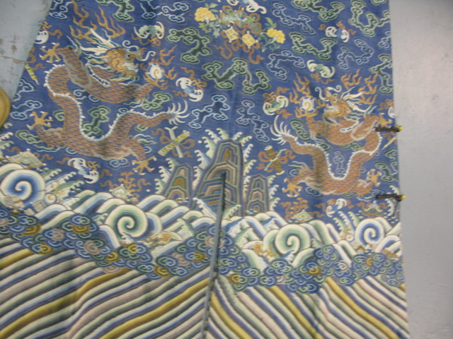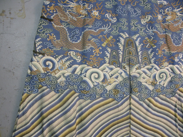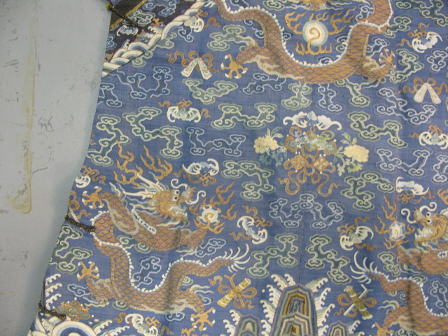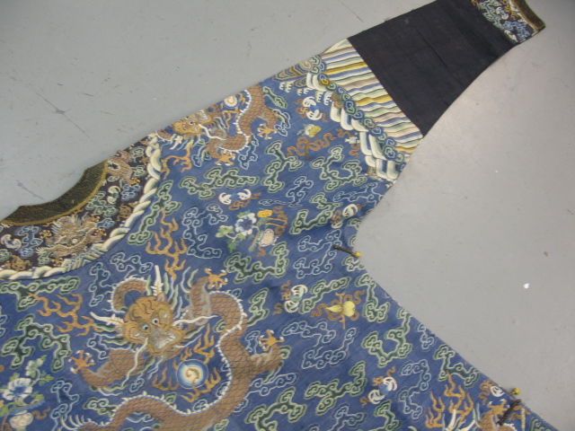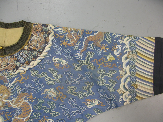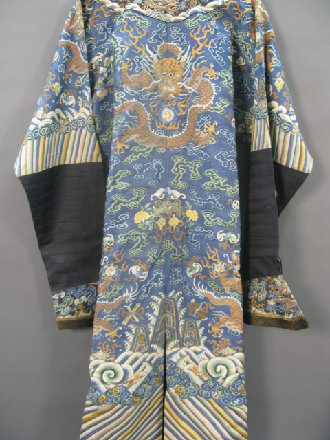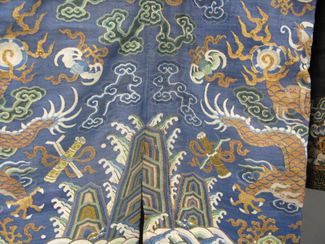 Embroidered blue silk dragon robe having nine five-claw dragons with couched gold-wrapped threads leaping amidst clouds, bats and other auspicious emblems, all above a hem of crusting waves with other auspicious objects and the lishui stripe.