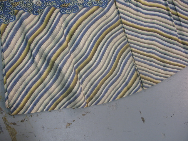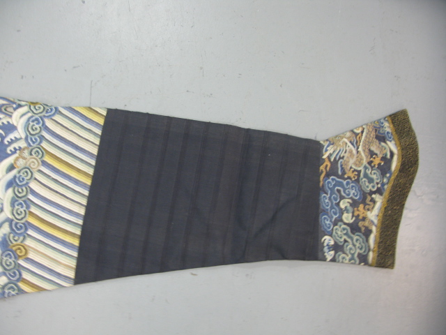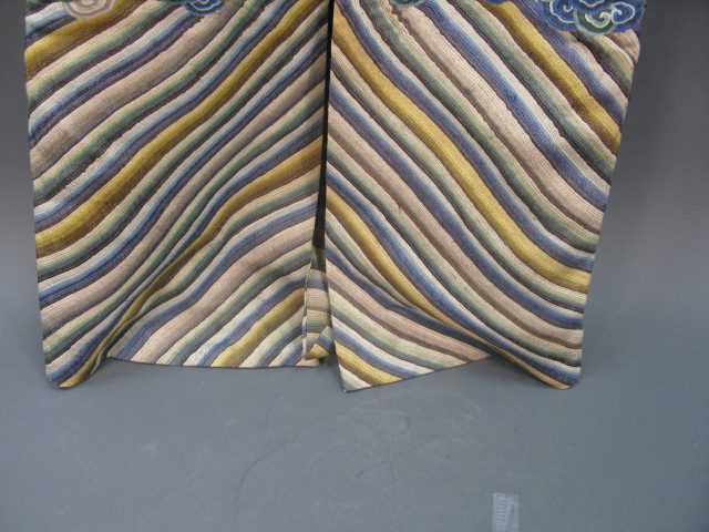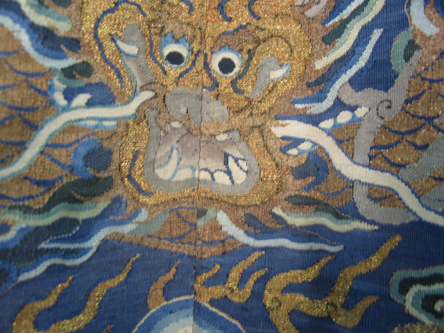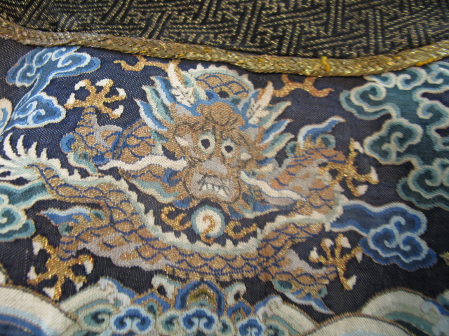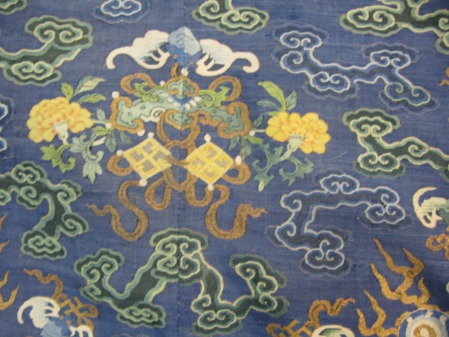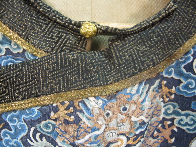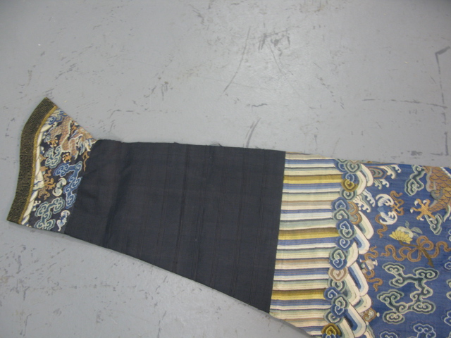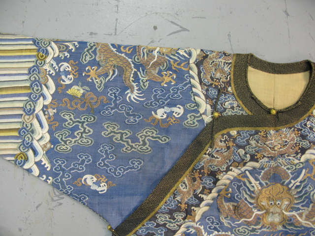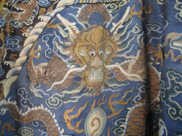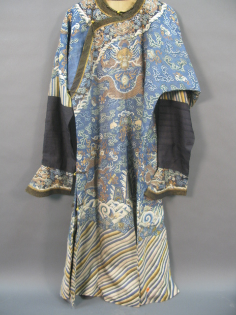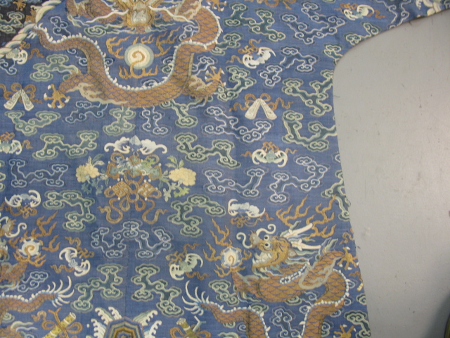Embroidered blue silk dragon robe having nine five-claw dragons with couched gold-wrapped threads leaping amidst clouds, bats and other auspicious emblems, all above a hem of crusting waves with other auspicious objects and the lishui stripe.