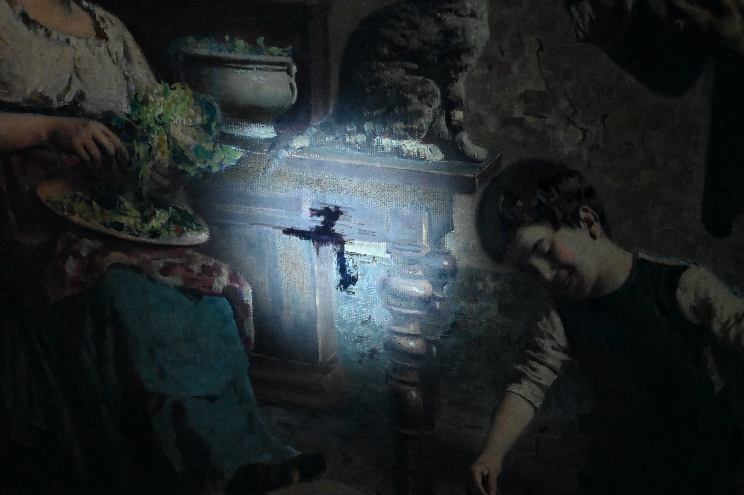 Black light: heavy varnish, patches, inpainting throughout, edgeware, see photos