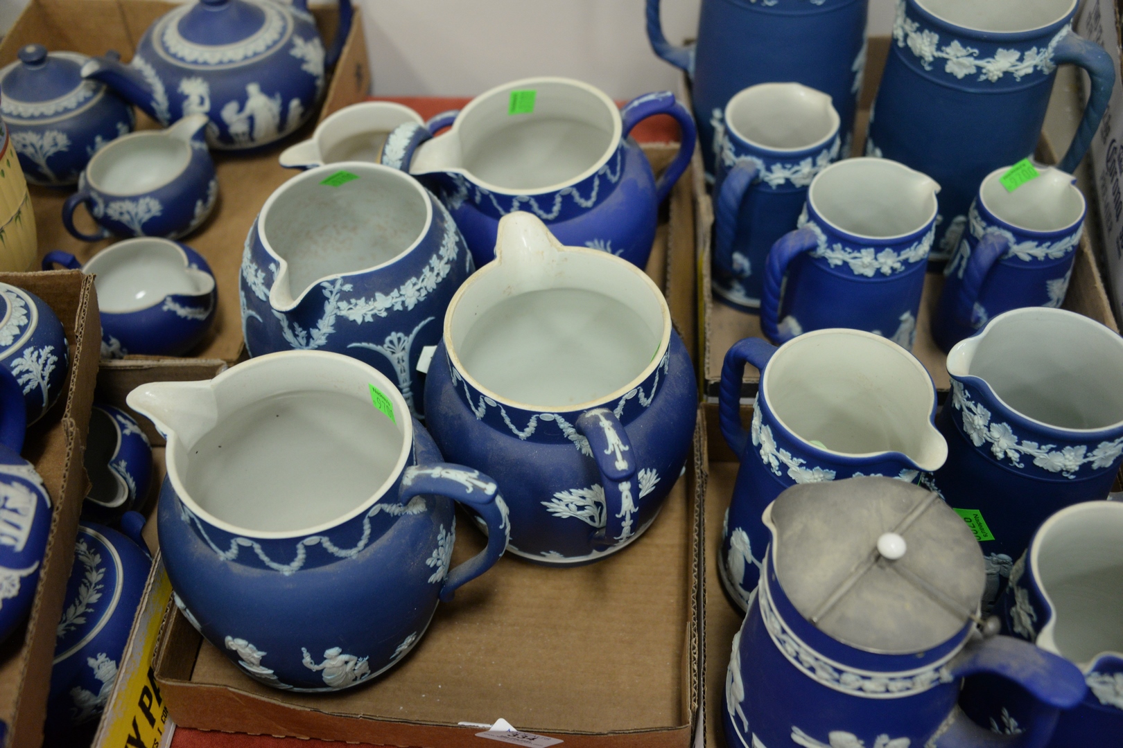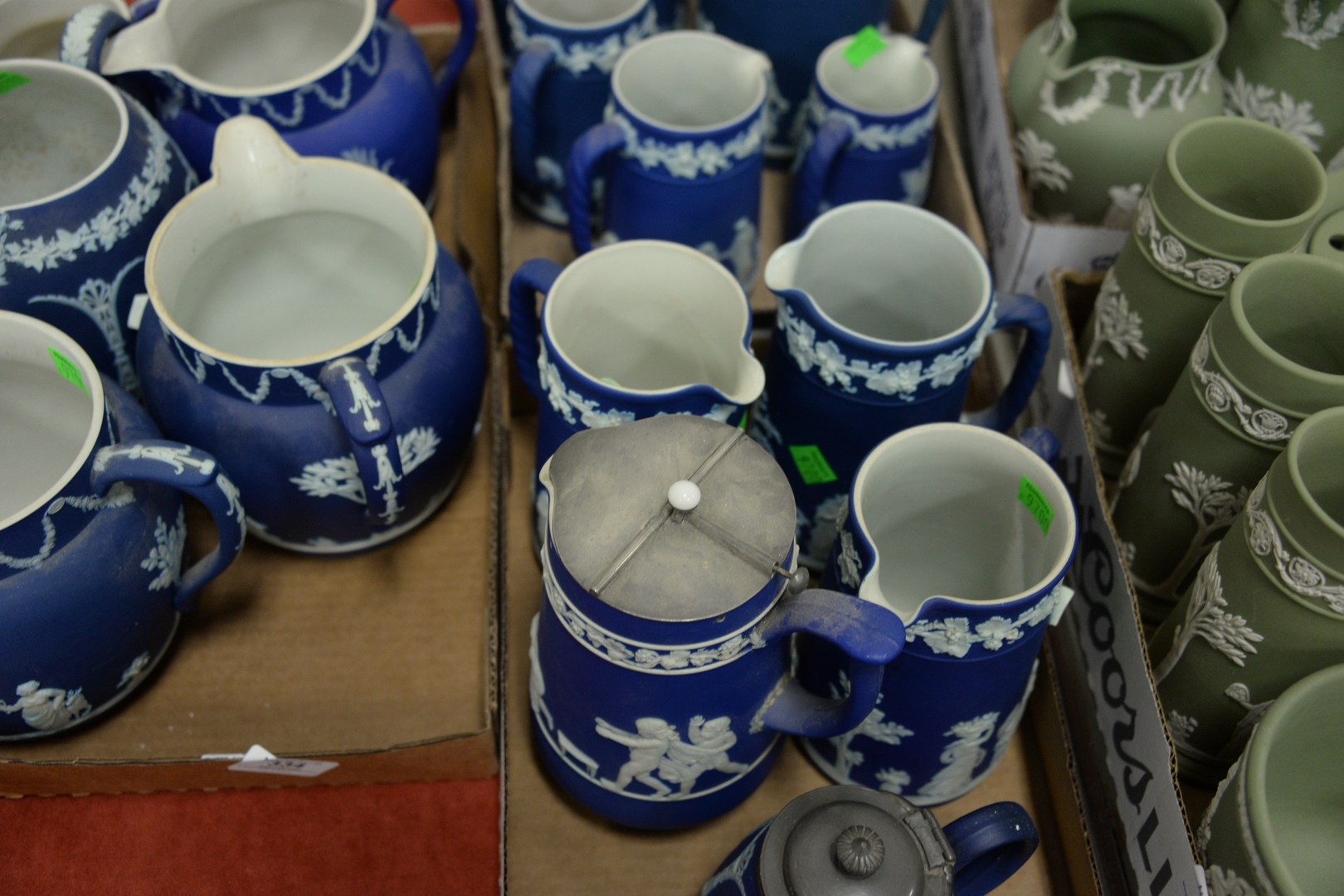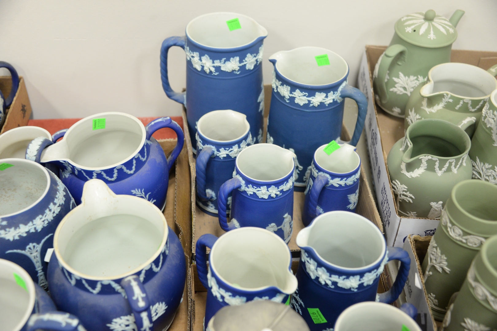 Lot 334: Fifteen Blue Wedgwood Jasperware Pitchers, having classical figures, two marked 1636, tallest pitcher 8 1/4 inches.