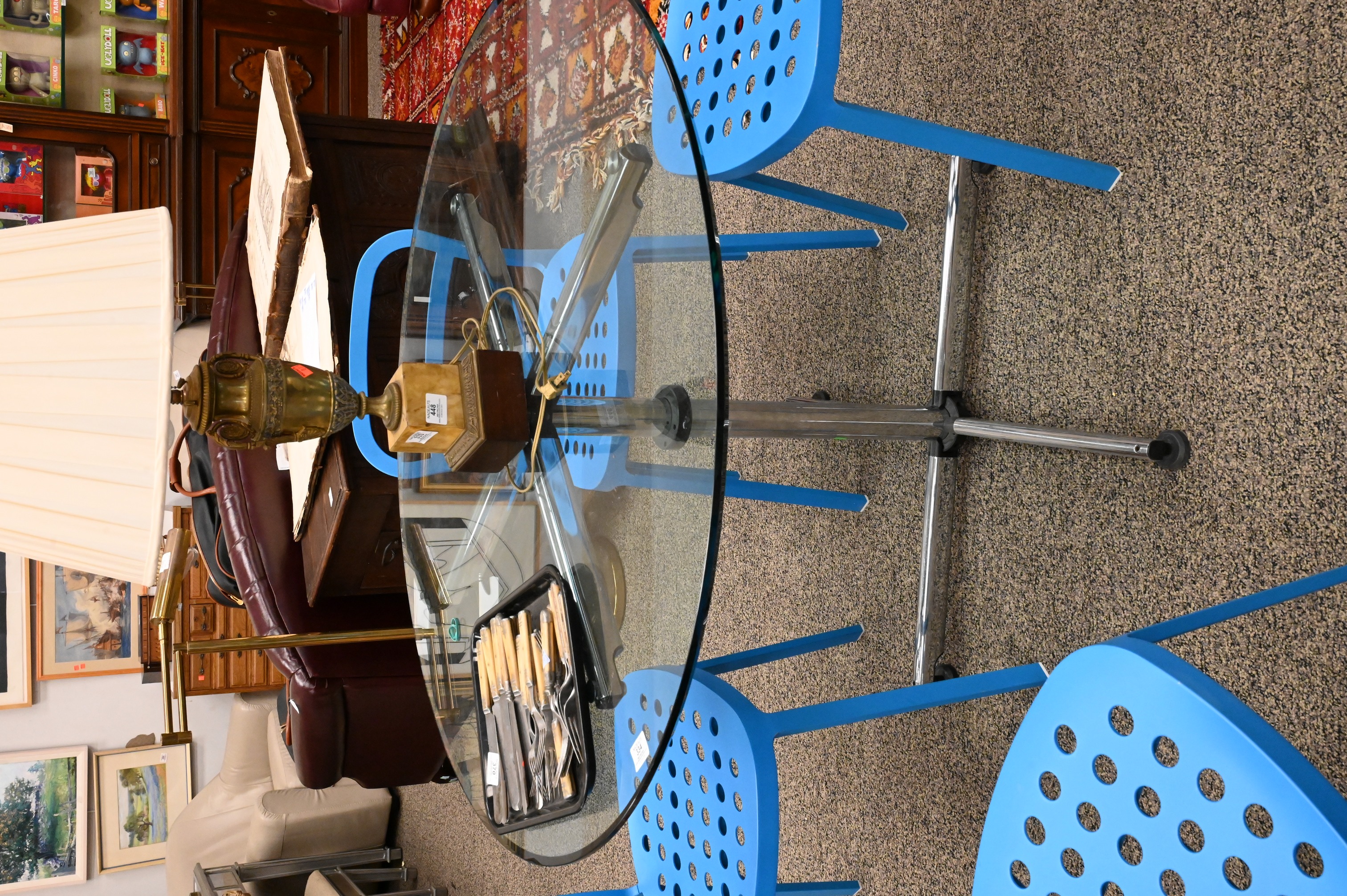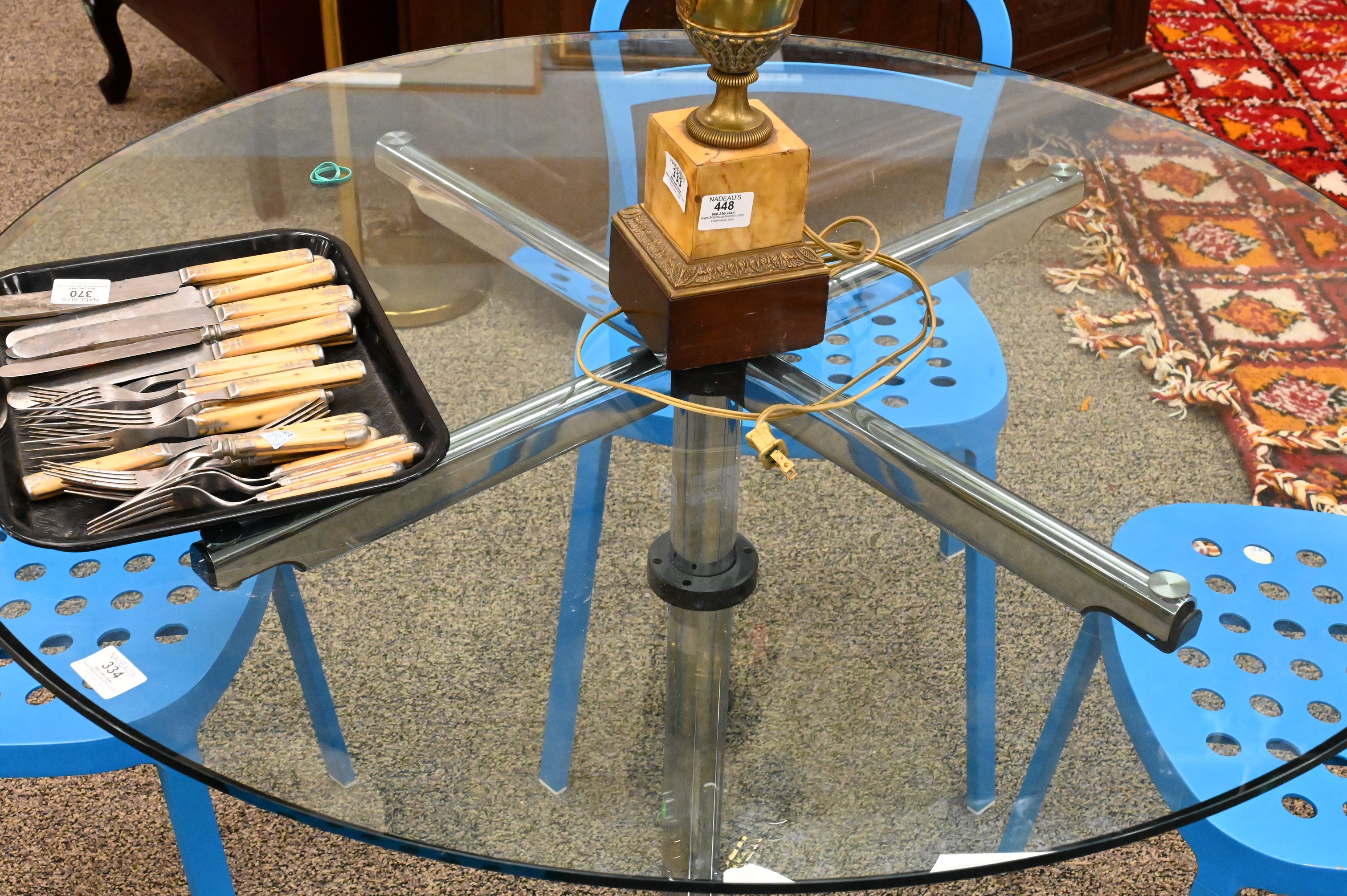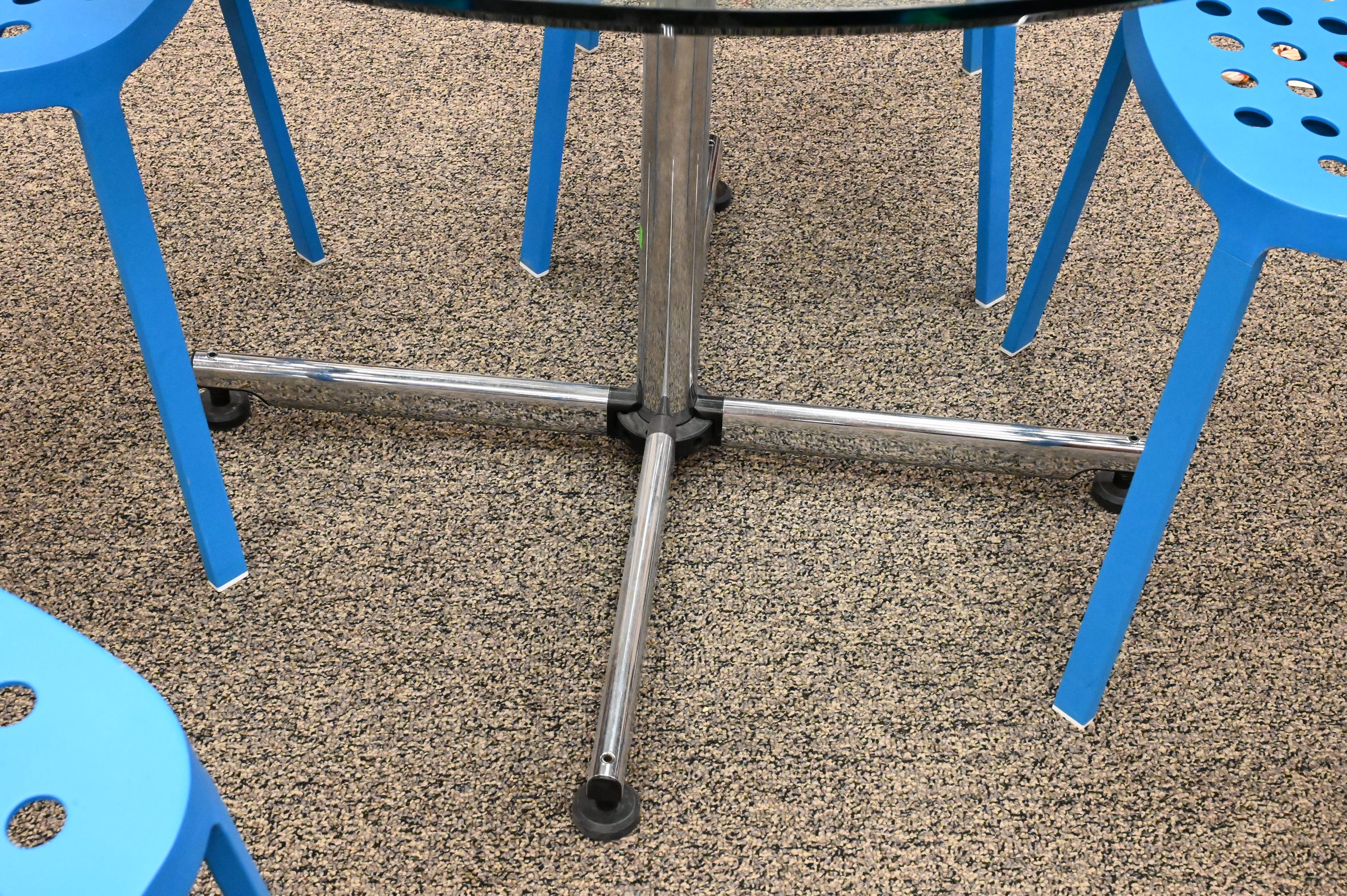 round glass top pedestal table with steel column base