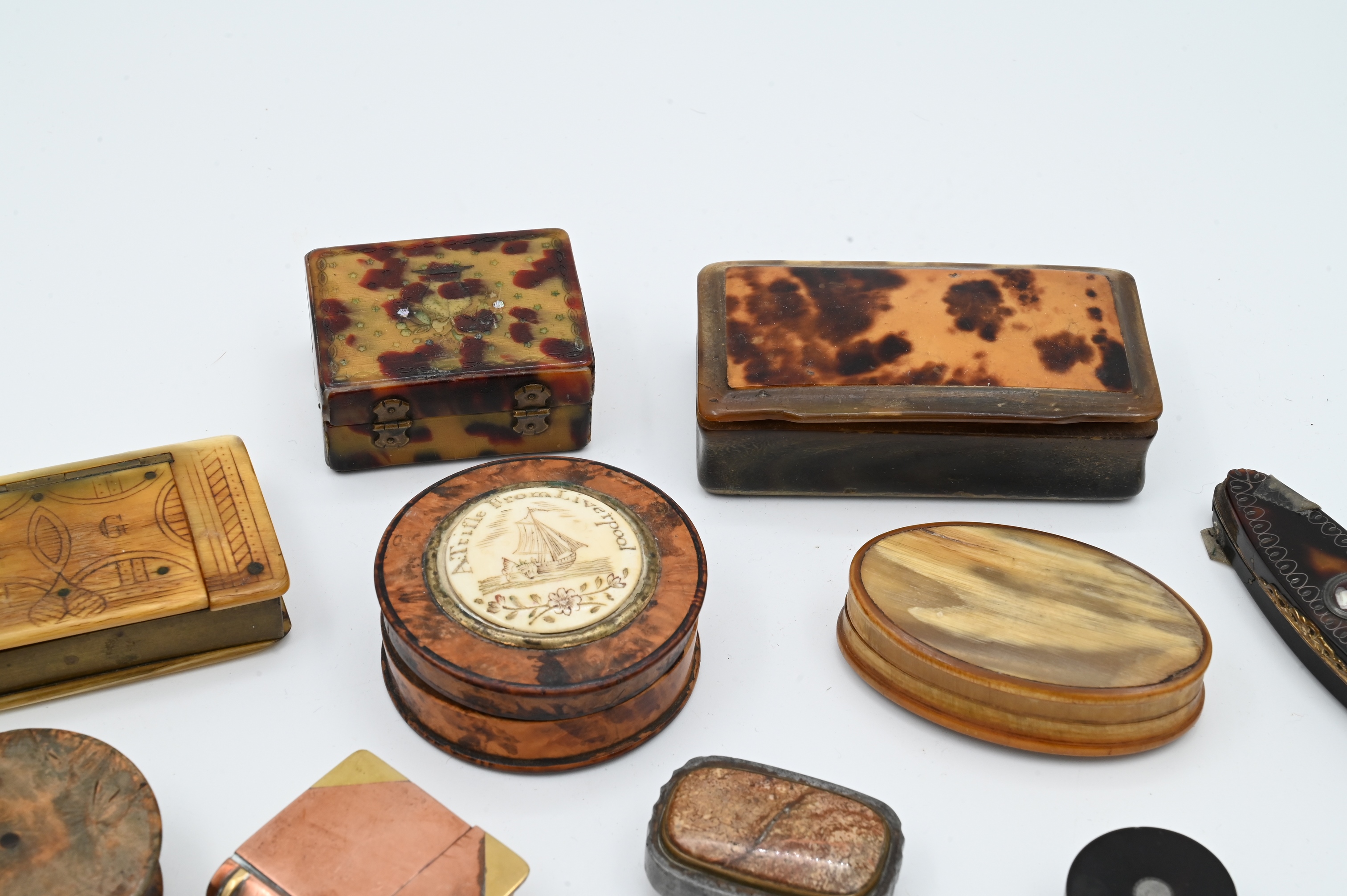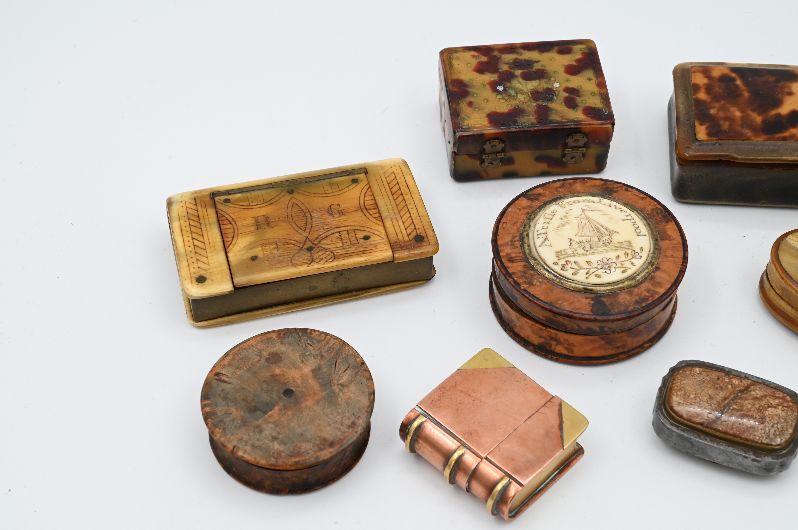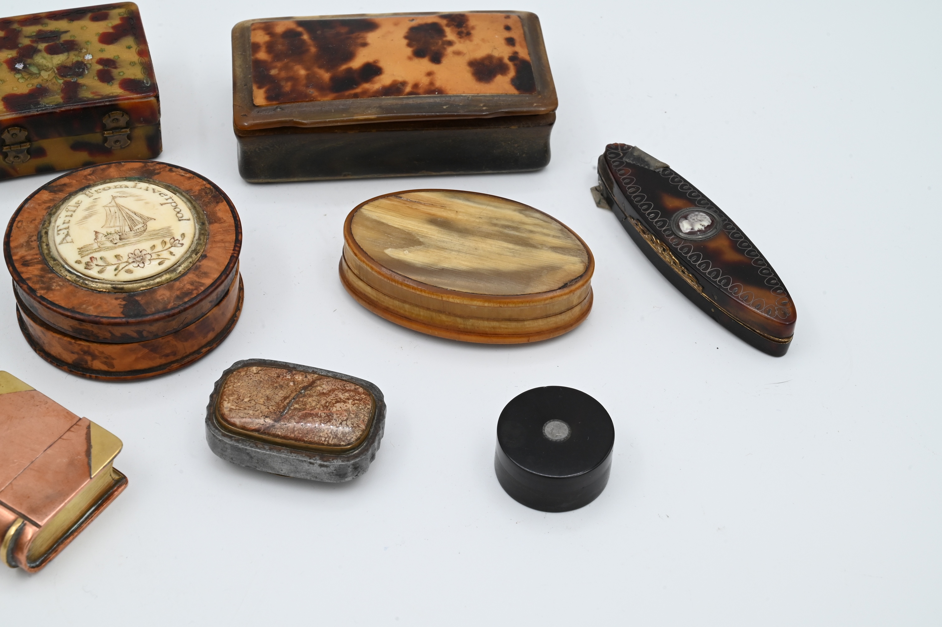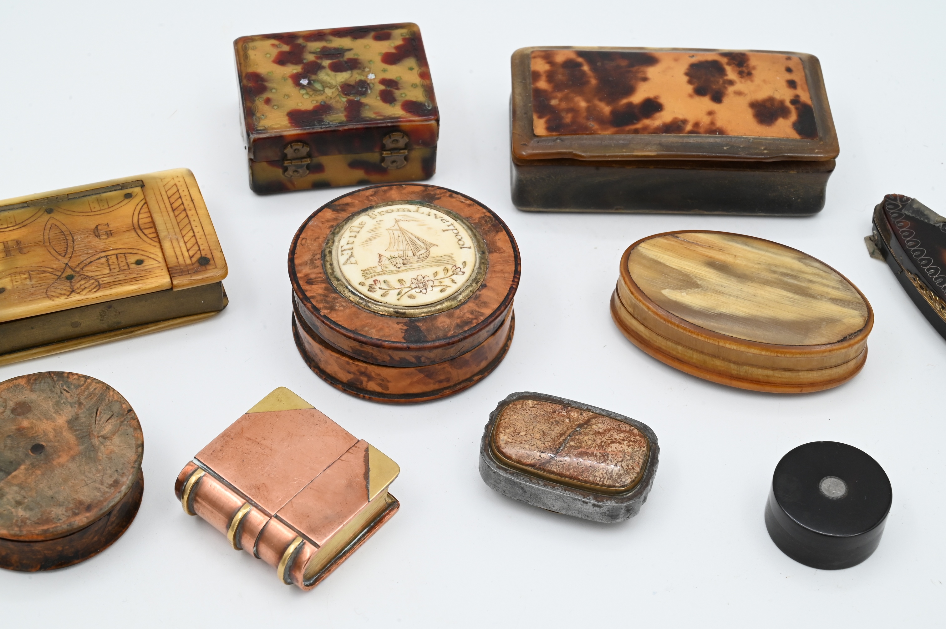 brass and copper book form, horn boxes, stamp box, tortoise shell, etcetera