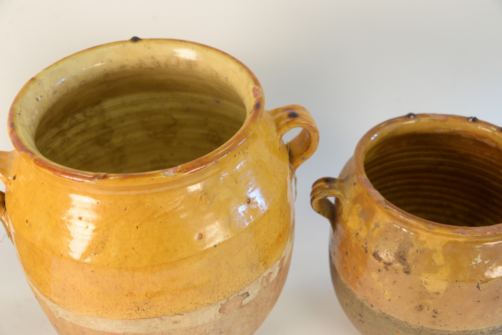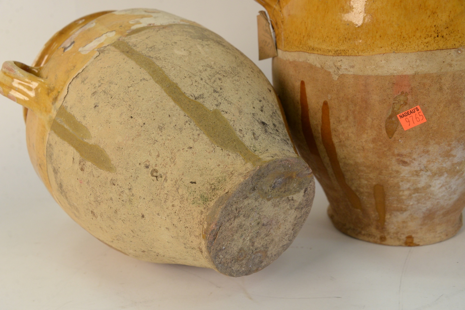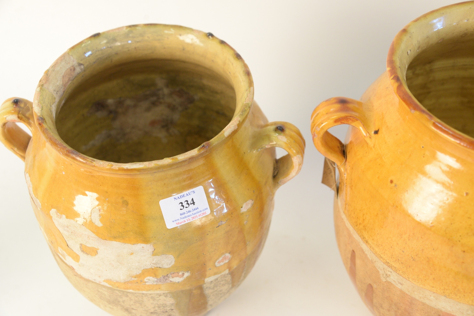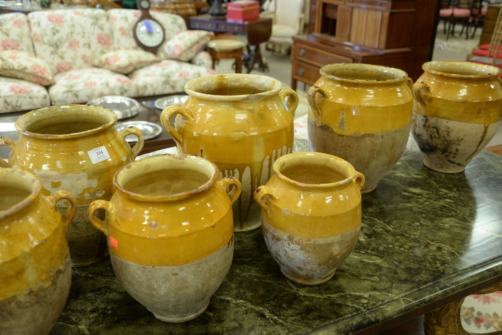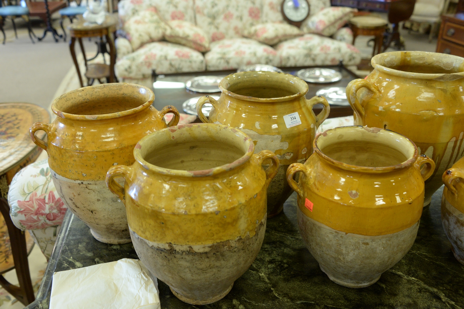 Lot 334: Group of Ten French Earthenware Glazed Confit Jars, with handles in mustard yellow drip glaze, height 13 1/2 inches.