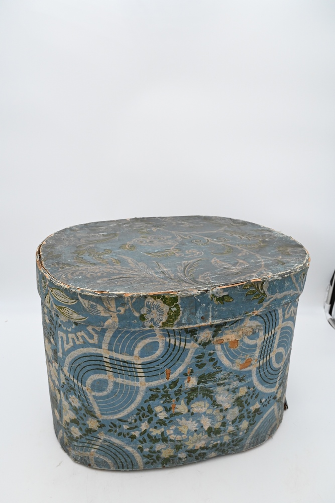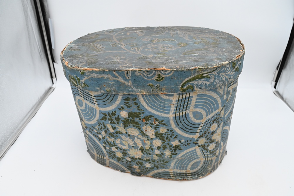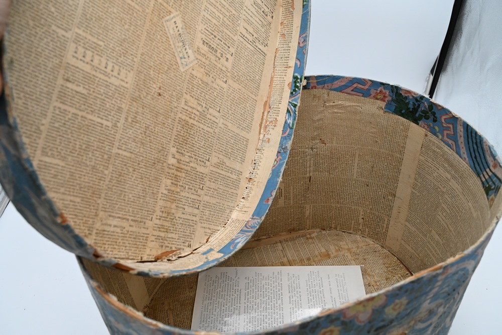 Lot 334: Hannah Davis Large Wallpaper Covered Hat Band Box bentwood covered with blue wallpaper having scrolling vines and flowers with newspaper lining paper label on inside “Warranted nailed hard-boxes made by Hannah Davis, Jaffrey, N.H.”