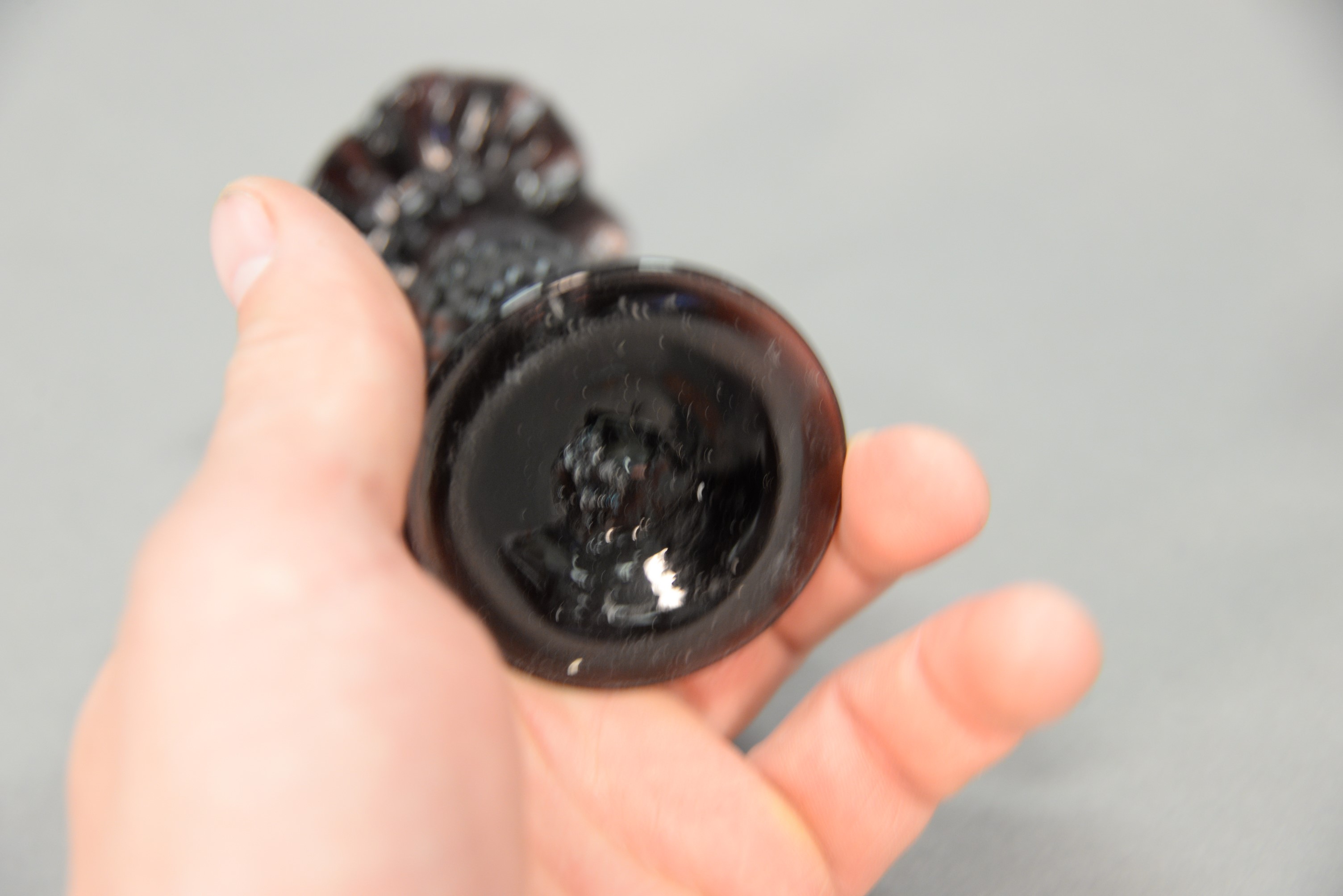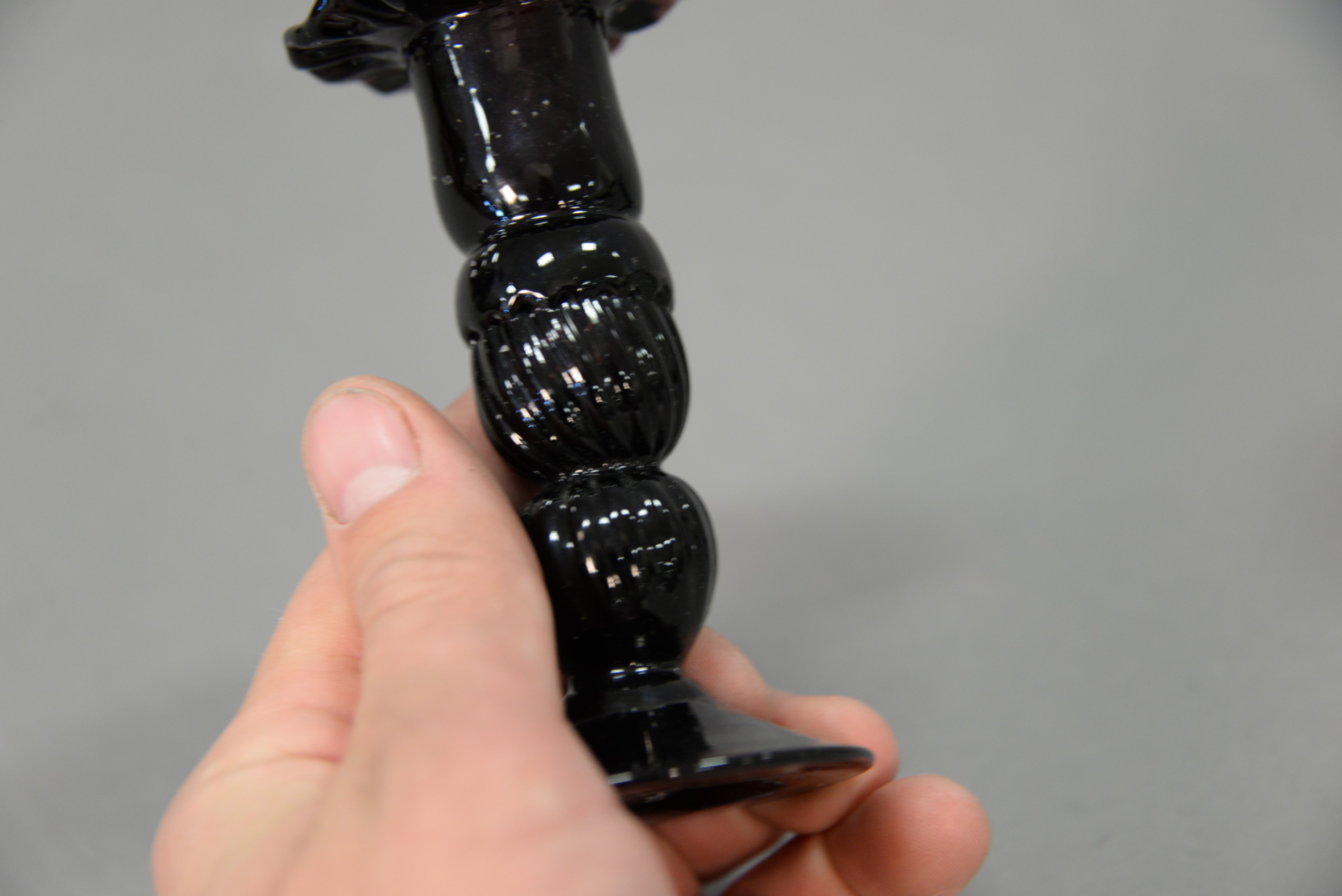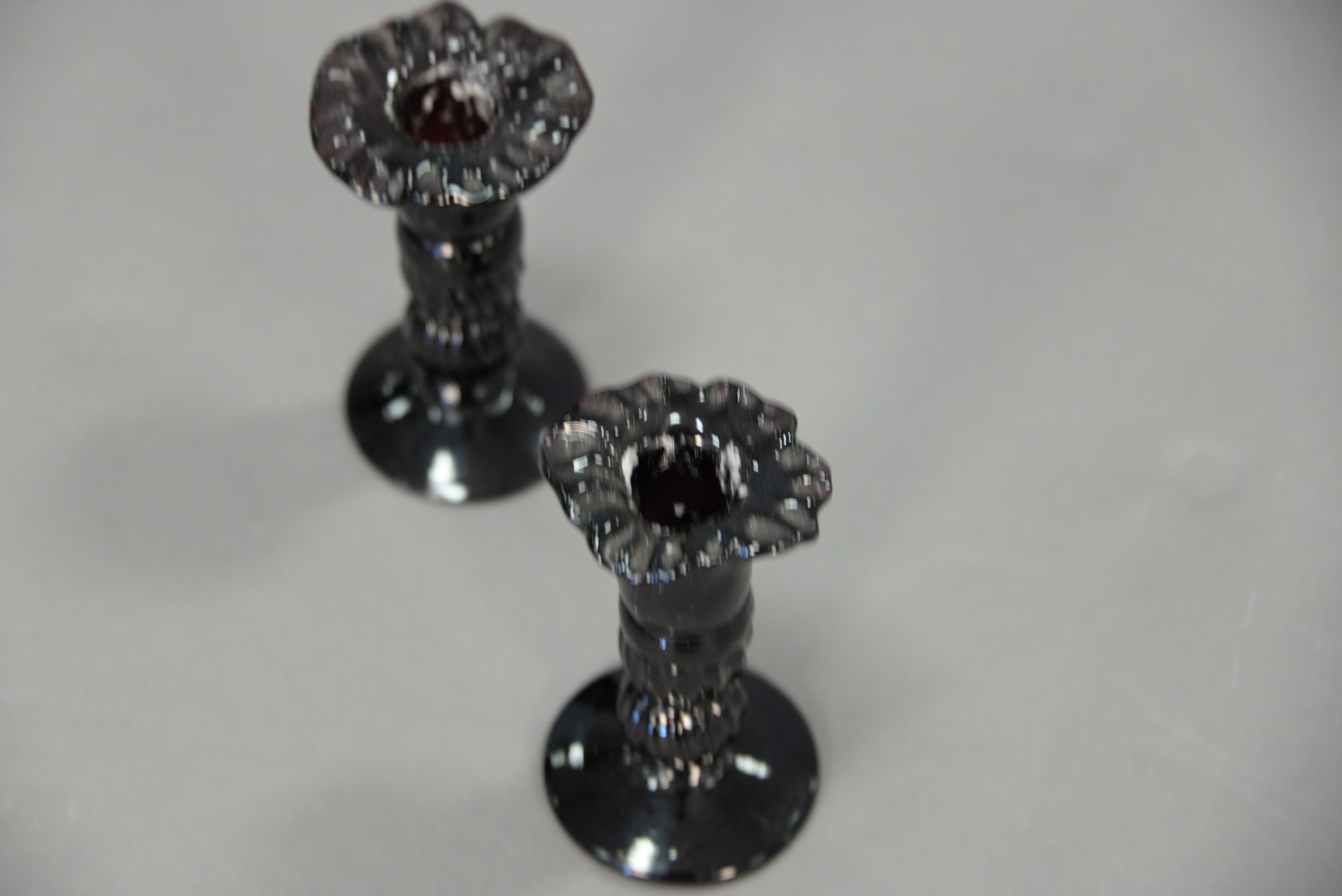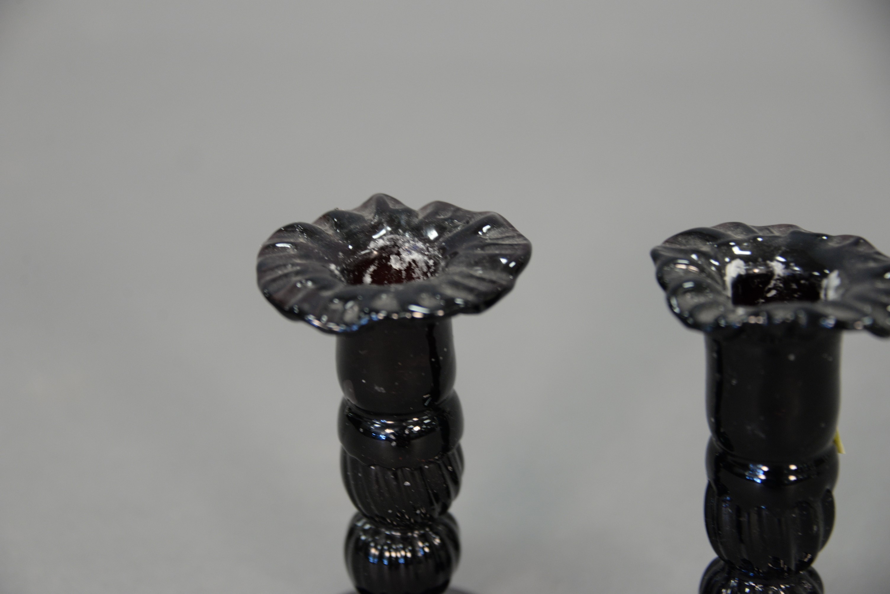 Pair of amethyst candlesticks with ruffled tops, probably 19th century. ht. 4 1/4 in.