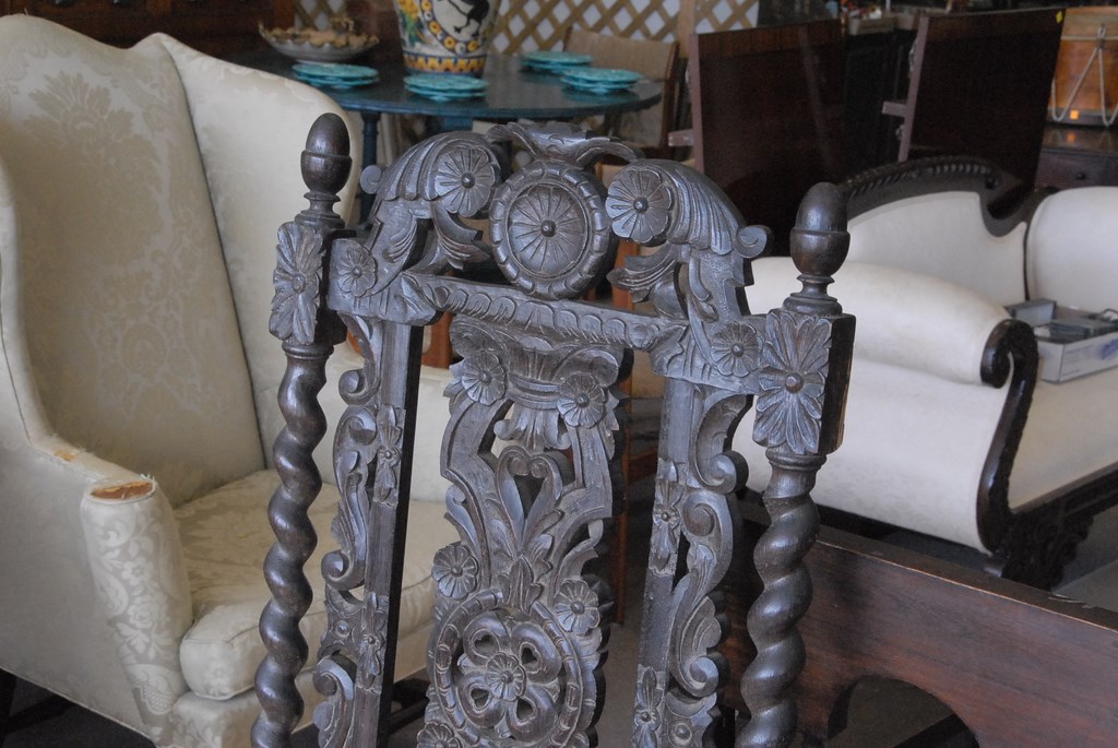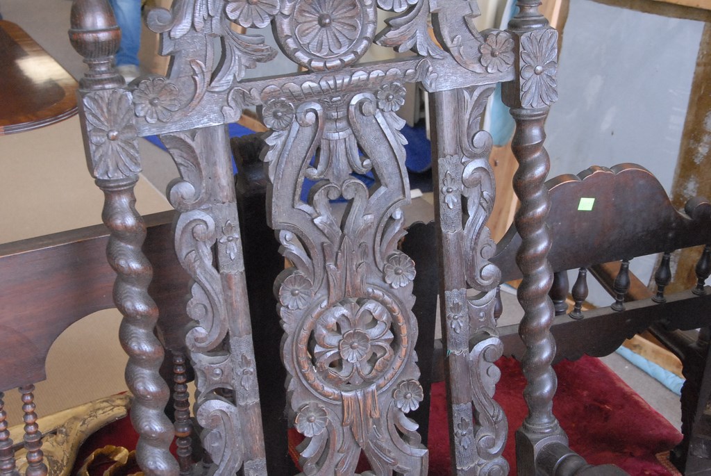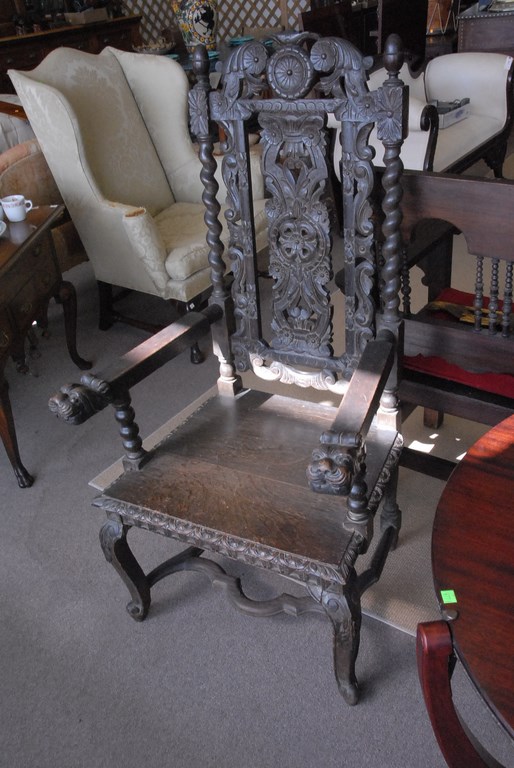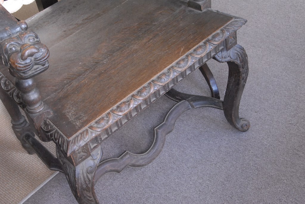 Pair of carved oak armchairs with lion carved hand rests, seat ht. 19in. total ht. 53in.