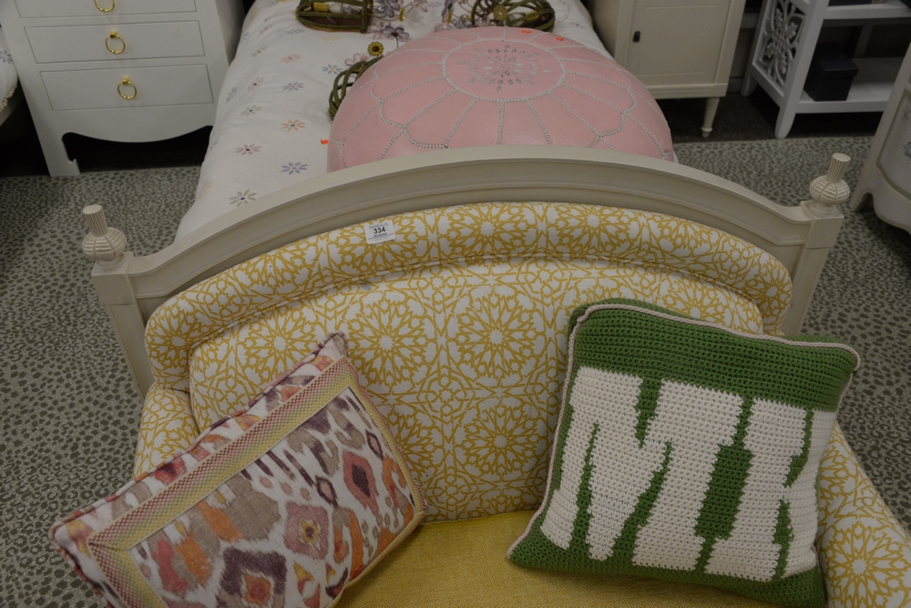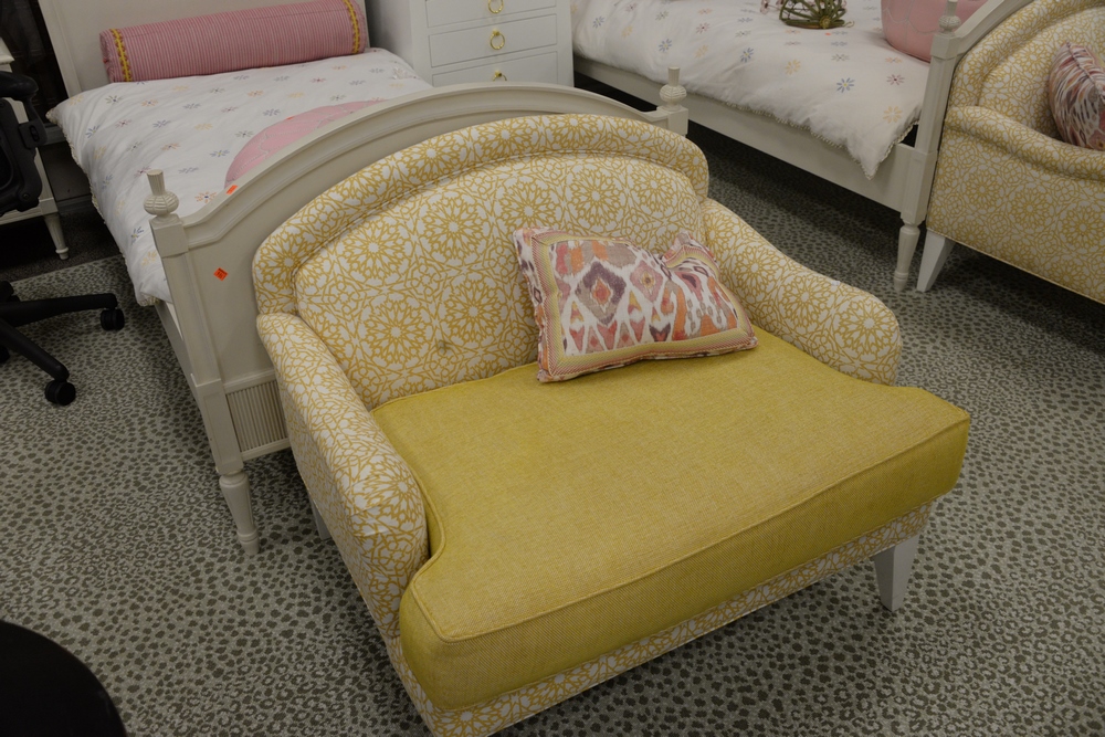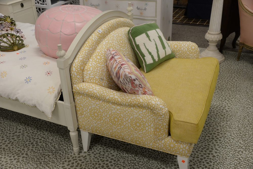 Lot 334: Pair of Custom Yellow Upholstered Chair and a Half, having white square tapered legs, height 32 1/2 inches, width 40 inches, Provena…