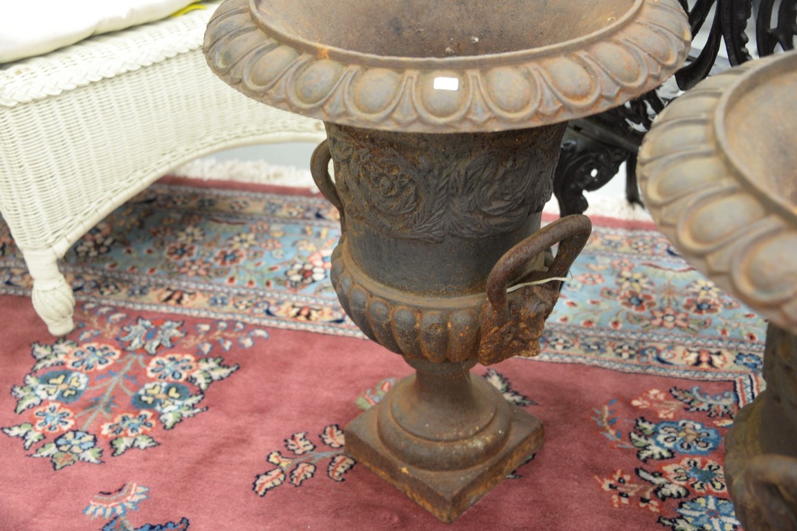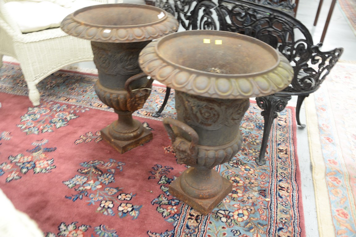 Pair of iron urns, 24in.
