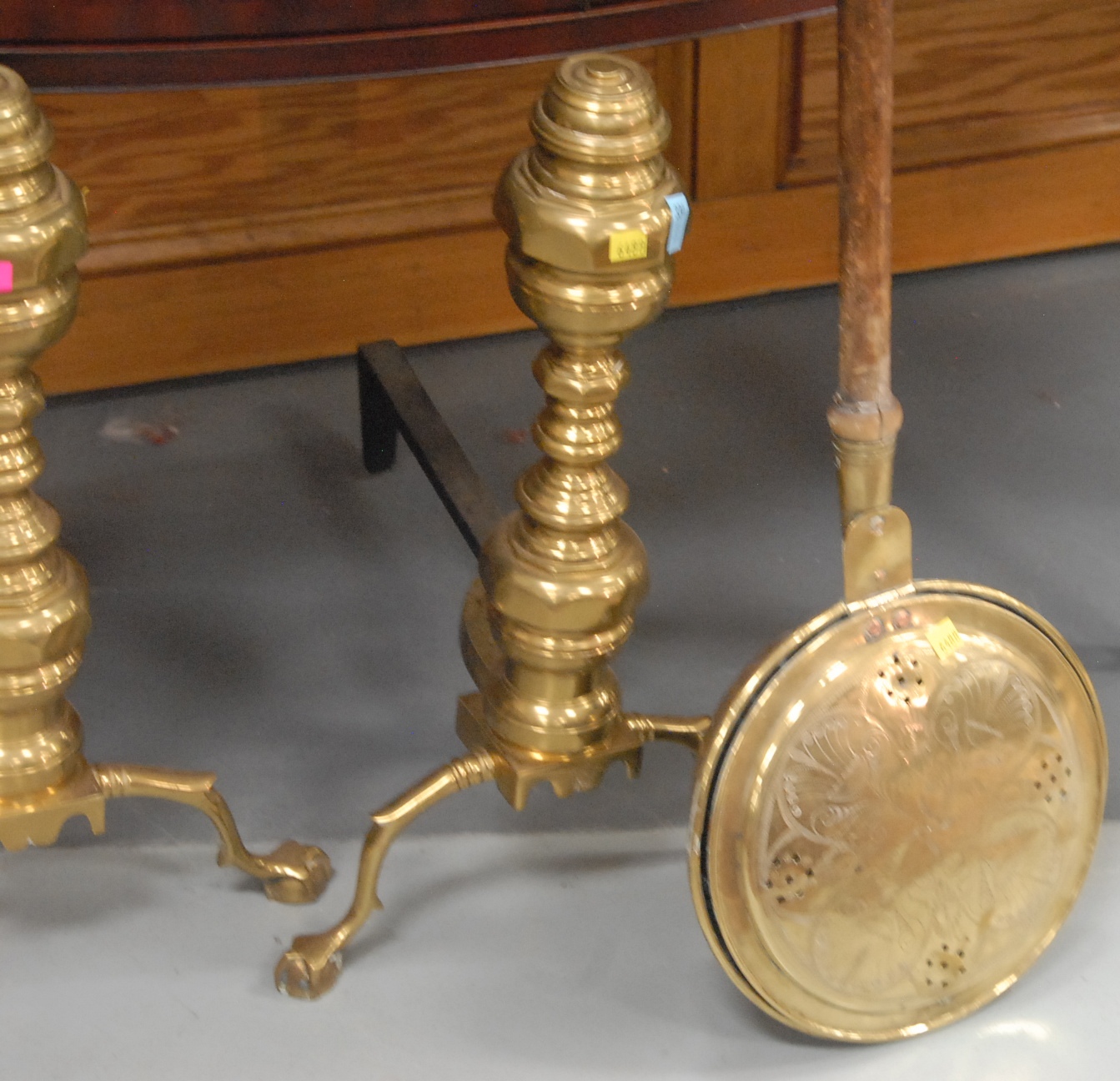 Lot 334: Pair of large brass andirons, brass top tools, and brass bed warmer