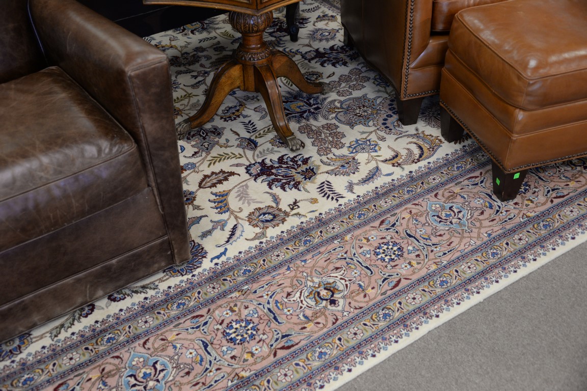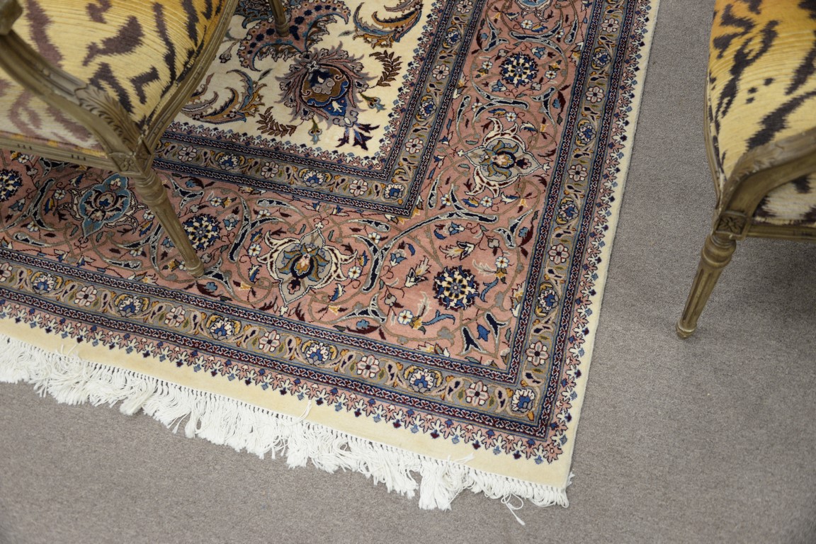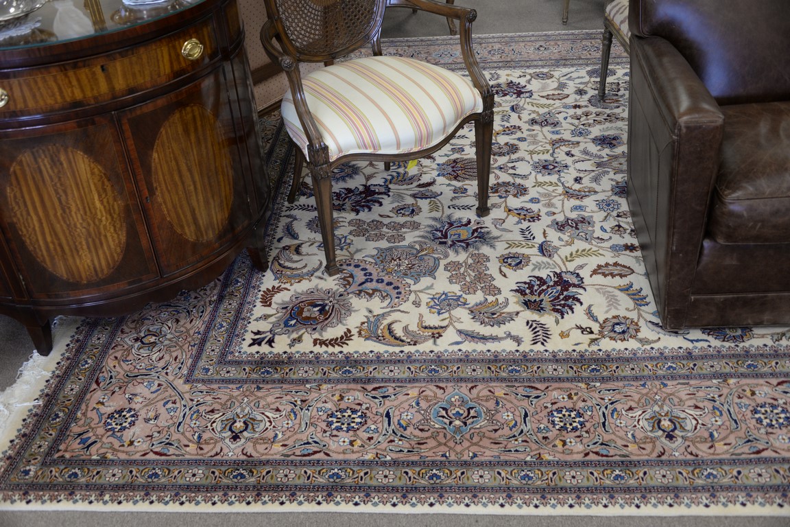 Room size contemporary carpet having cream ground with rose border, 10’1 x 14’2.