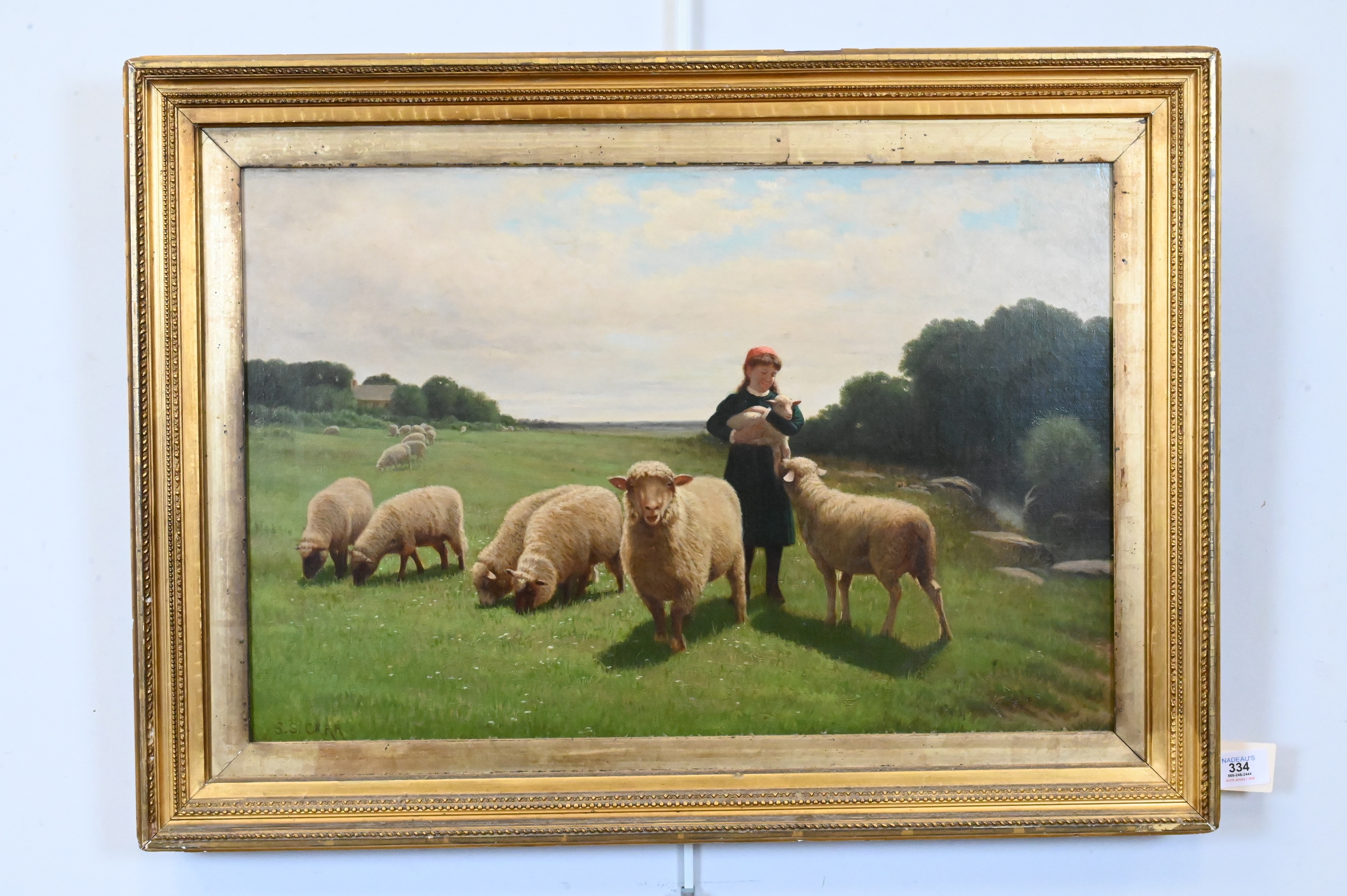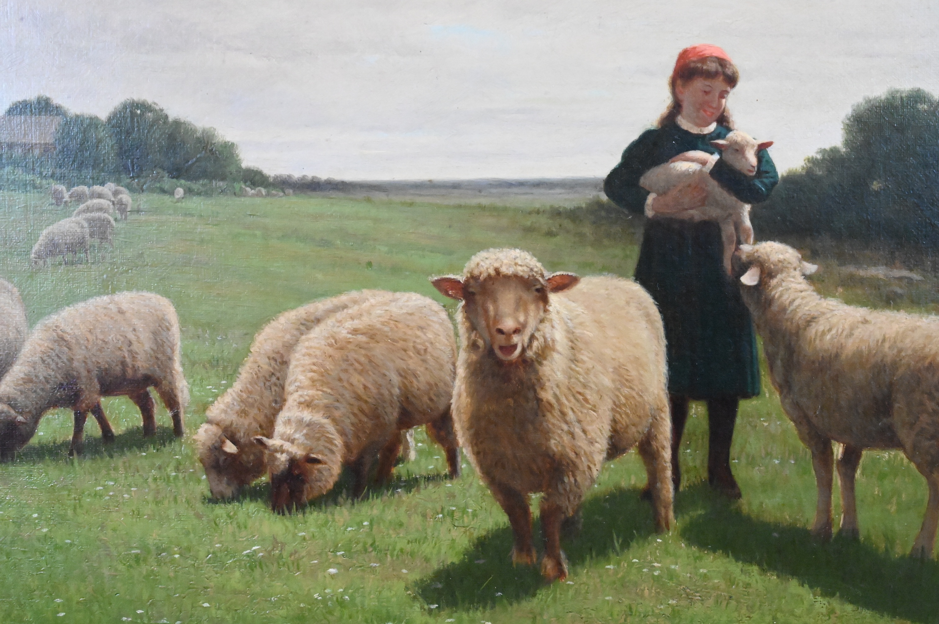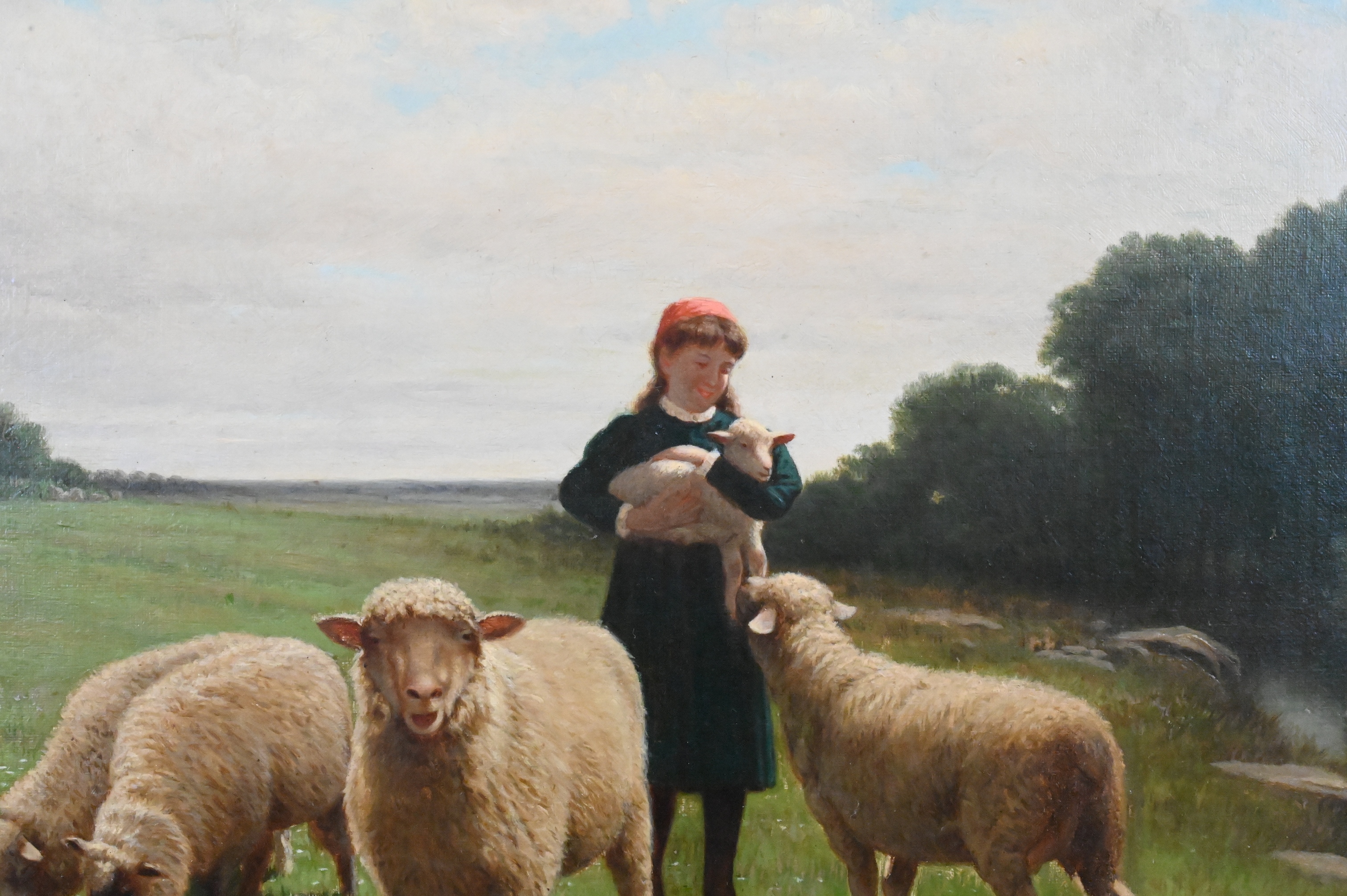 depicting a pastoral scene with a young shepherdess standing in a sunlit meadow surrounded by grazing sheep, holding a small lamb in her arms, a distant farmhouse and winding stream complete the tranquil composition; Carr’s precise draftsmanship, soft modeling, and luminous palette reflect his style of serene rural realism and nostalgic charm