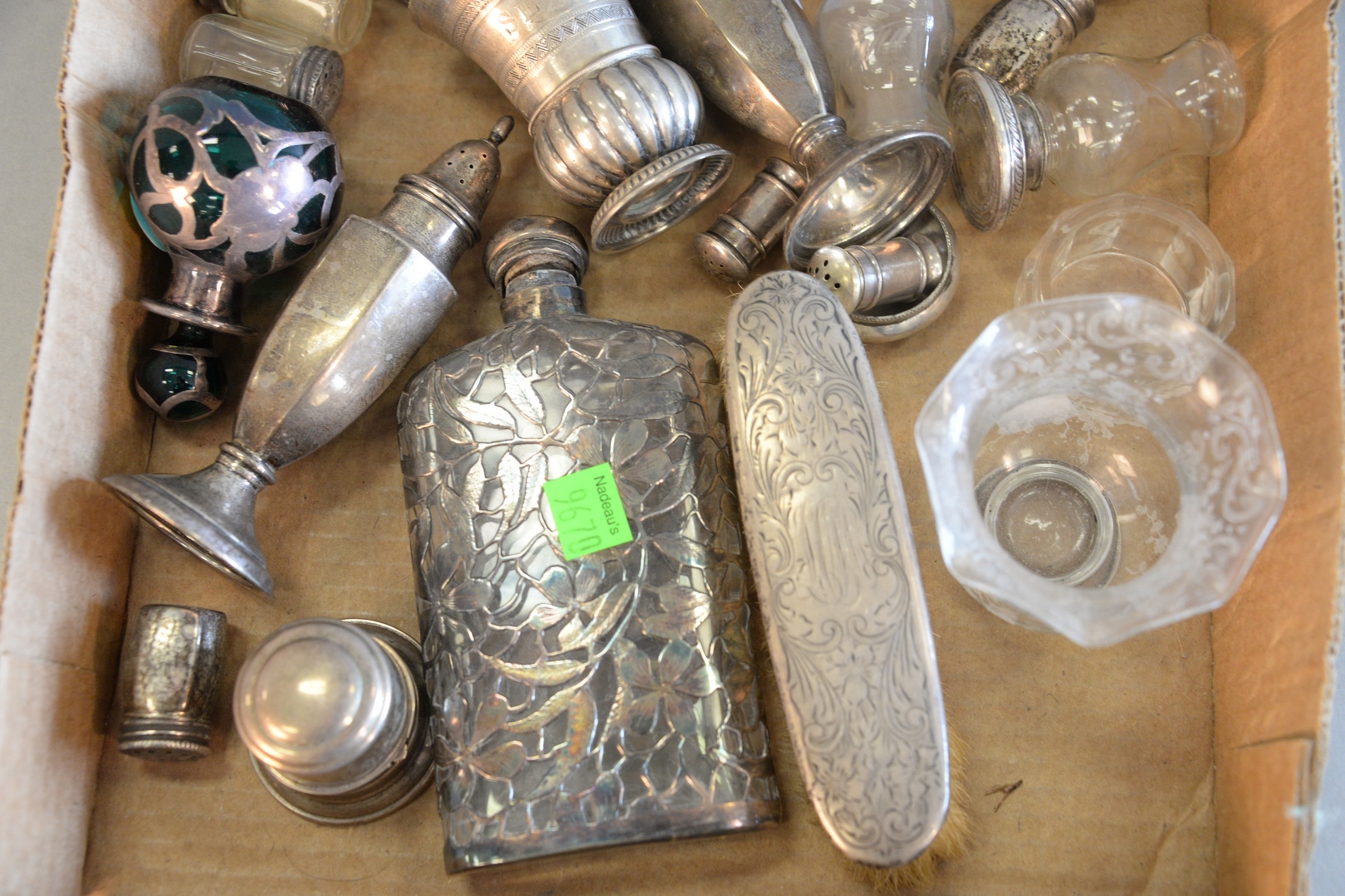 Lot 334: Silver Lot to include overlay flask, perfume, pepper shakers, etc. 13.2 t.oz weighable Provenance: The Estate of Diana Atwood Jo…