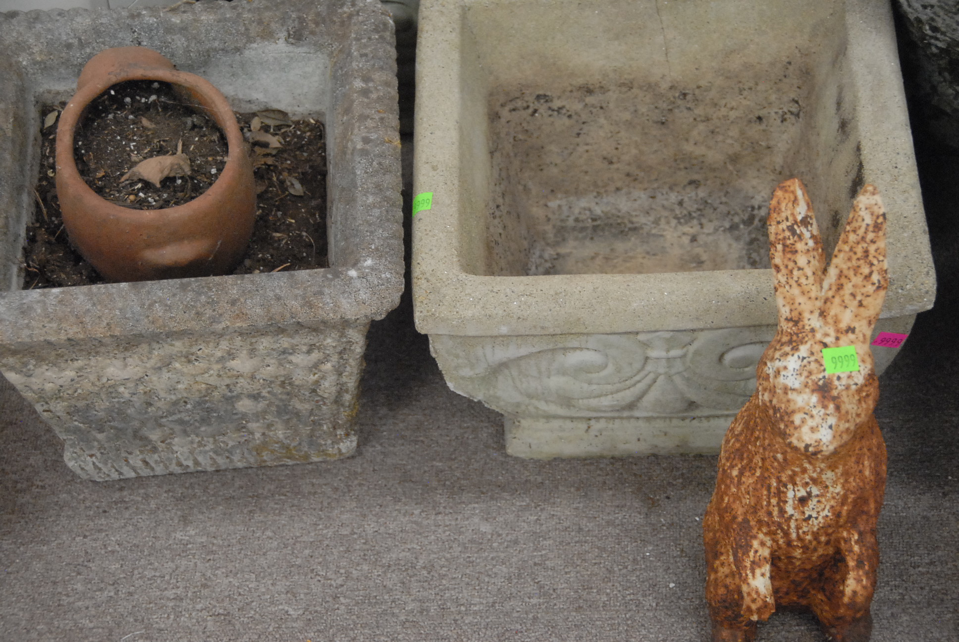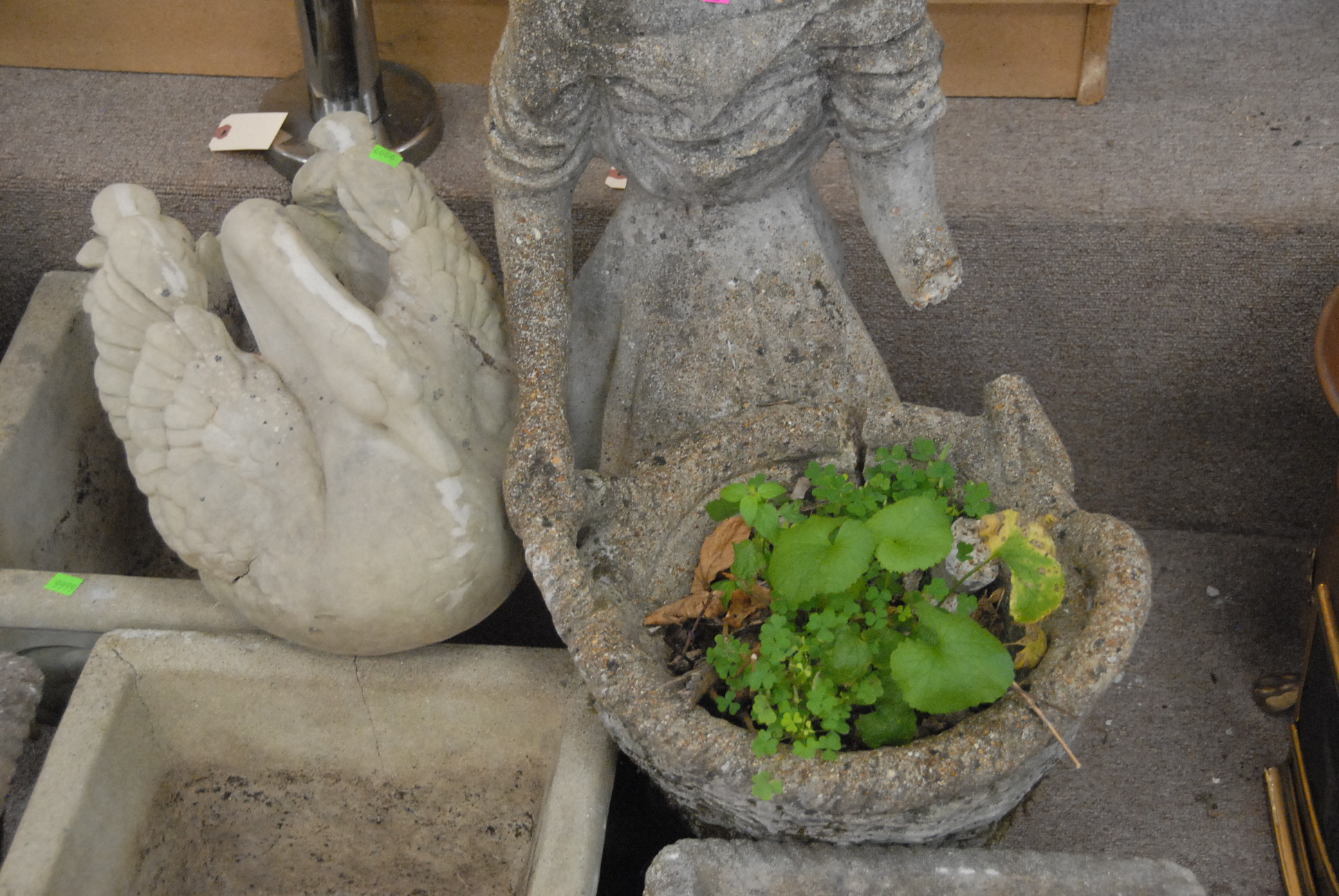 Six piece lot including cement girl with urn as is, two pairs of urns, and a swan.