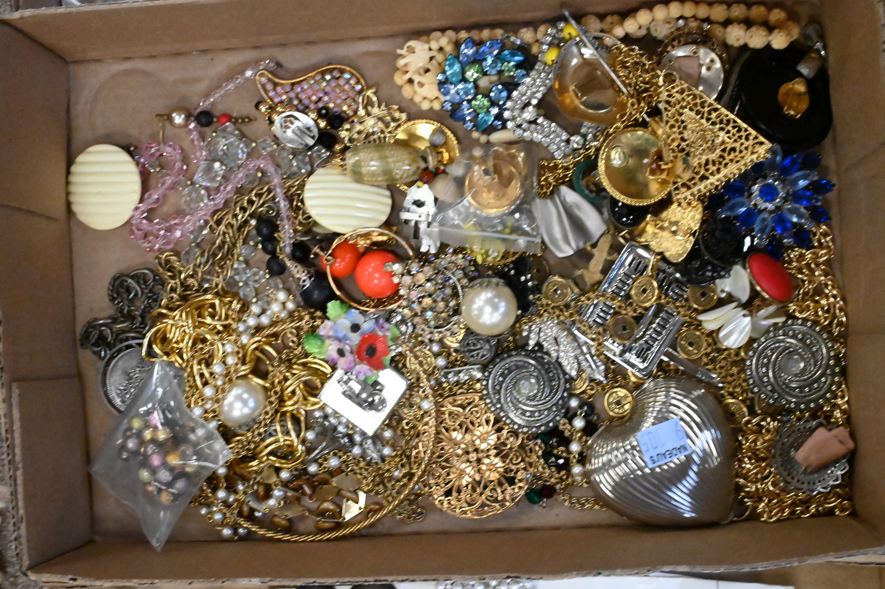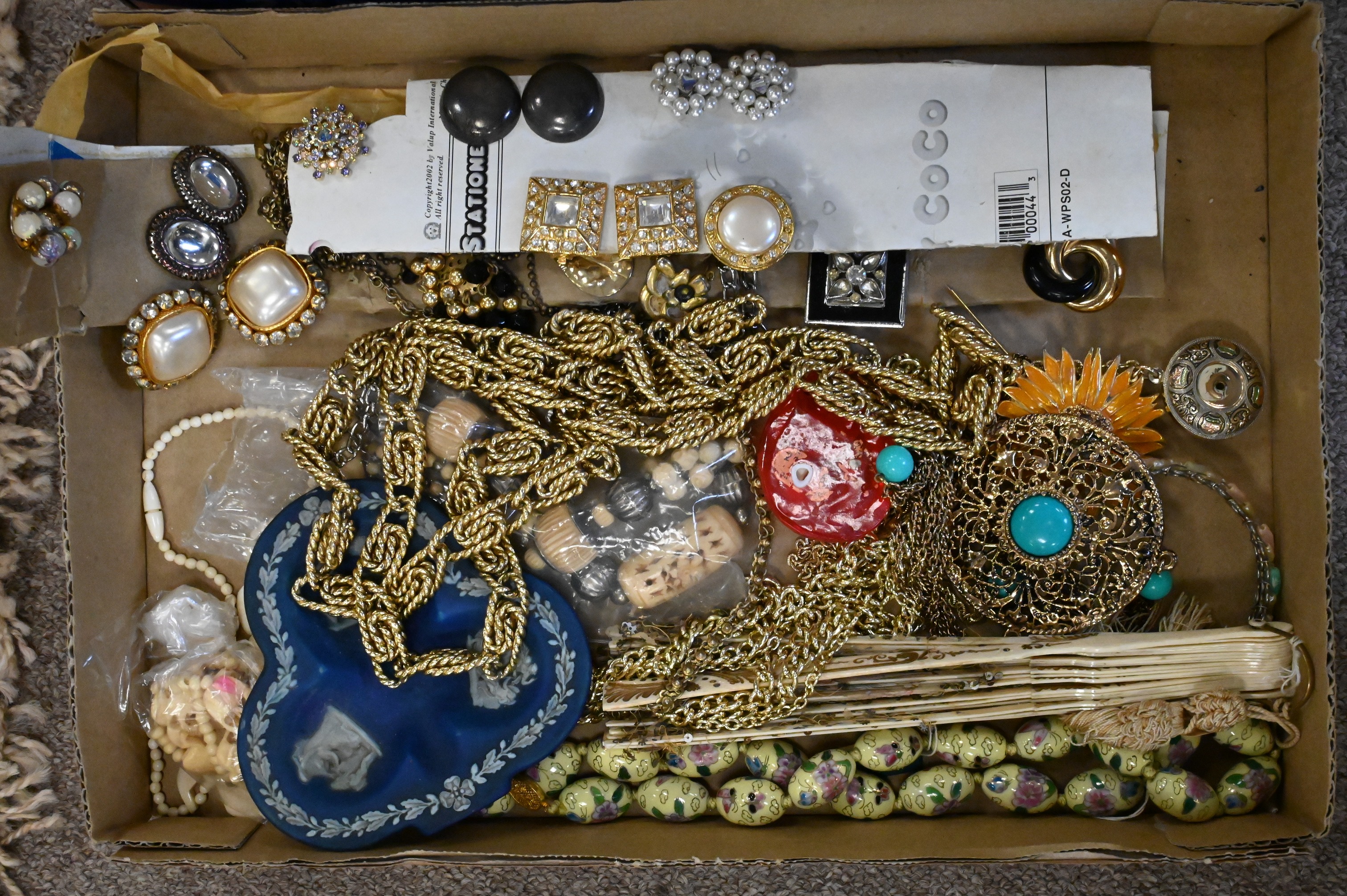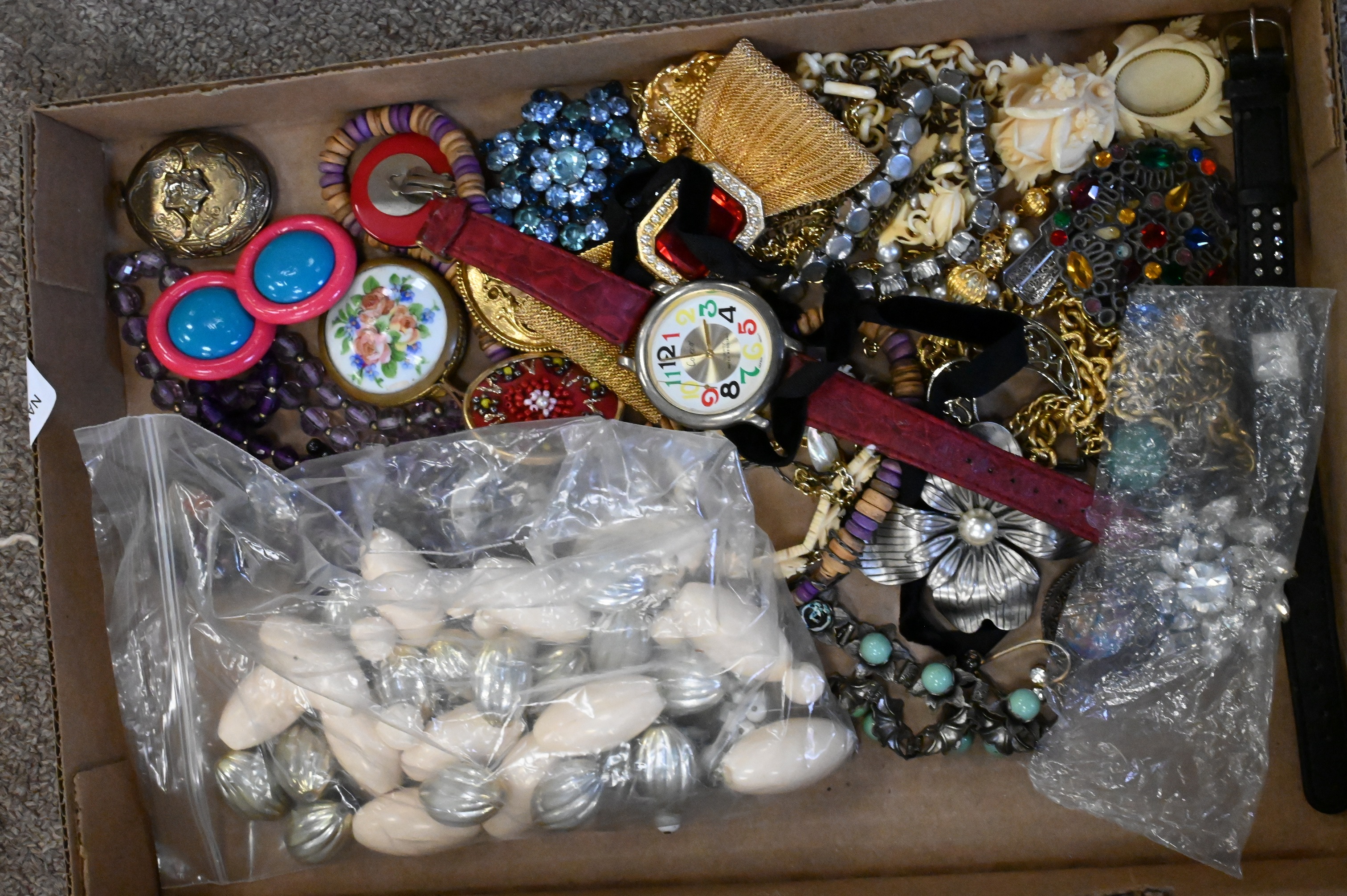 A large and varied assortment including necklaces, chains, clip earrings, bracelets, brooches, and pins in assorted gilt, enamel, beaded, and faux pearl designs. Makers include Bijou Turner, Limoges France, and others, together with a stainless steel wristwatch, miniature mirror compact, and assorted rhinestone, cameo, and resin-set pieces.