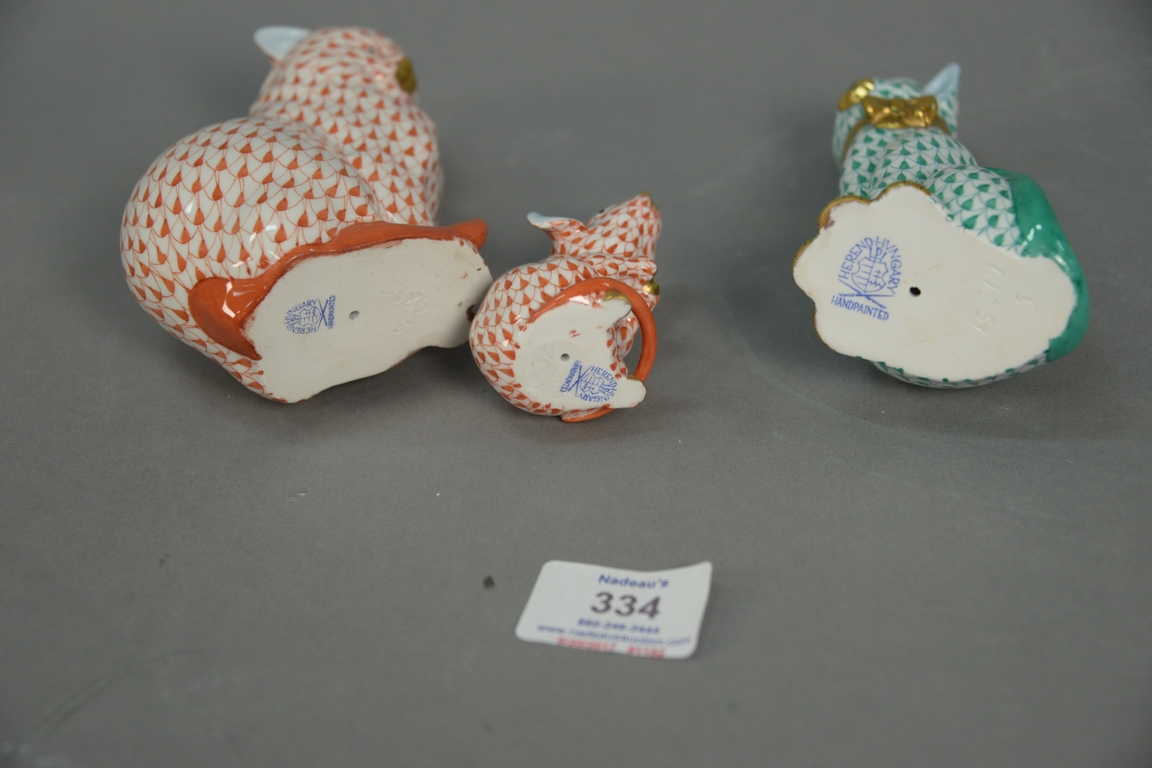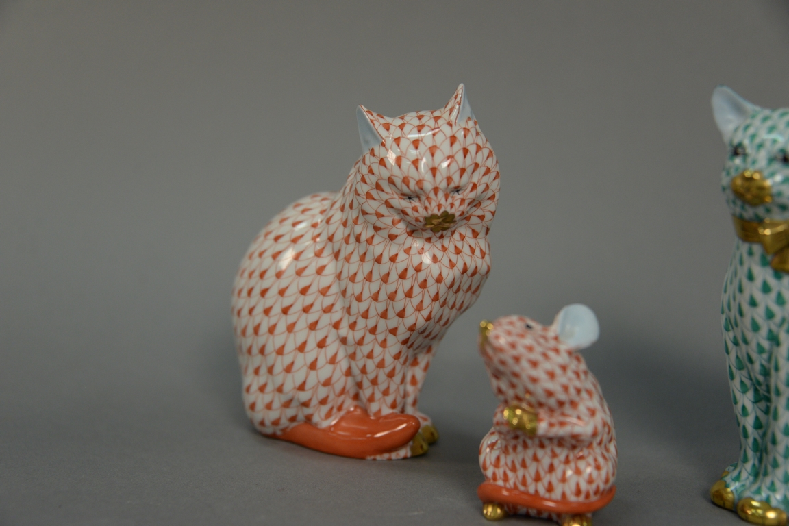 Three Herend Hungary porcelain animal figures to include a cat in green fishnet, a cat in red rust fishnet, and a mouse in red rust fishnet. hts 2 1/4in., 4 1/2in., & 4 1/2in.