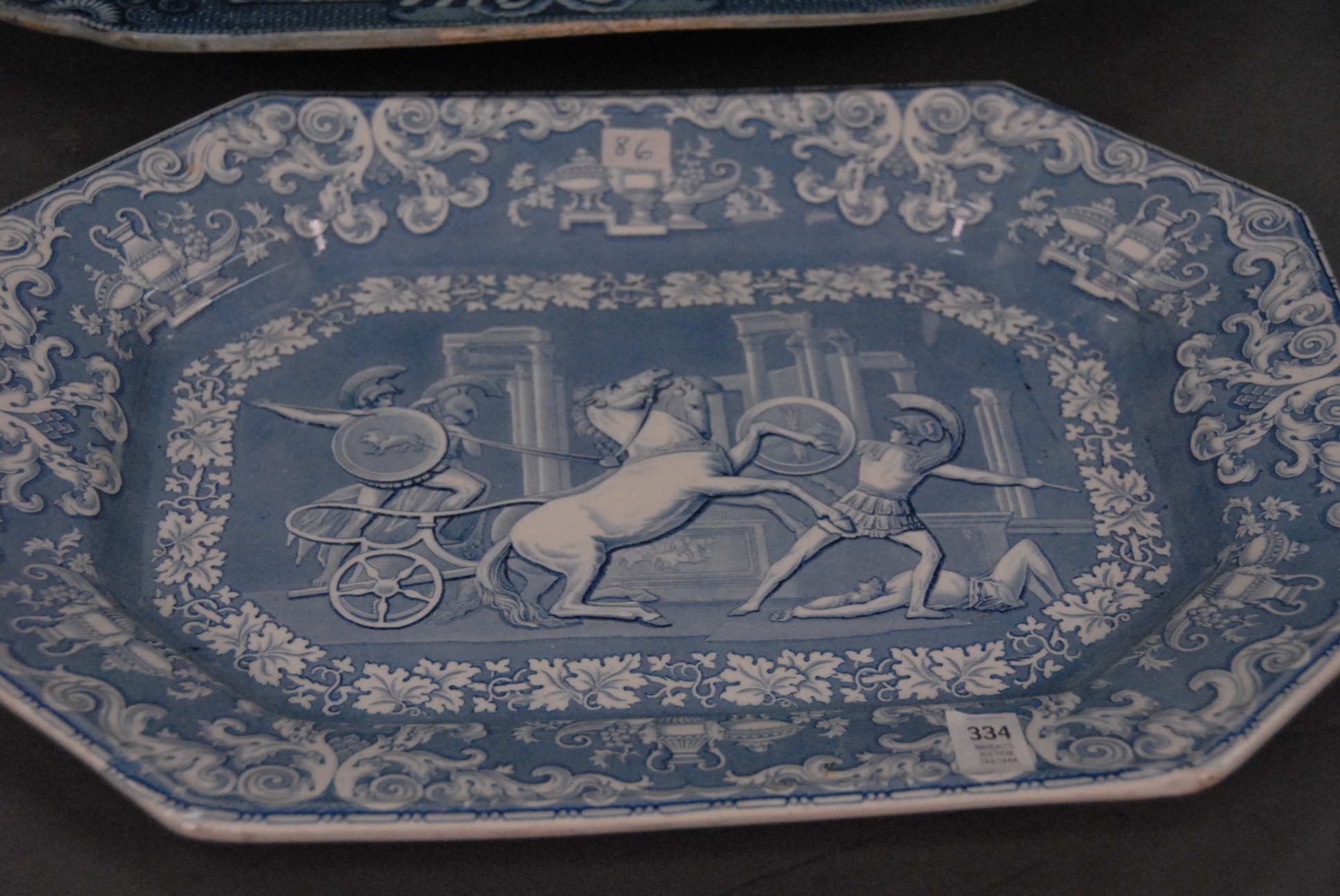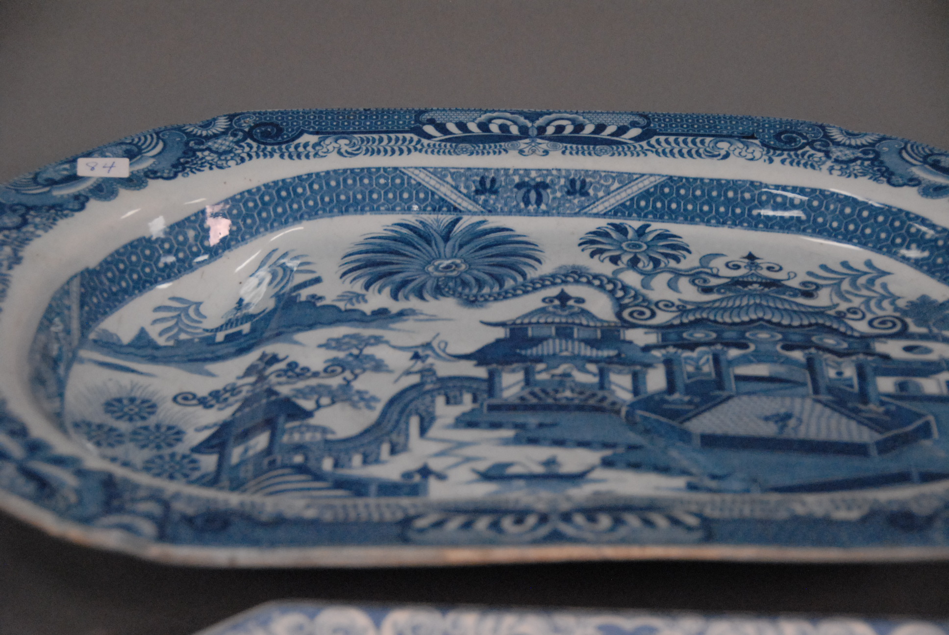 Two large blue and white platters, one is well and tree platter.