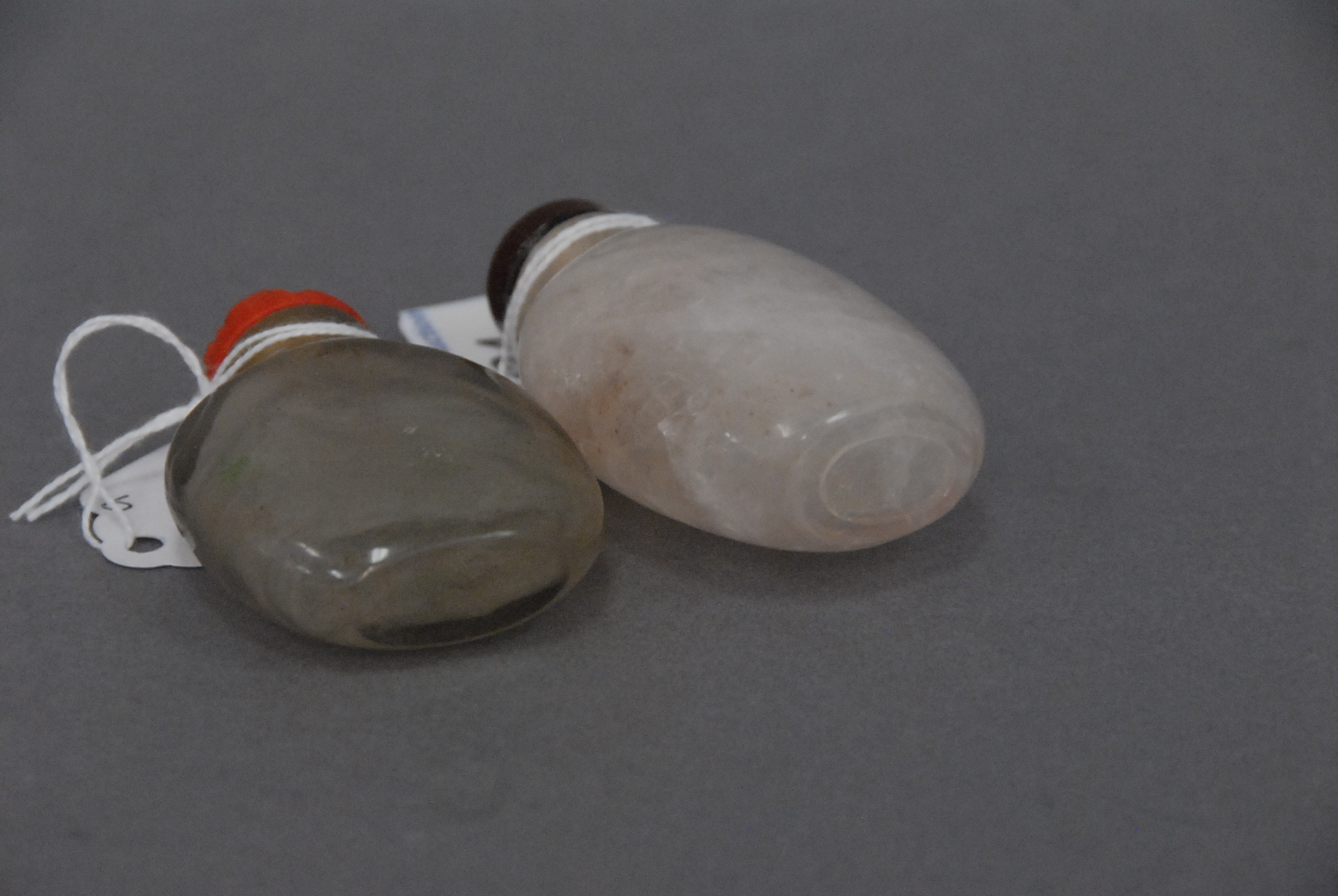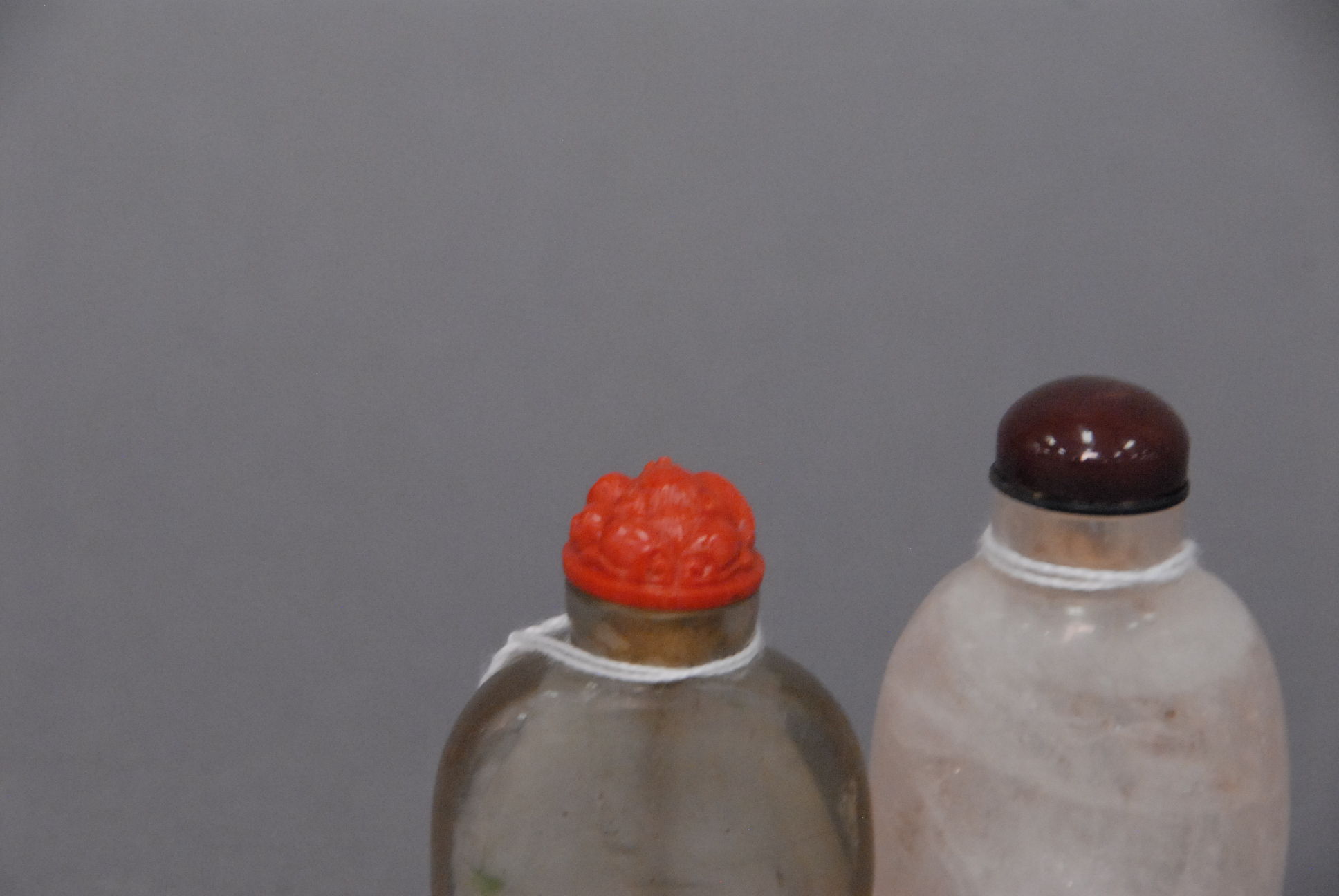 Two snuff bottles: pink quartz snuff bottle having agate top, 2 3/4 and clear quartz carved snuff bottle, having imitation dragon coral top, ht 2 1/2.