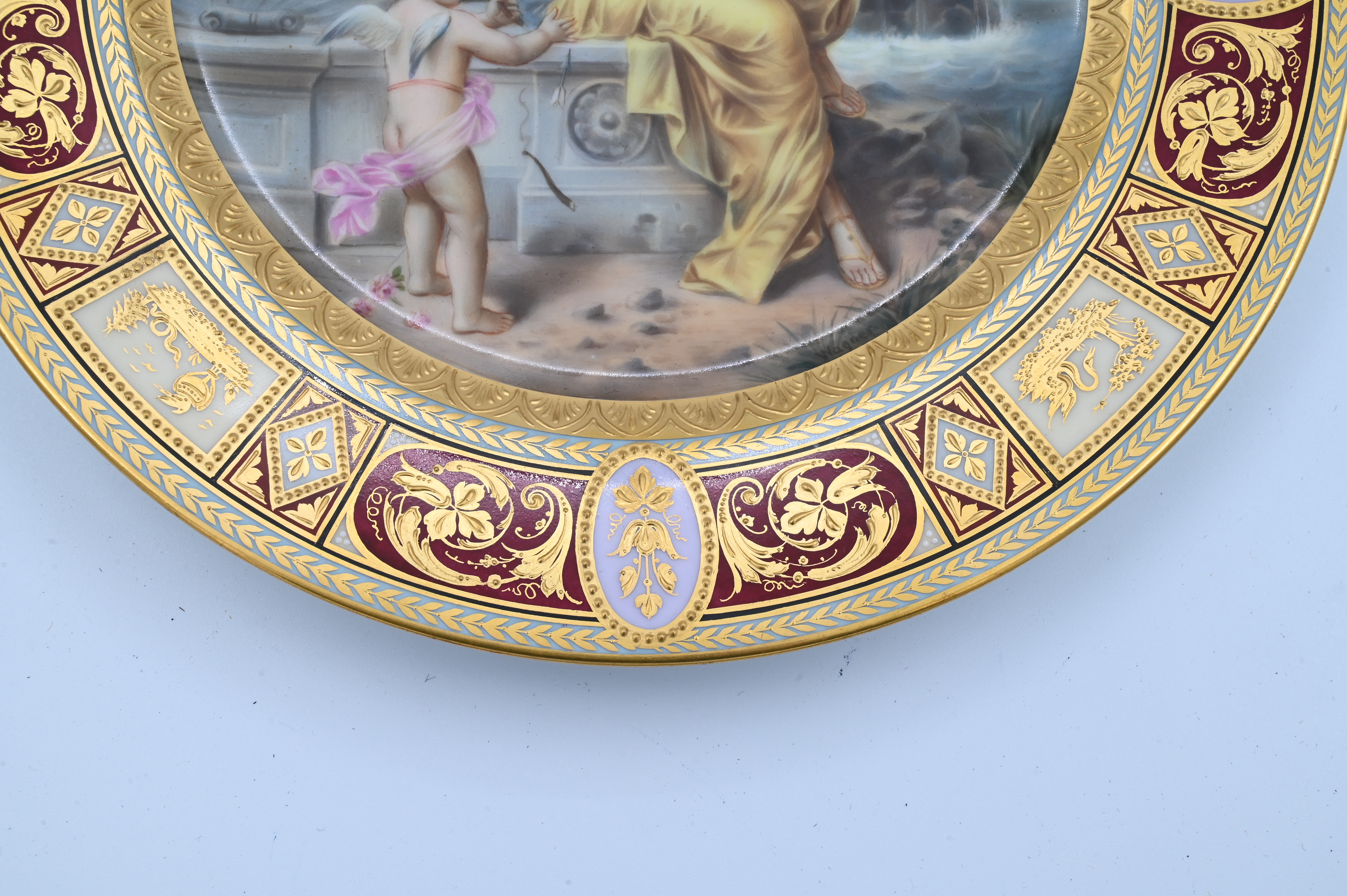 hand painted, decorated with maiden and cupid, having high relief border, signed Wagner, diameter 9 1/2 inches