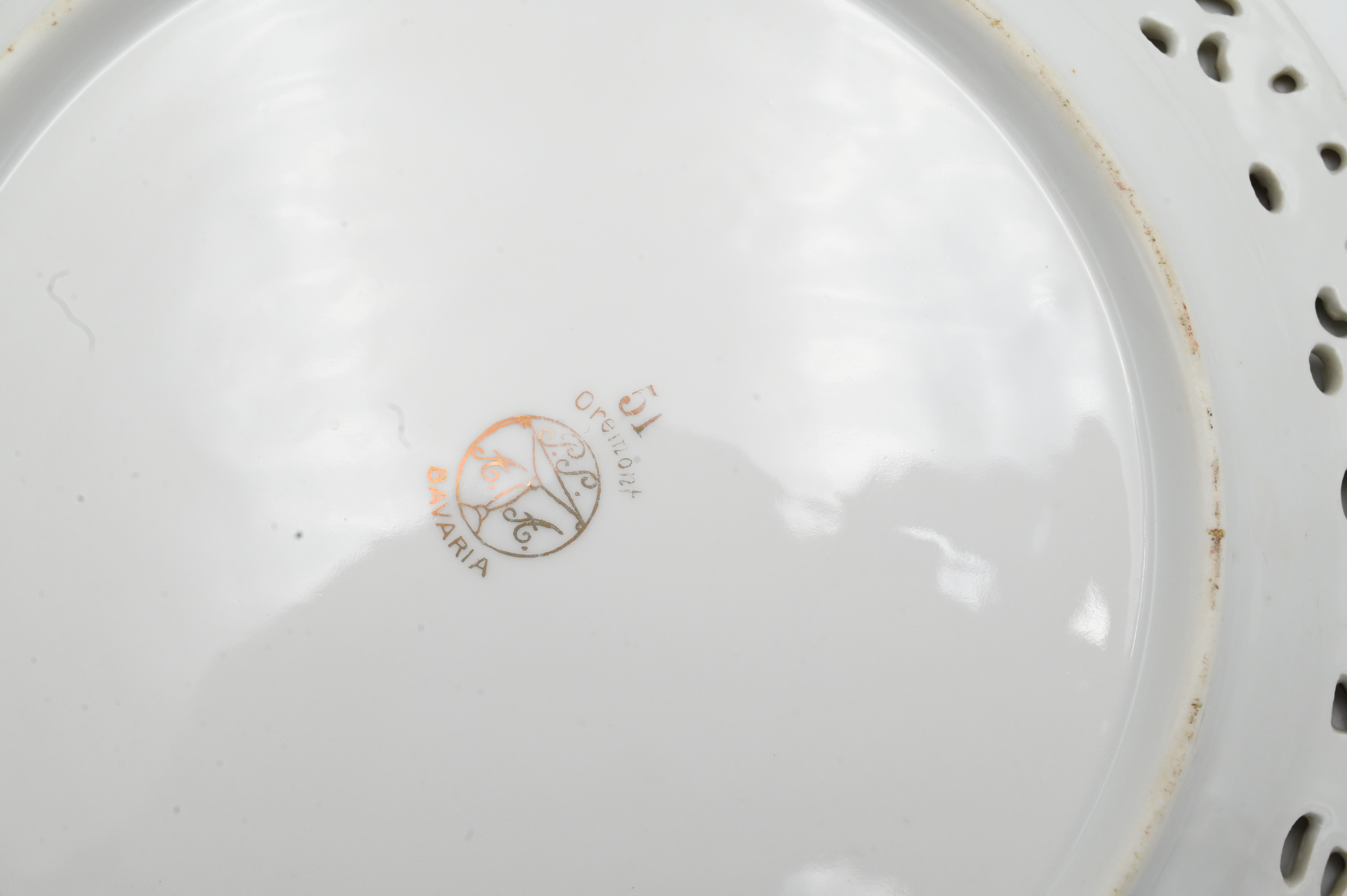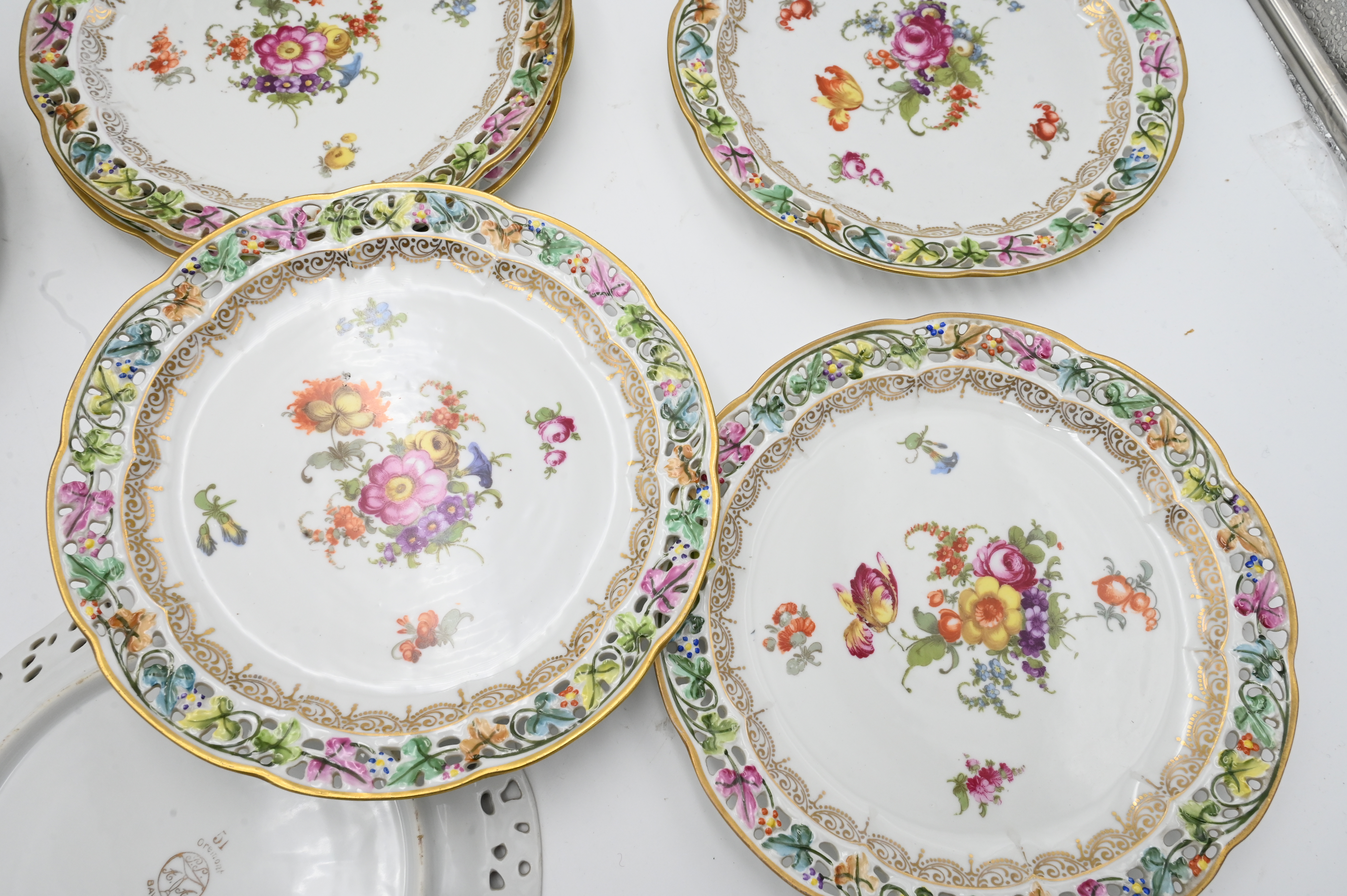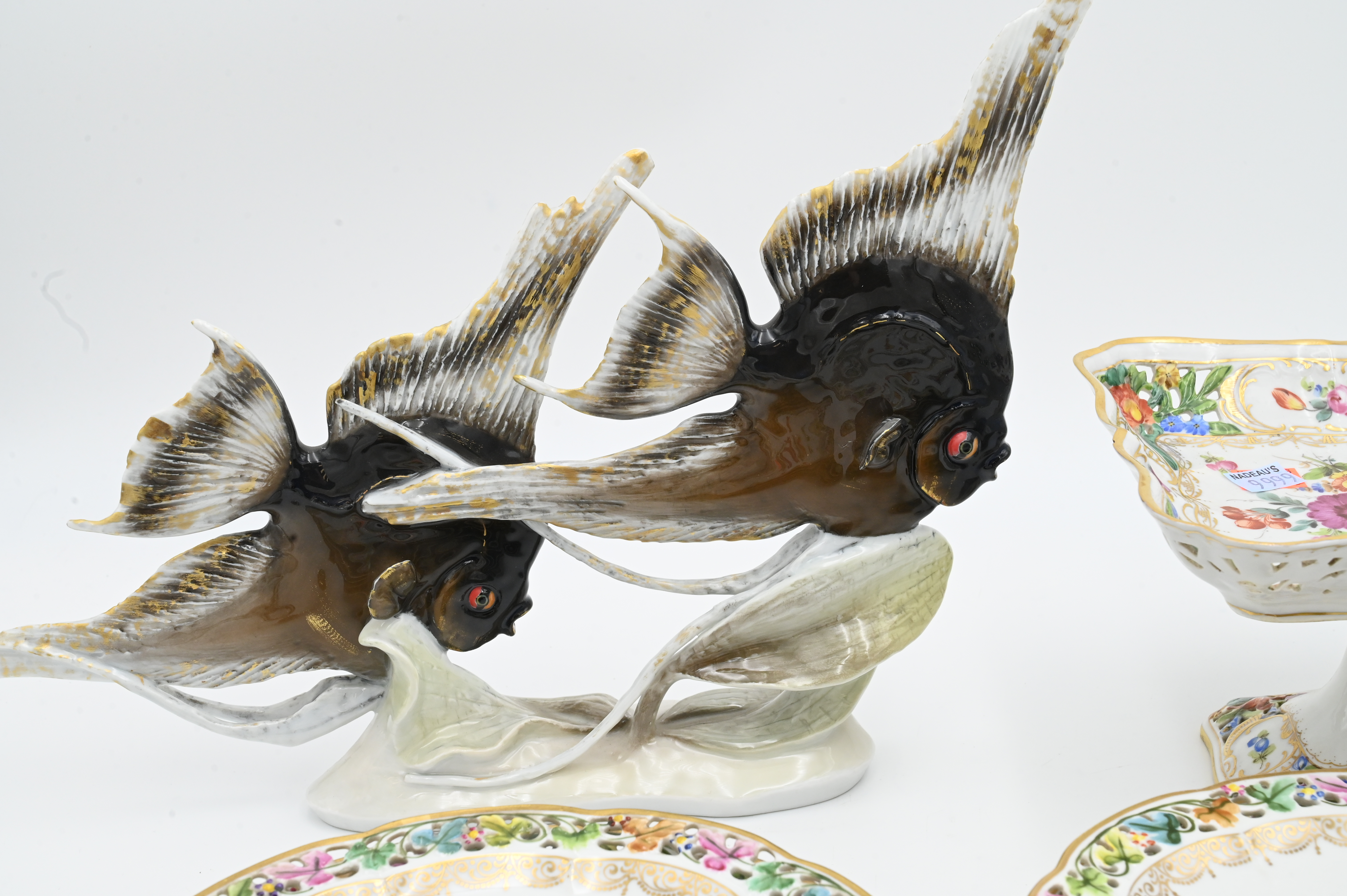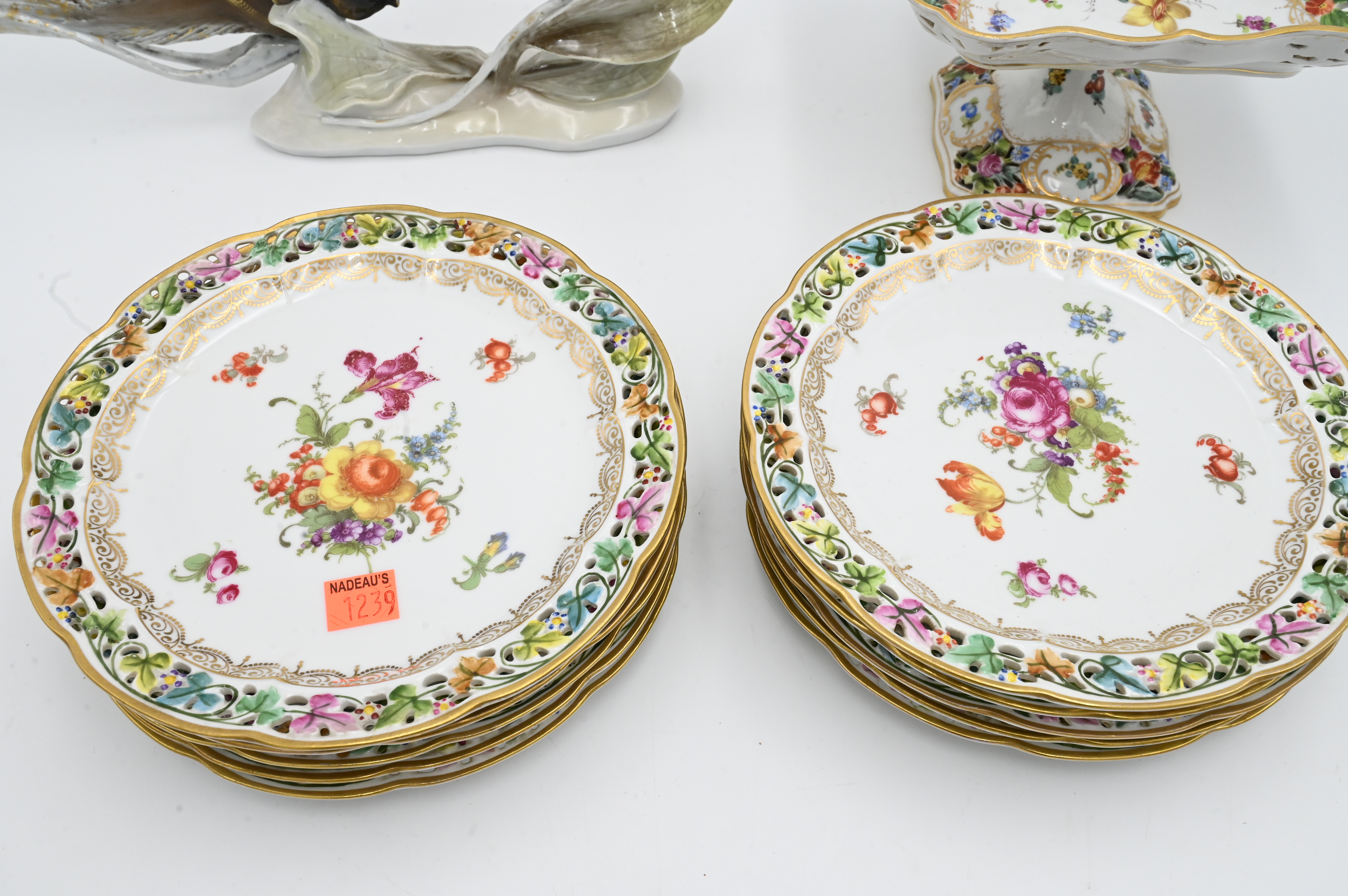 11 Piece Lot of Dresden, to include compote, 10 reticulated German plates, diameter 8 inches, along with a Rosenthal porcelain fish, height 10 inches.