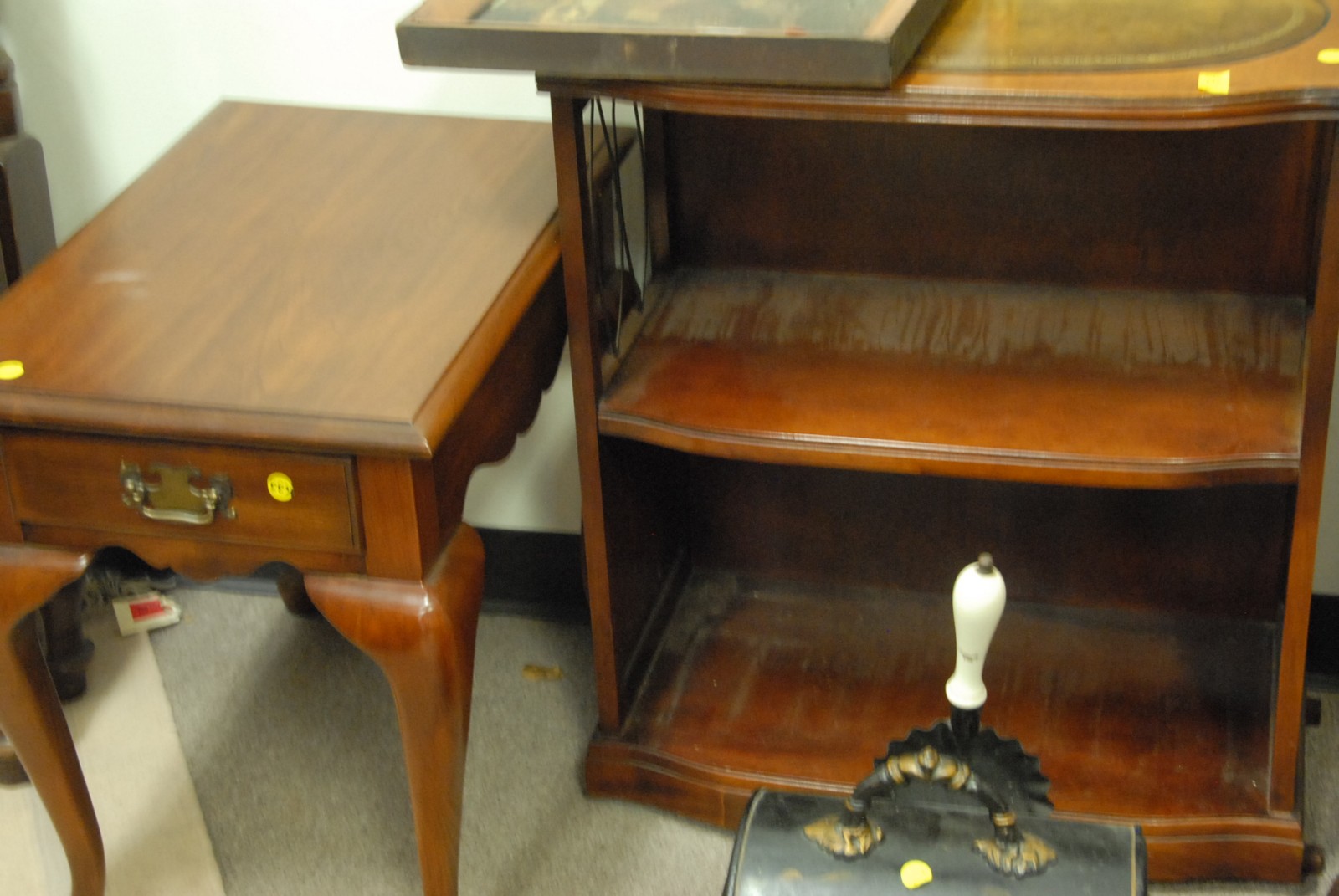 3 piece lot including a leather top bookcase, leather top small stand, small Pennsylvania House cherry table
