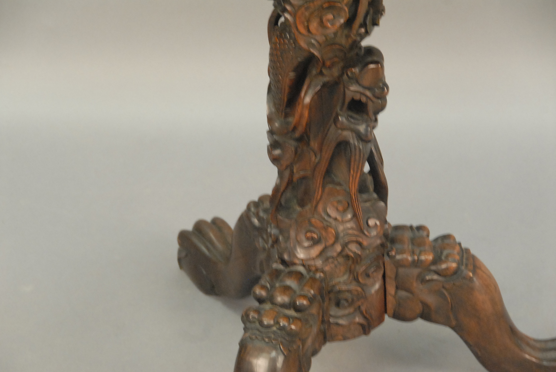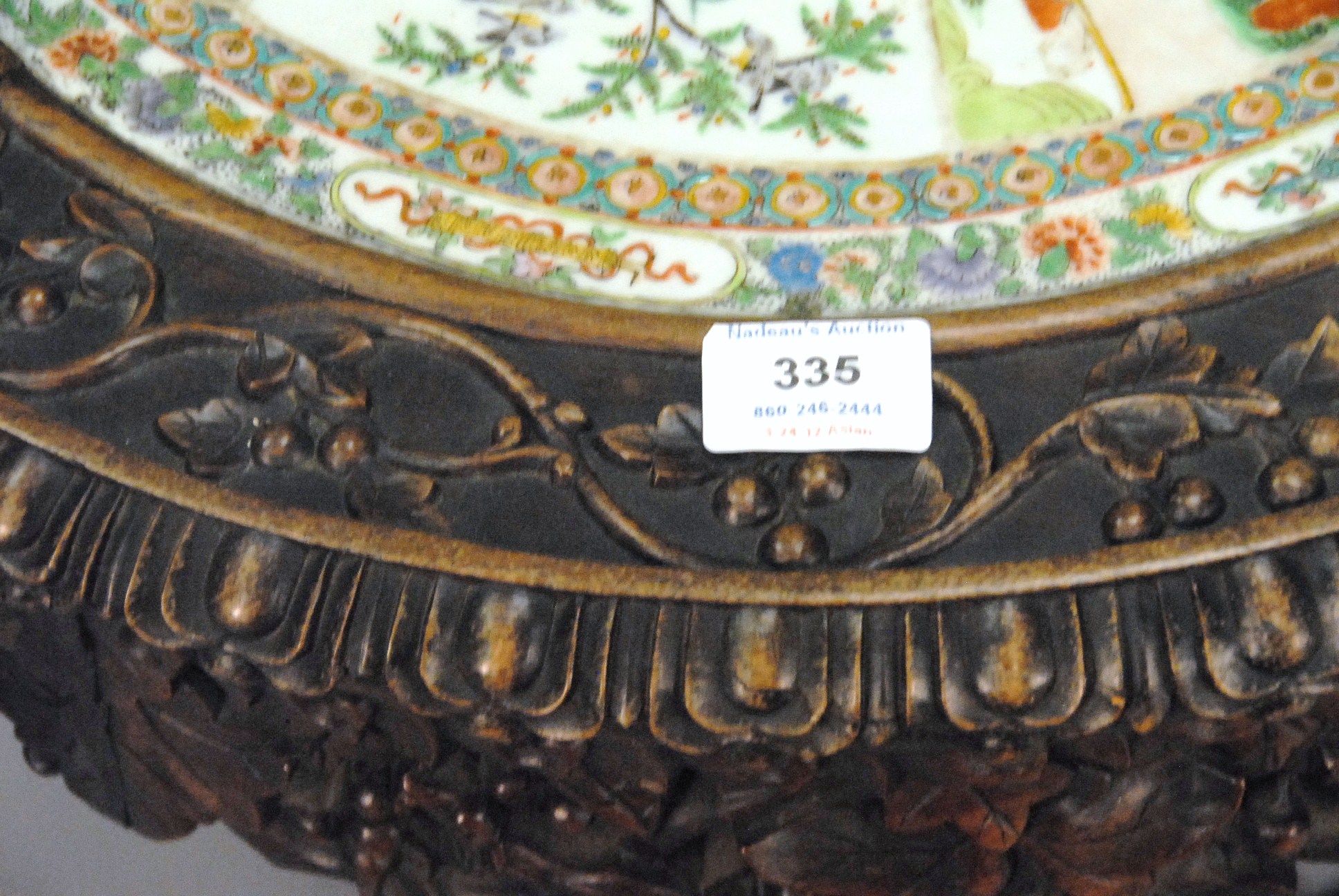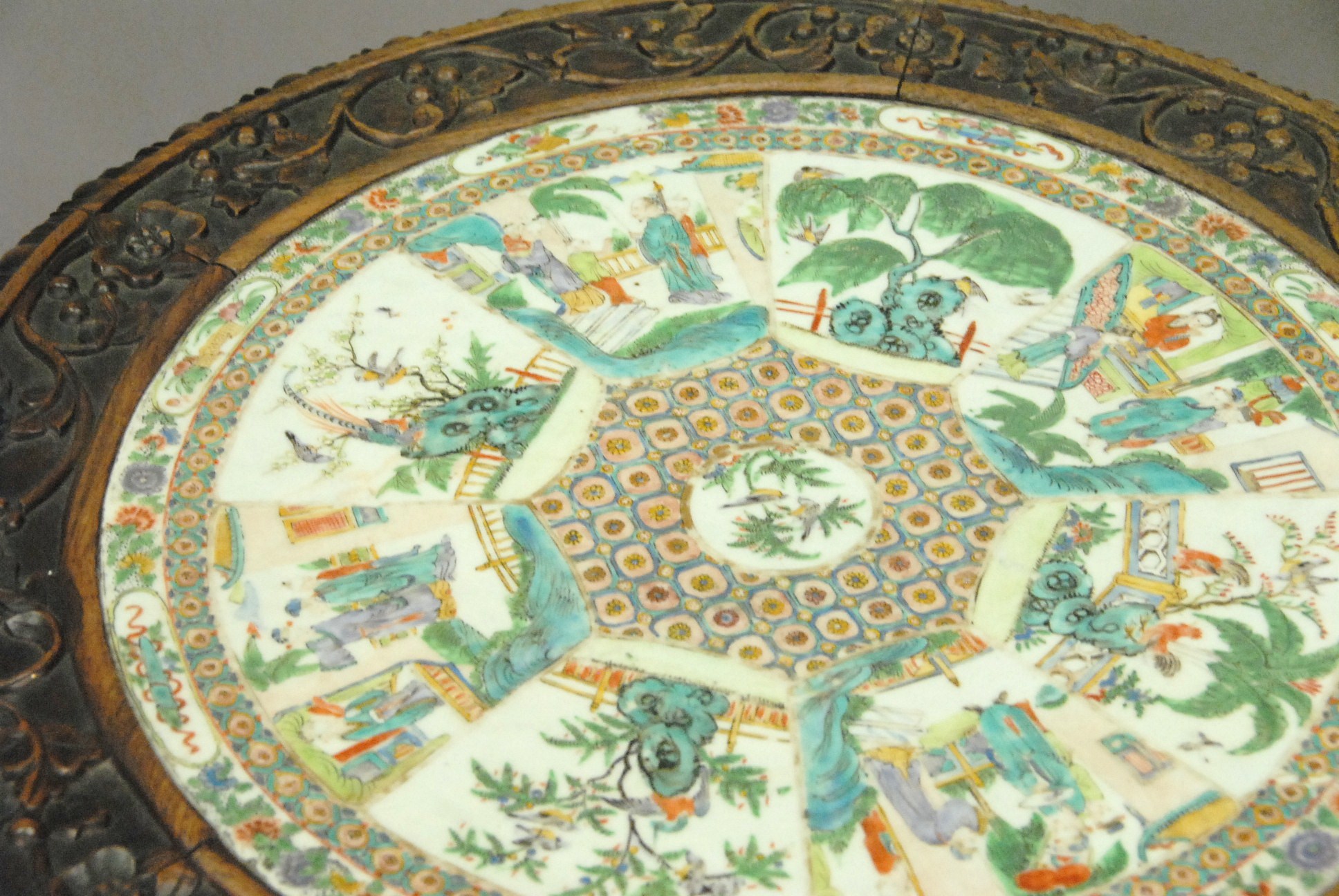 Lot 335: Chinese teakwood table with round top and dragon carved pedestal, top inset with Famille Verte plaque