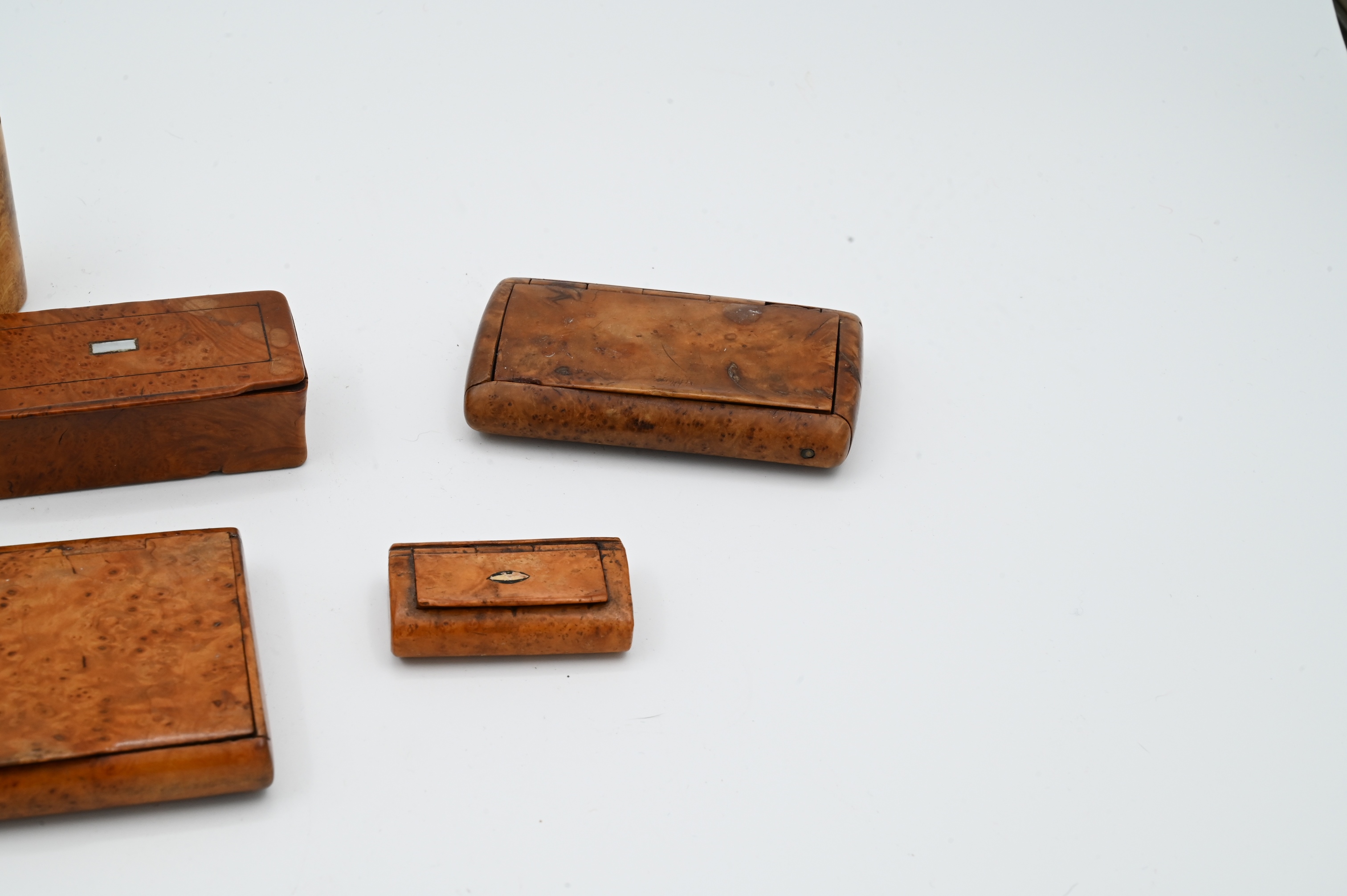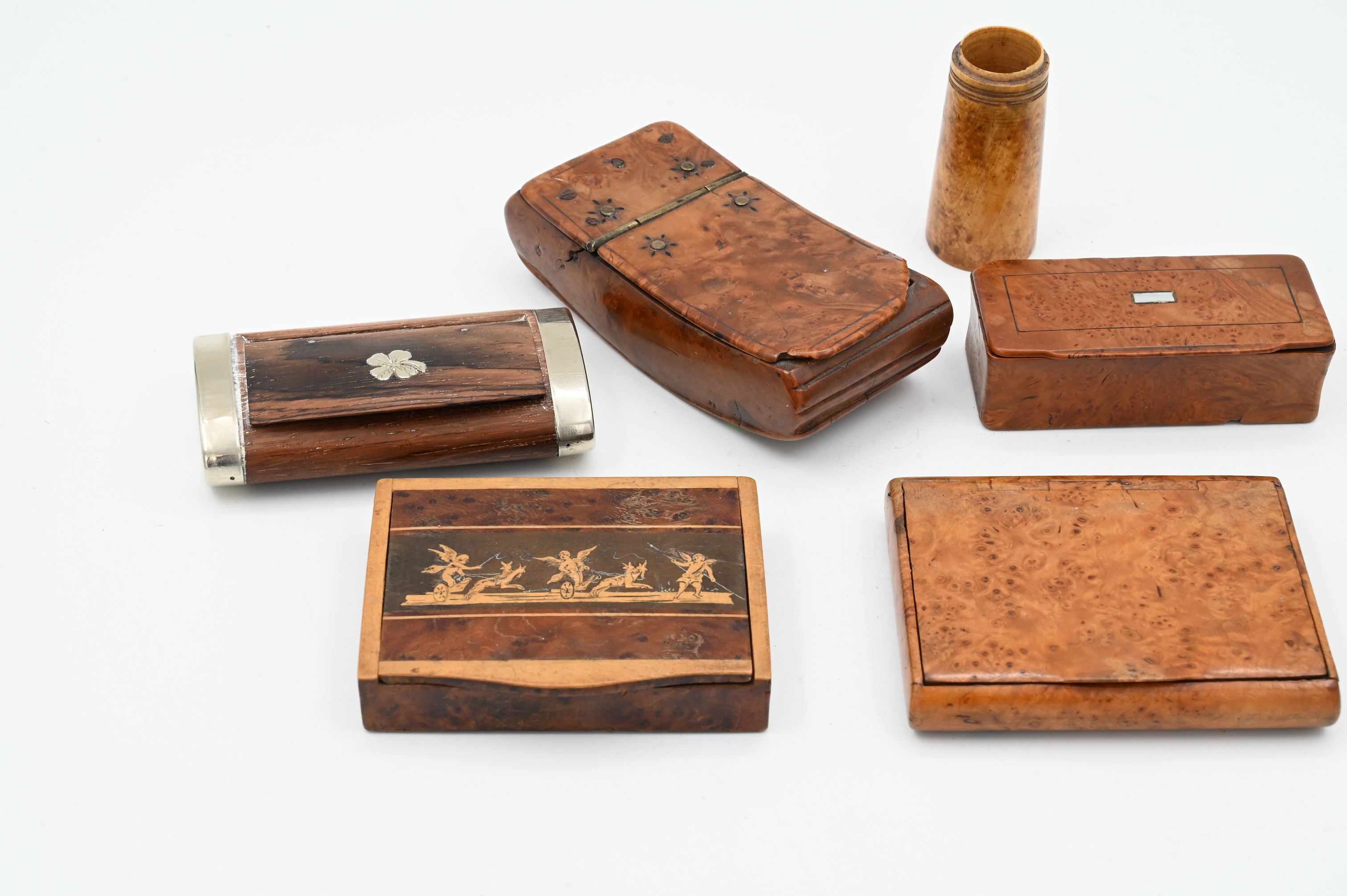 five burl rectangular boxes box having silver ends, inlaid box, and cylindrical box