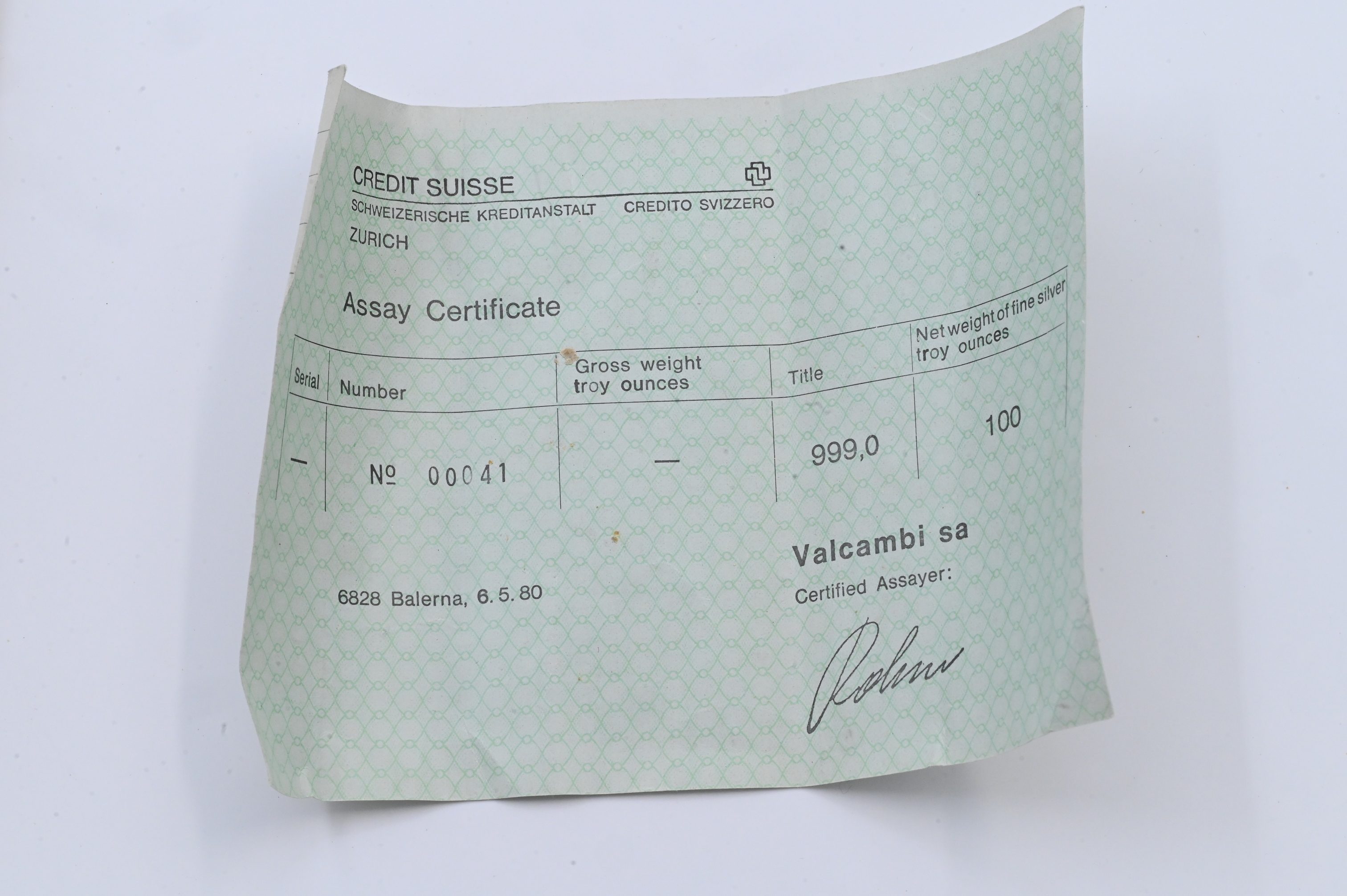 Lot 335: Credit Suisse 100 T.OZ Silver Bar