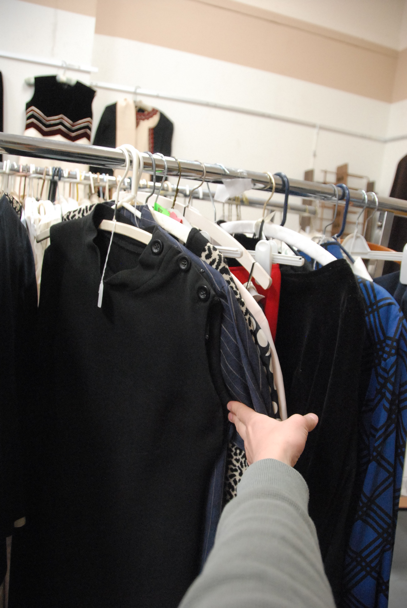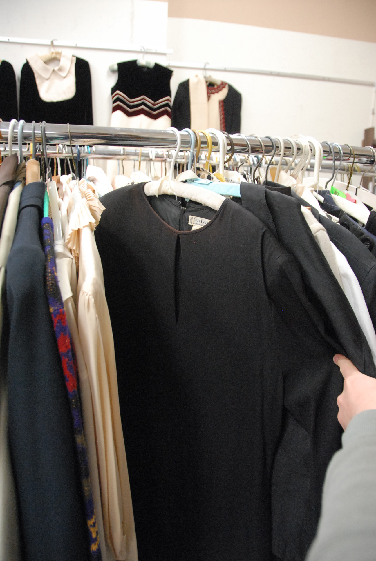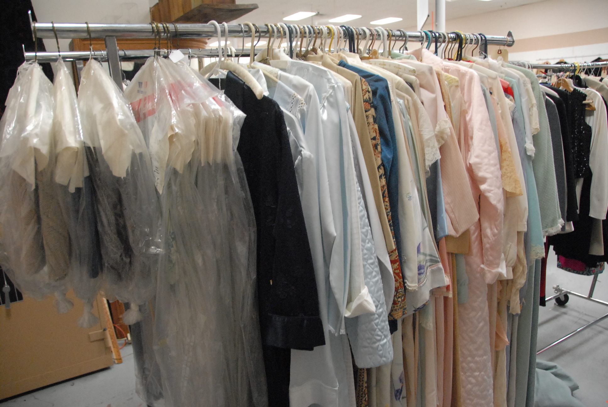 Double sided rack of clothes including woman’s dresses, skirts, night gowns, and miscellaneous.