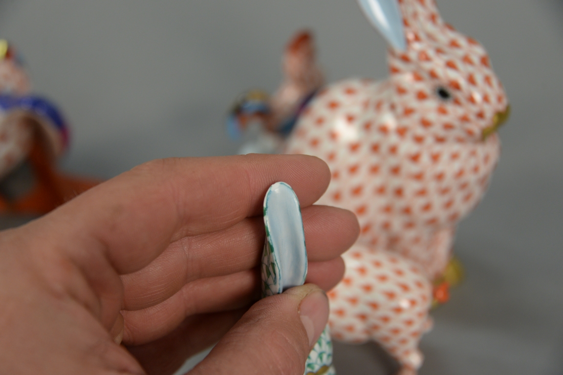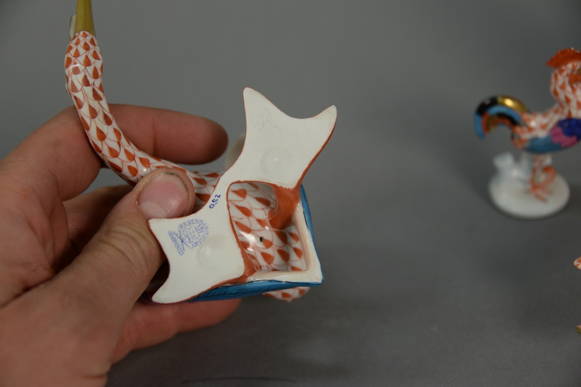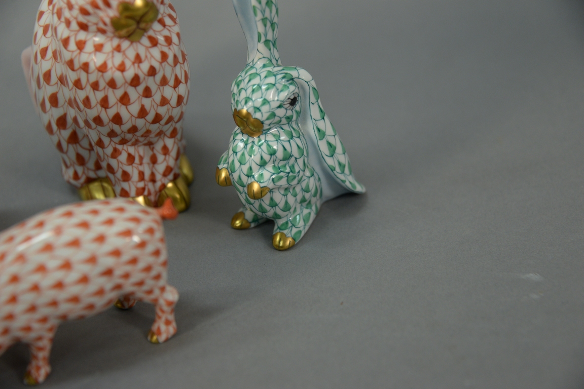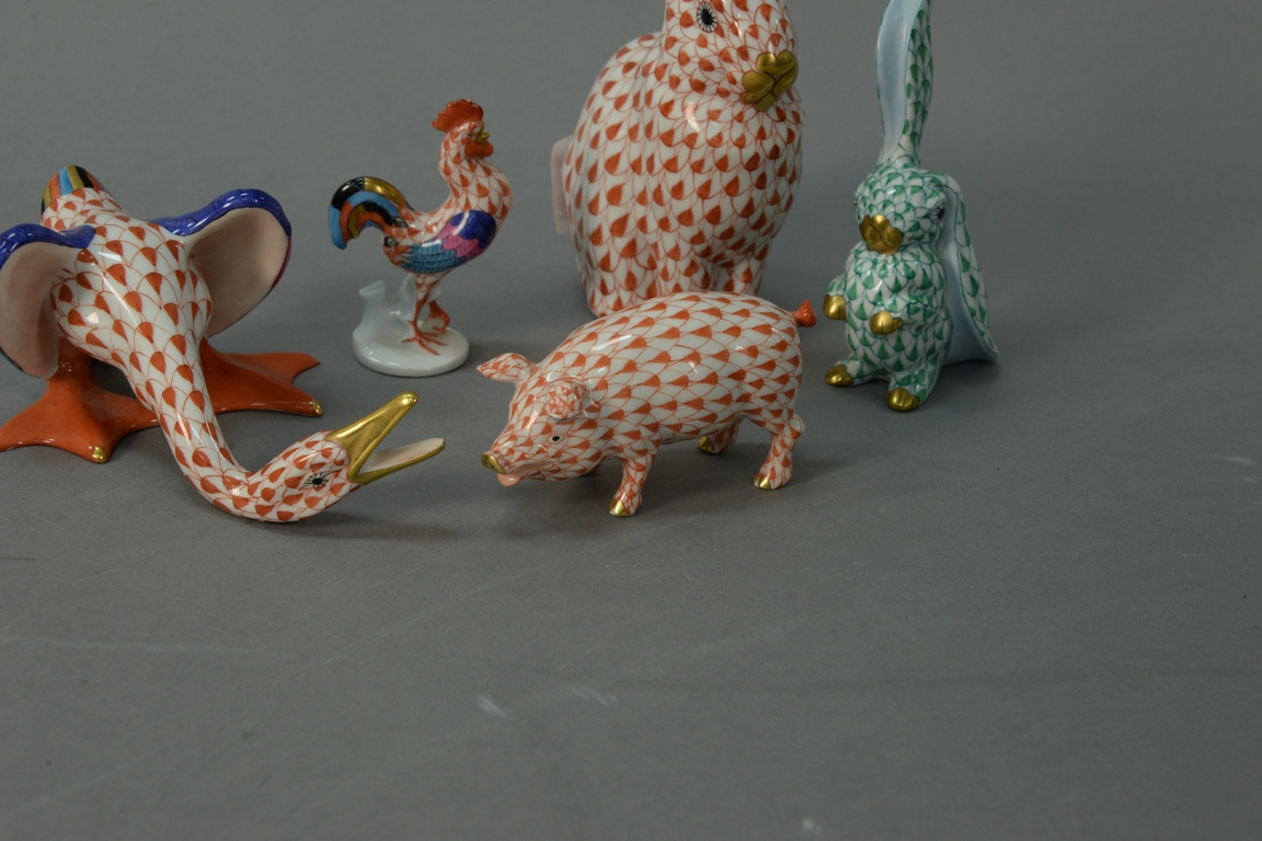 Five Herend Hungary porcelain animal figurines including four red rust fishnet: pig, rooster, rabbit, & squawking goose, and a green fishnet rabbit chip to top of ear. ht. 2 3/4in. to 5 1/4in.