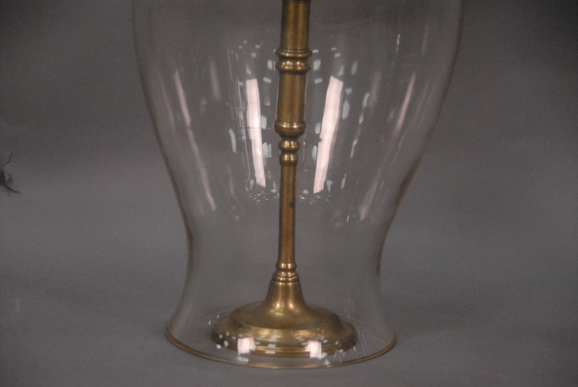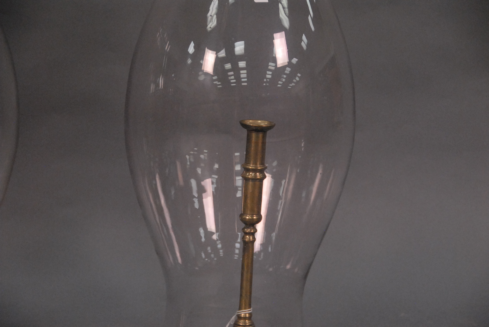 Four piece pair of brass push-up candlesticks and a pair of clear glass hurricane shades.