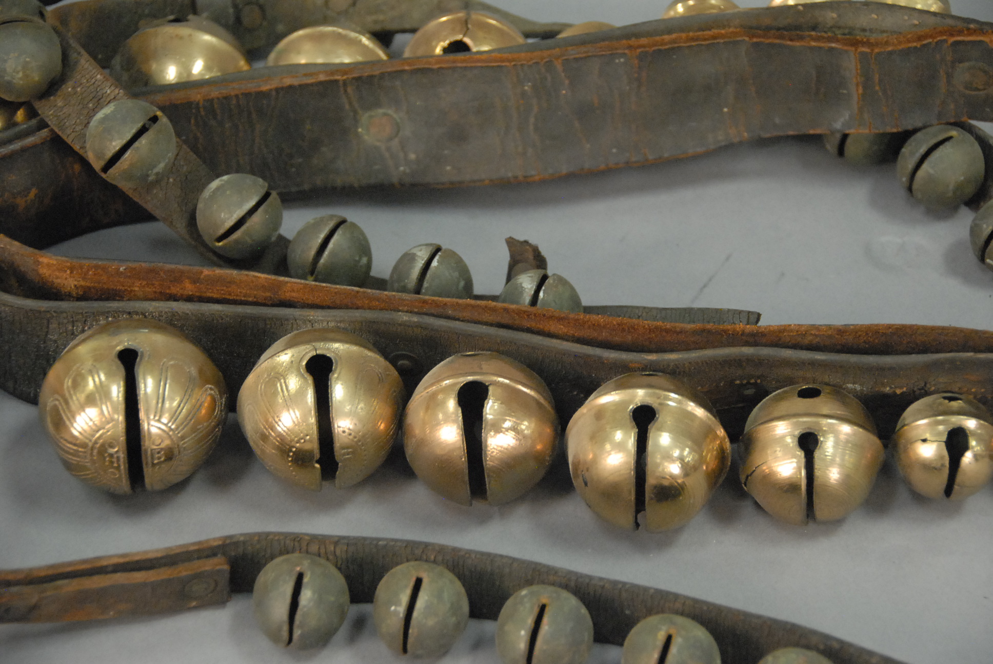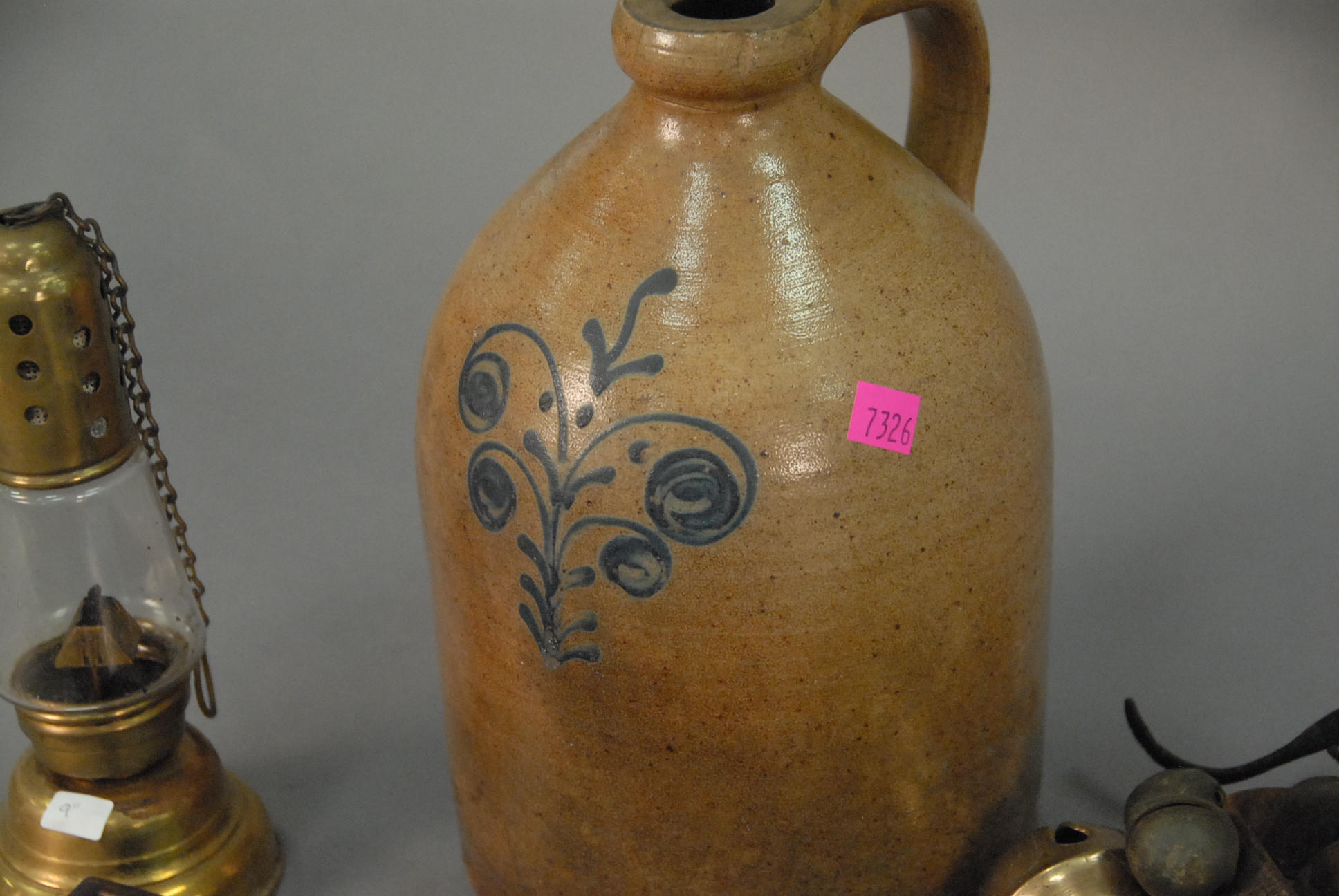 Lot 335: Group of five small primitive items to include two sets of bells, carved sewing box, stoneware jug, and brass lantern.