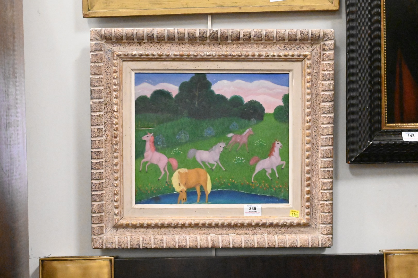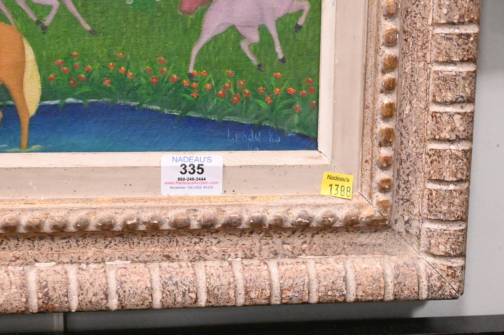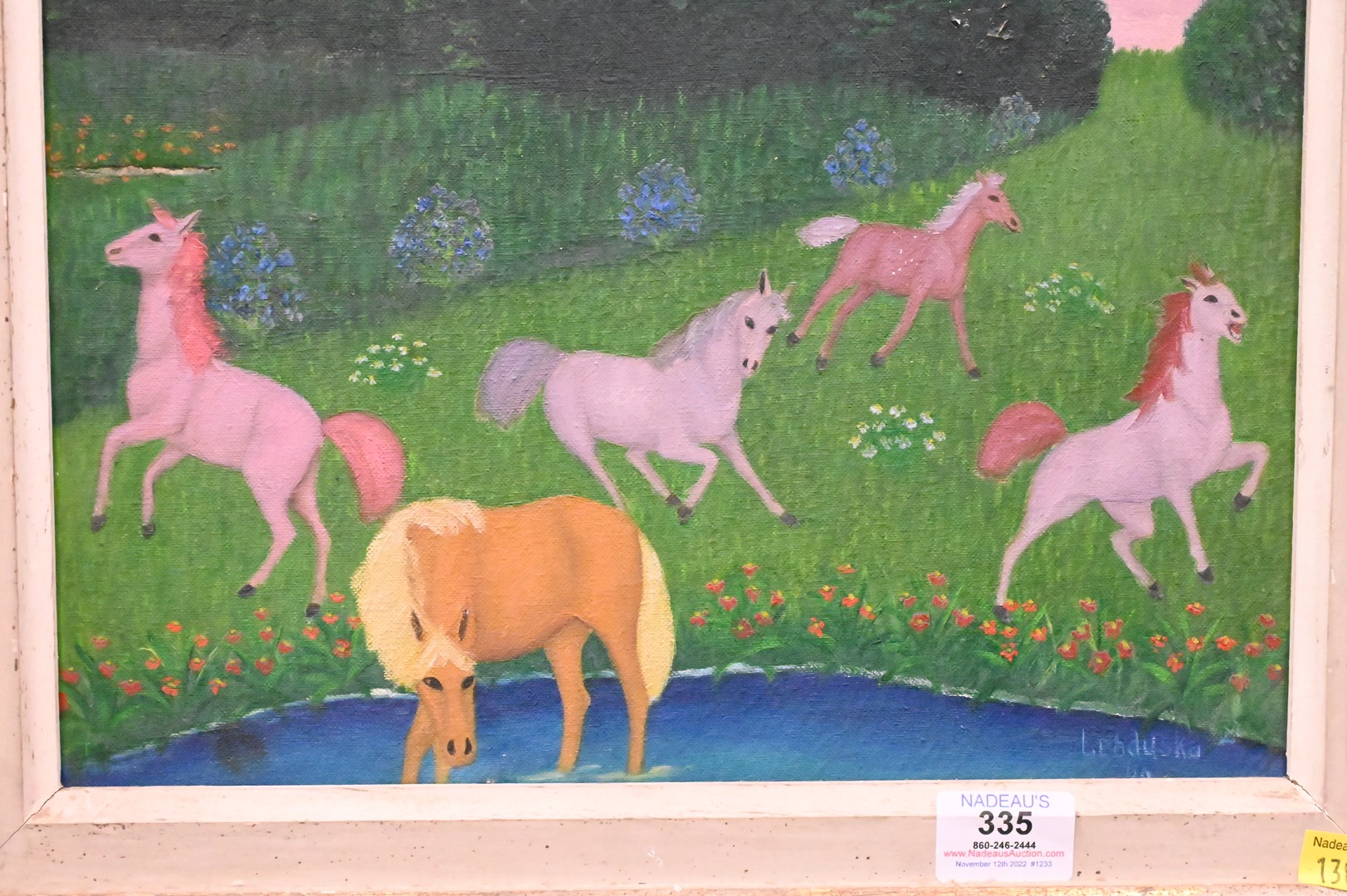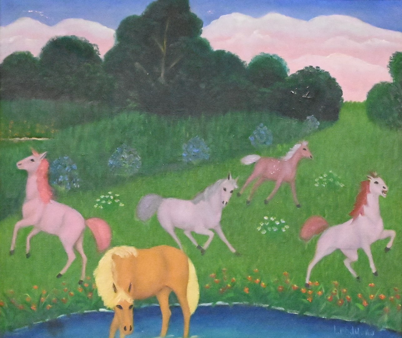 Lawrence Lebduska (1894 – 1966), Cantering Horses 1946, oil on canvas, signed Lebduska lower right, museum label on back, Christie’s label on frame, 11 7/8″ x 14″.