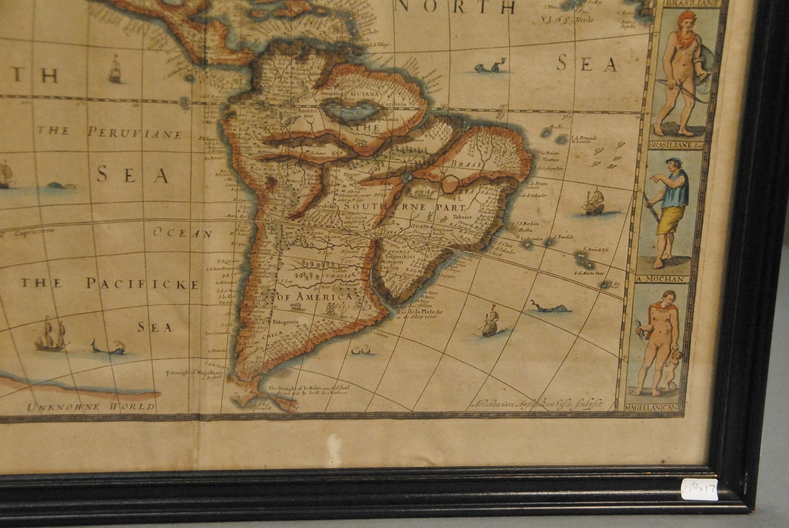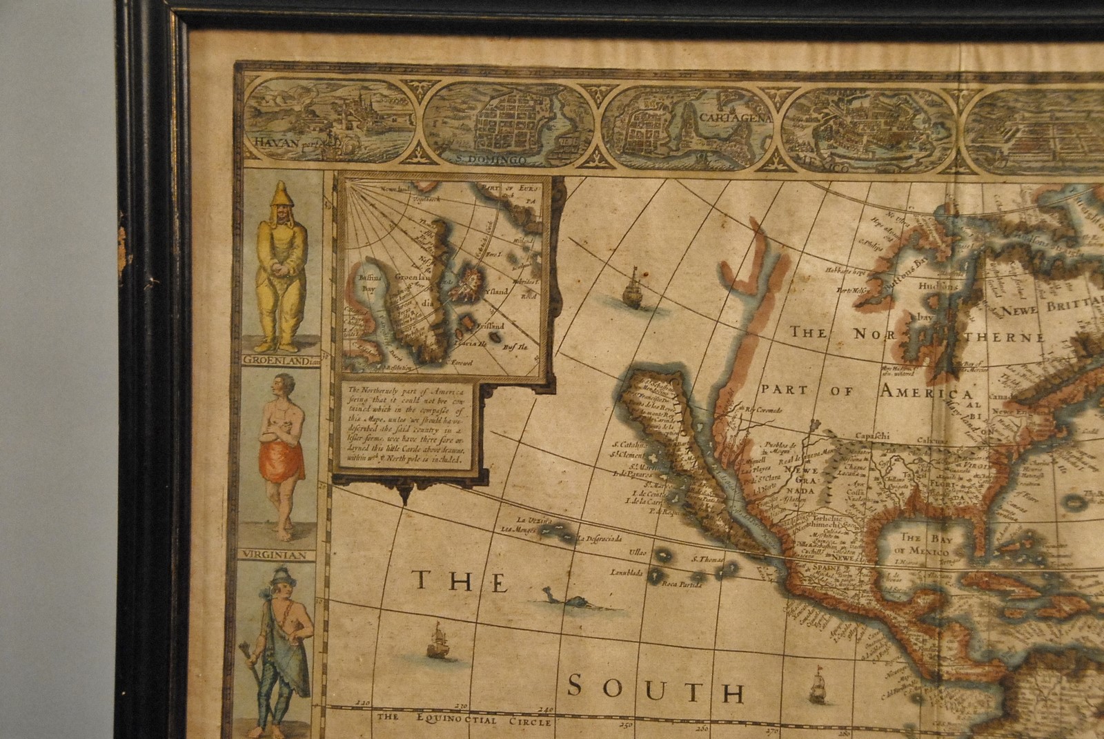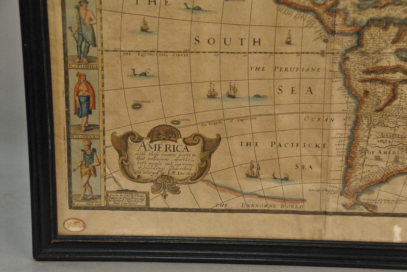 Lot 335: Map of America with those known parts in that unknown world both people and manner of buildings described enlarged by I.S. Ano 1626, marked Are to be Sold by Thomas Bassett in Fleet St. and by Richard Chiswell in St. Pauls Church Yard, Abraham Goos A