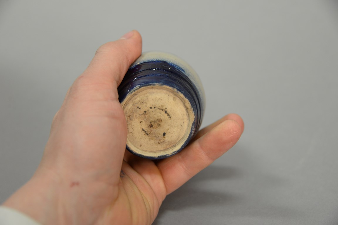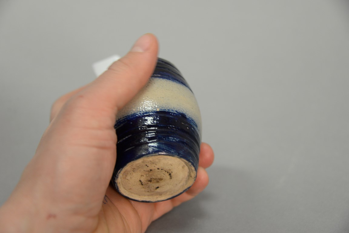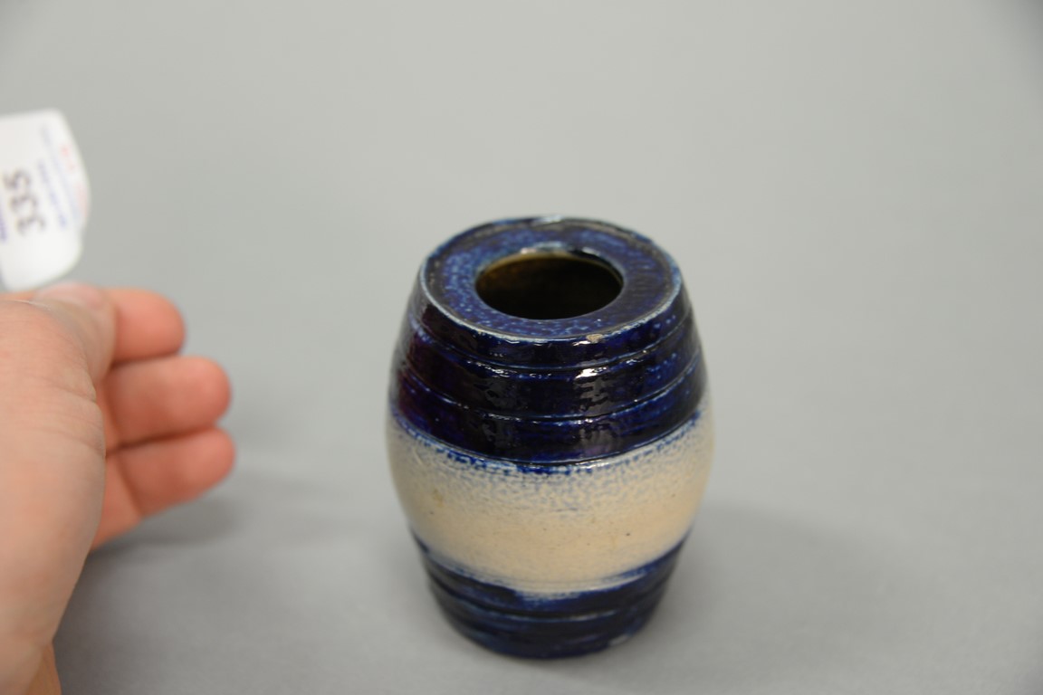 Lot 335: Miniature stoneware runlet with cobalt blue top and bottom, keg form. minor chip on top height 3 inches Provenance: Estat…