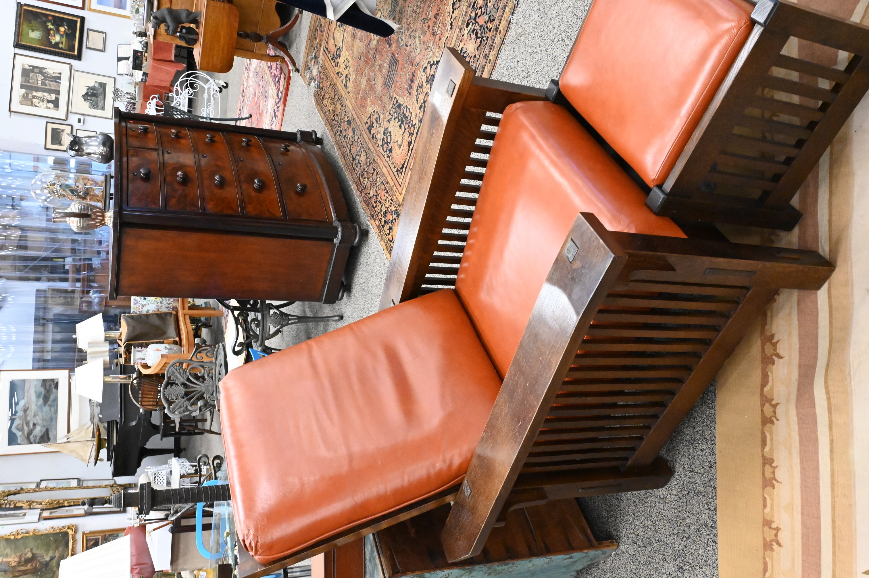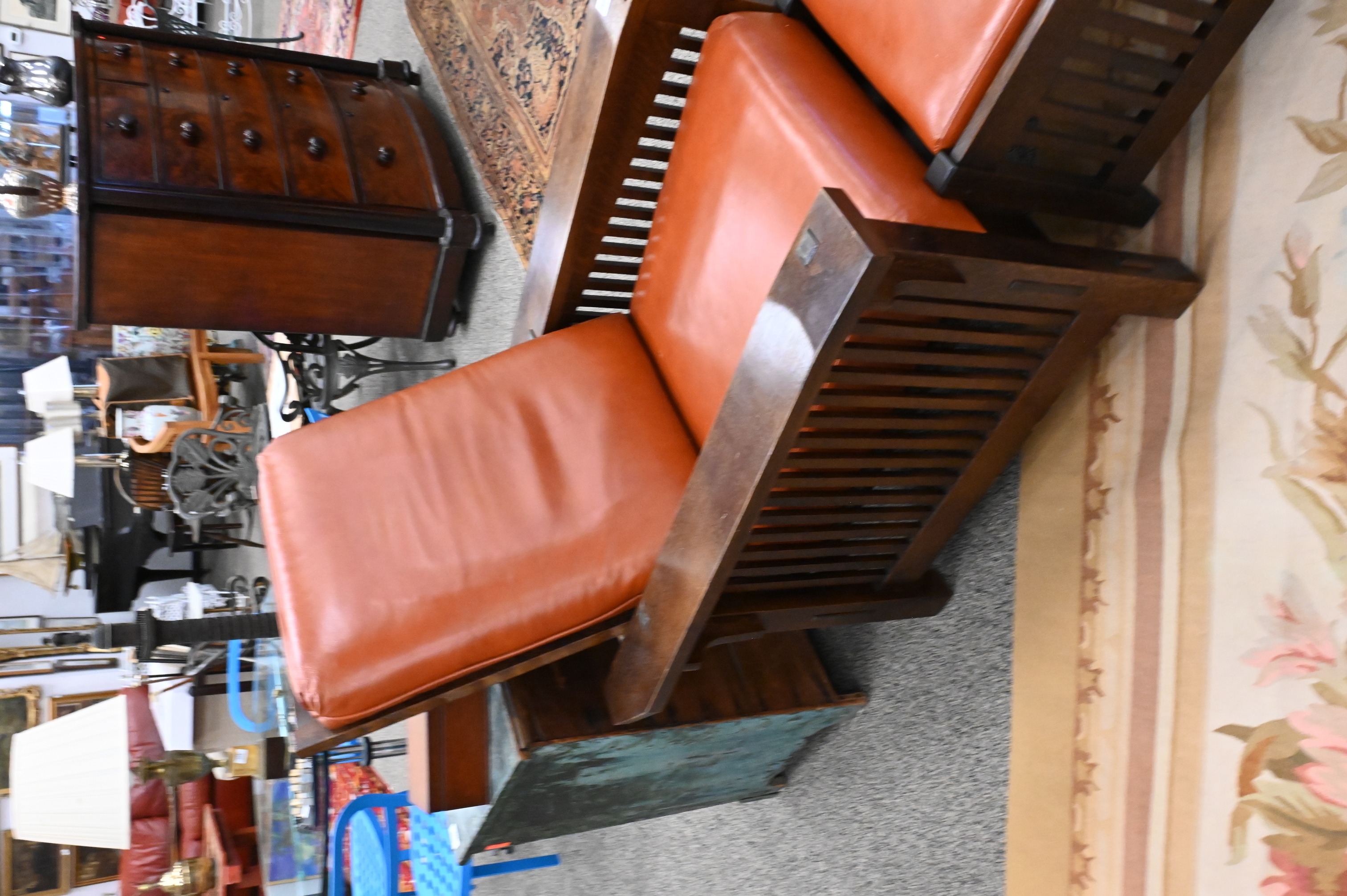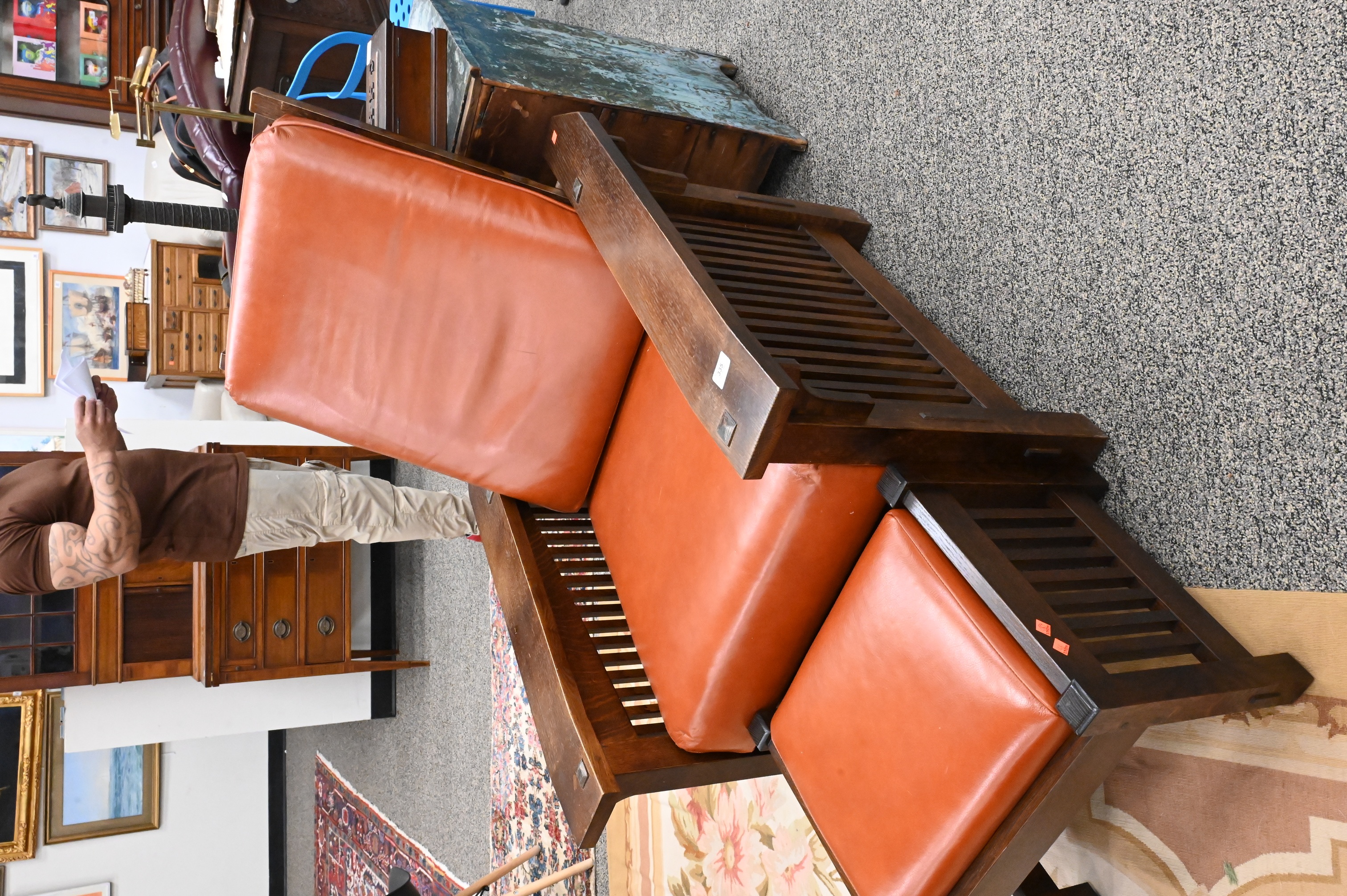 Lot 335: Mission Oak Leather Upholstered Morris Chair and Ottoman