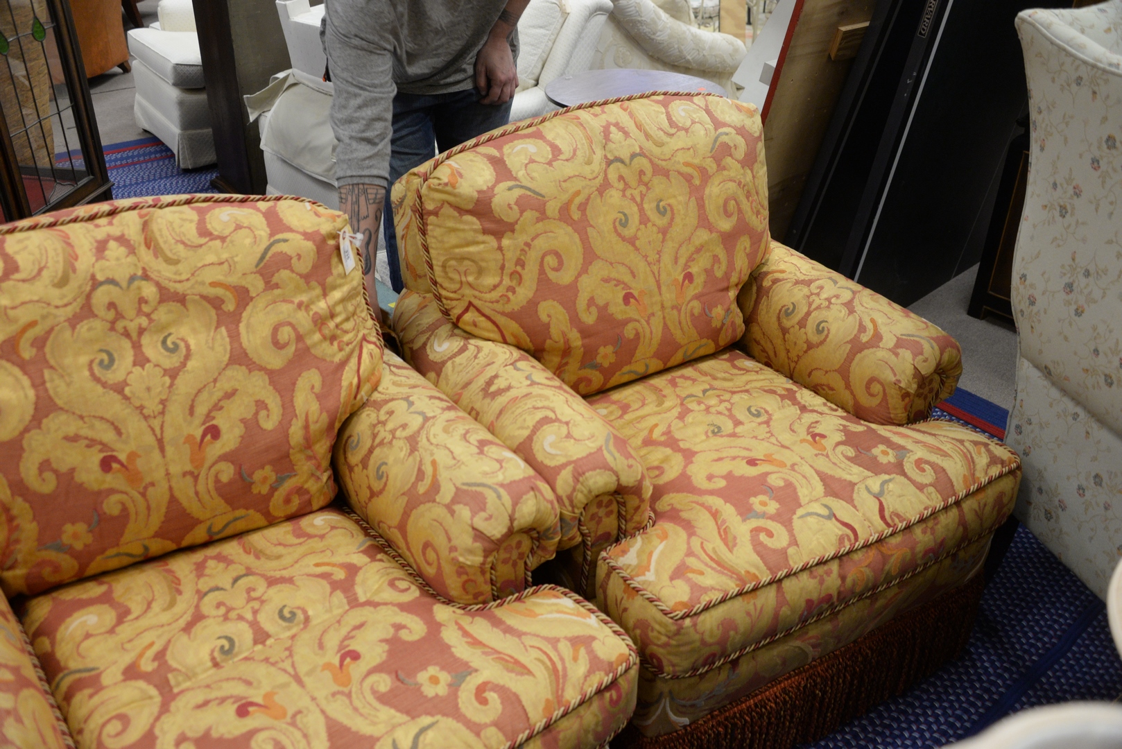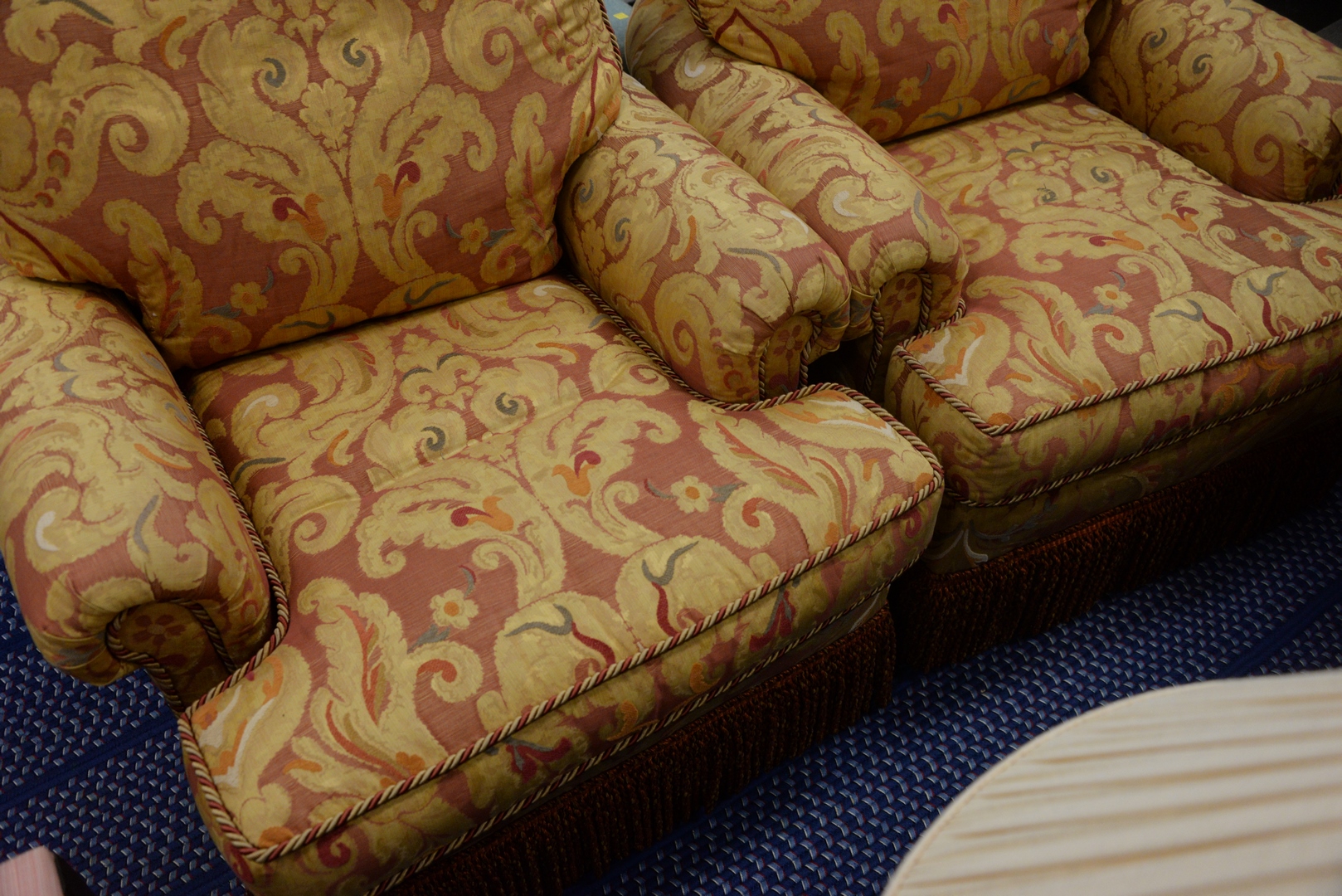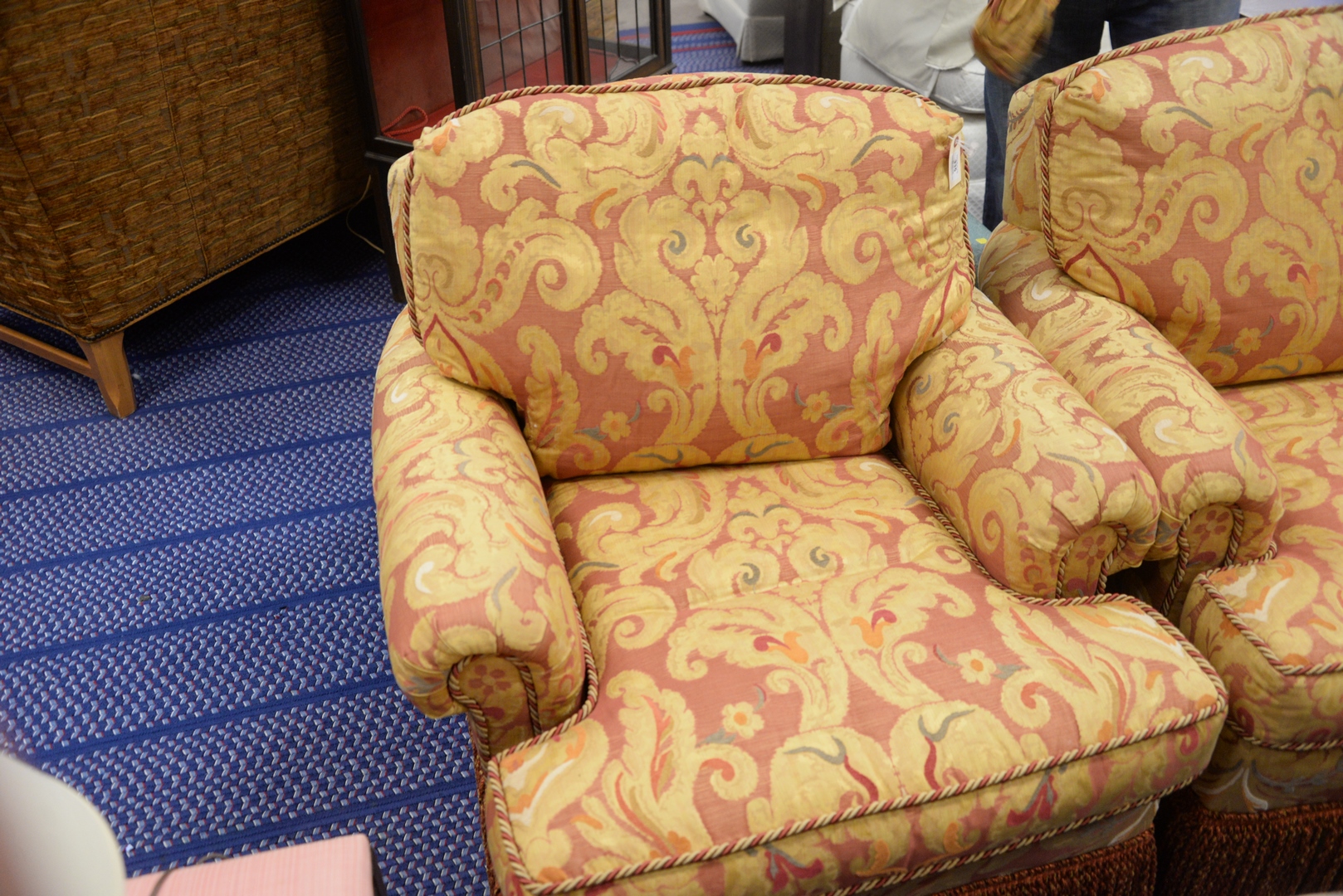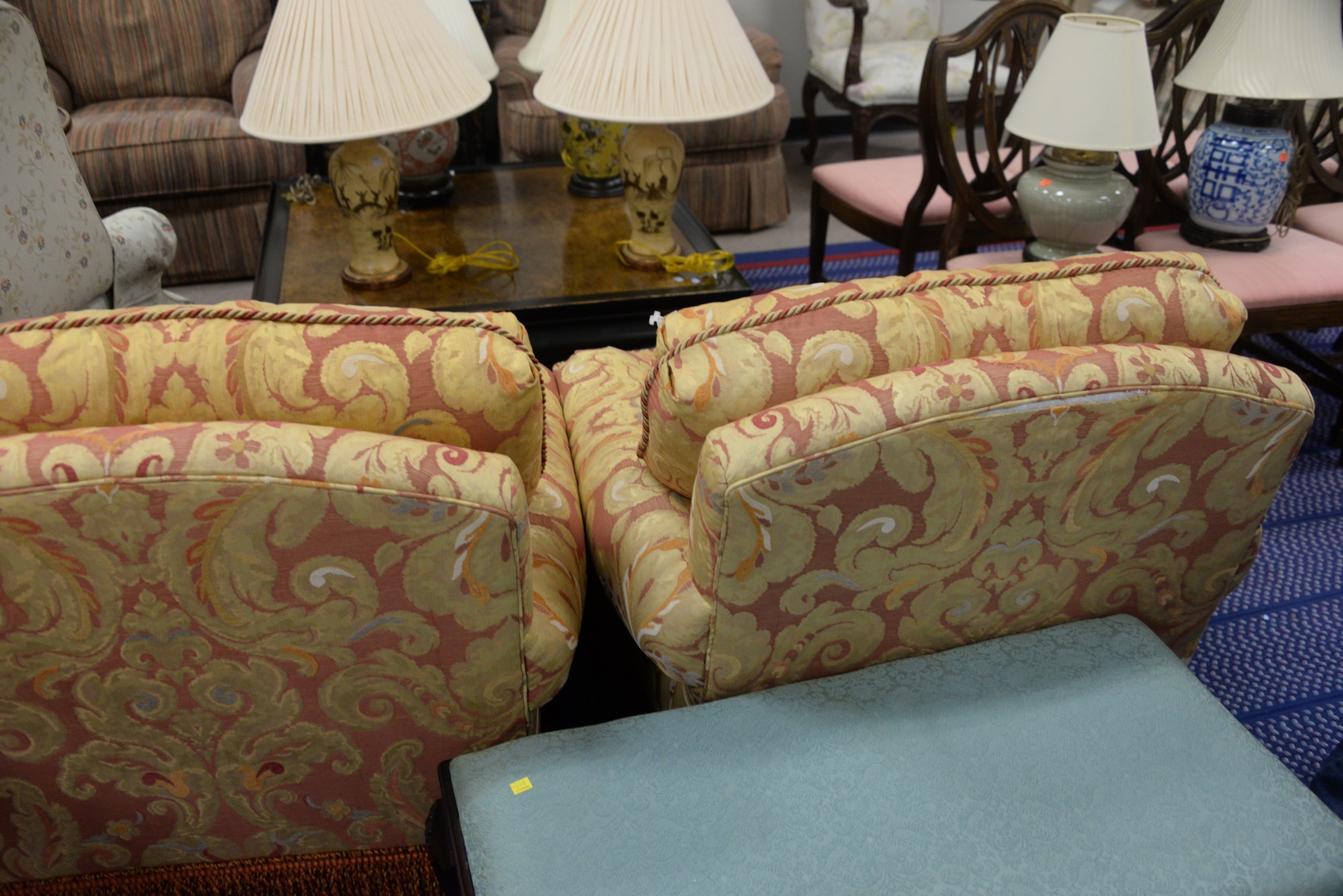 Pair Mason Art Upholstered Easy Chairs, height 34 inches, width 34 1/2 inches.