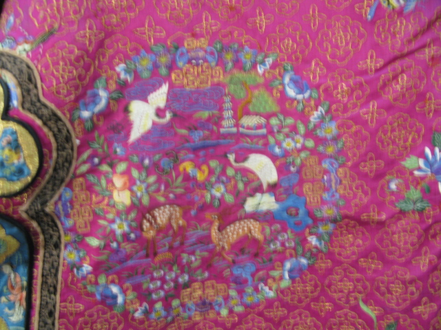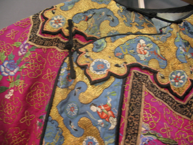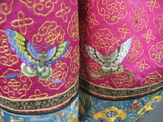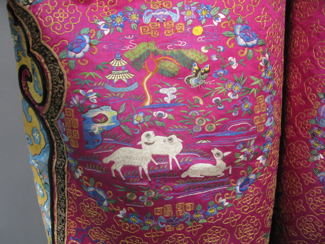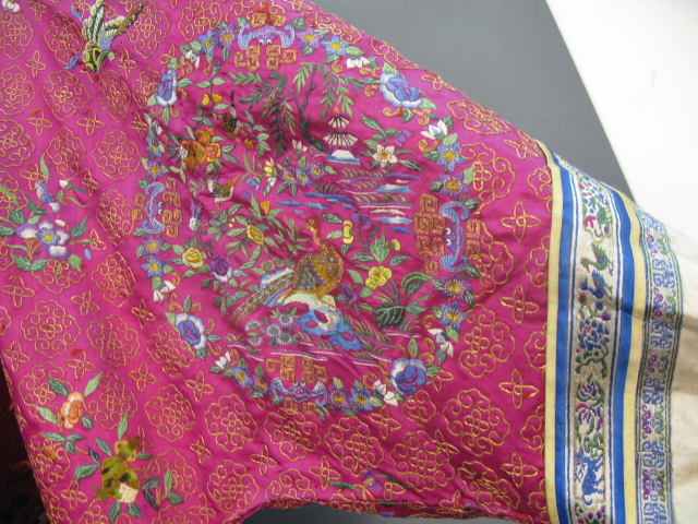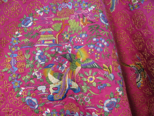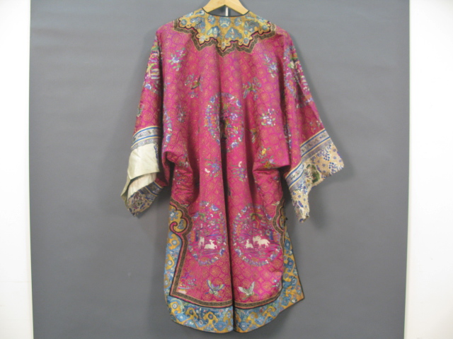 Pink silk women’s informal gold threaded robe having brightly colored butterflies and flowers with twelve round embroidered patches with animals.