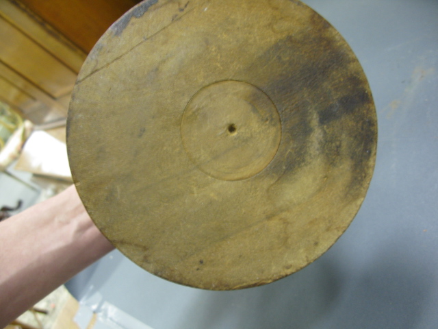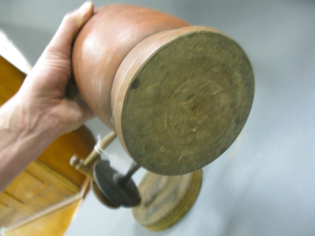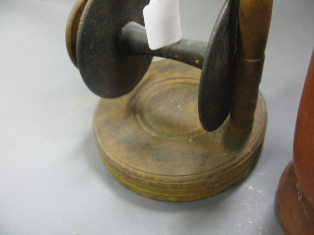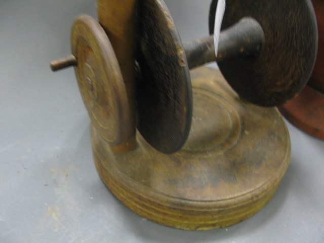 Primitive mortar and pestle along with a crank on stand, having crank and with leaf stenciling.