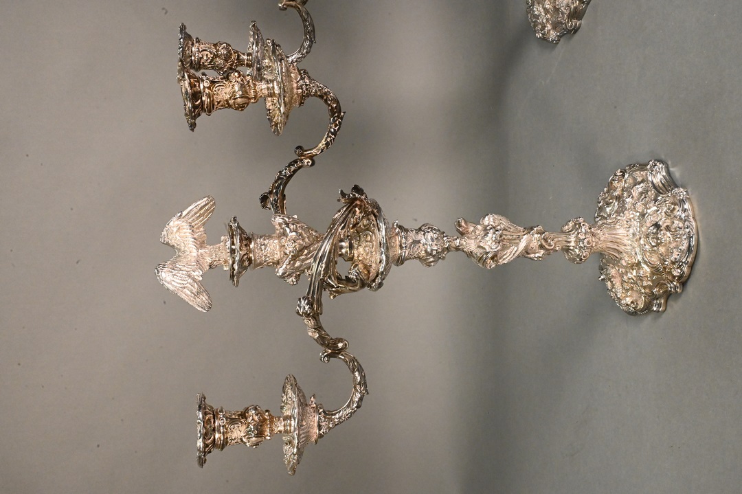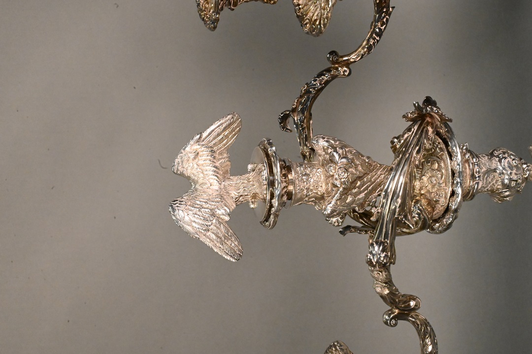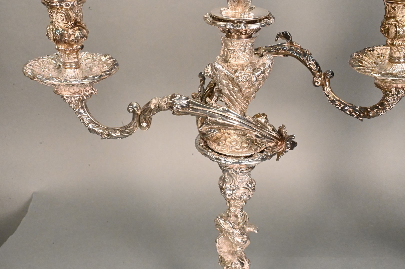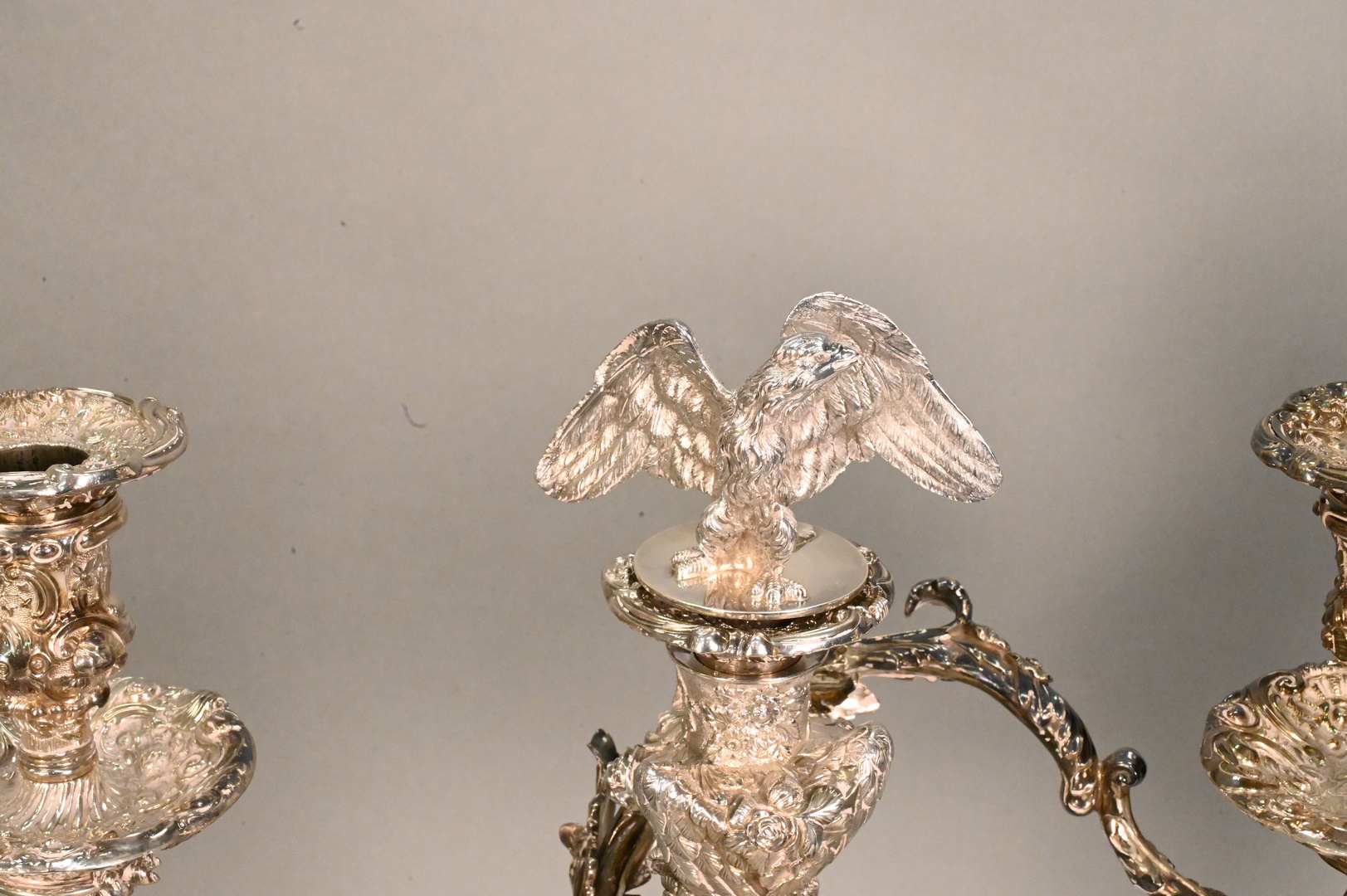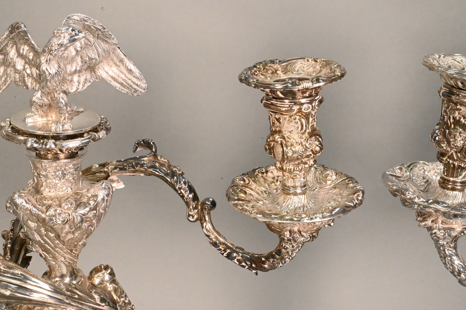 on shaped circular bases, cast and chased, with lion, dragon, dolphins, flowers, scrolls, stems cast with central eagle and lion masks, under two scroll foliage candle holder branches and central light with eagle wings and flowers under cup of branches with full eagles, central bobeche with outspread winged eagles, candlestick William Pitts branches by William Elliot, circa 1809.