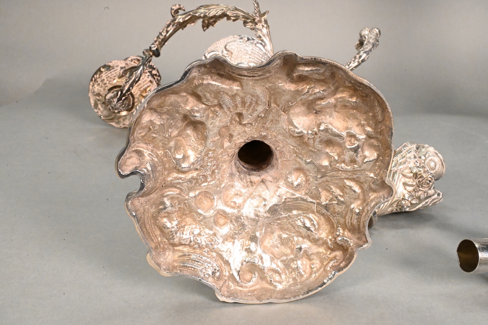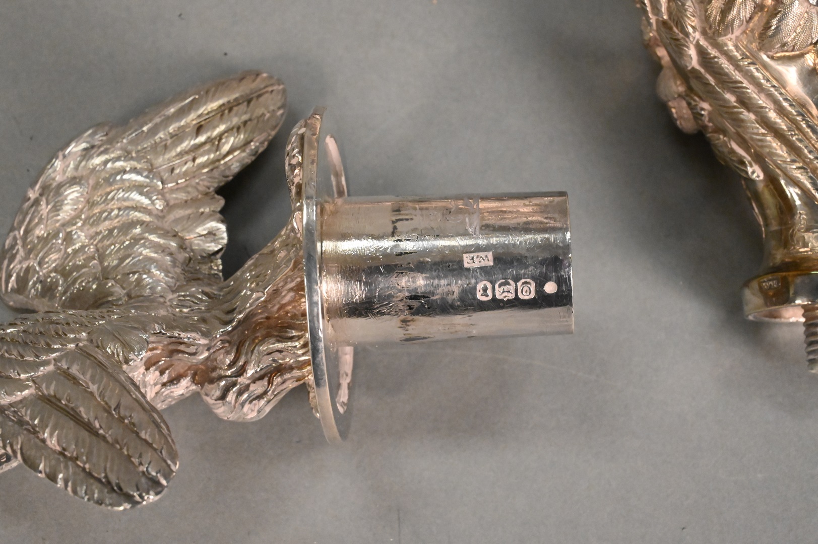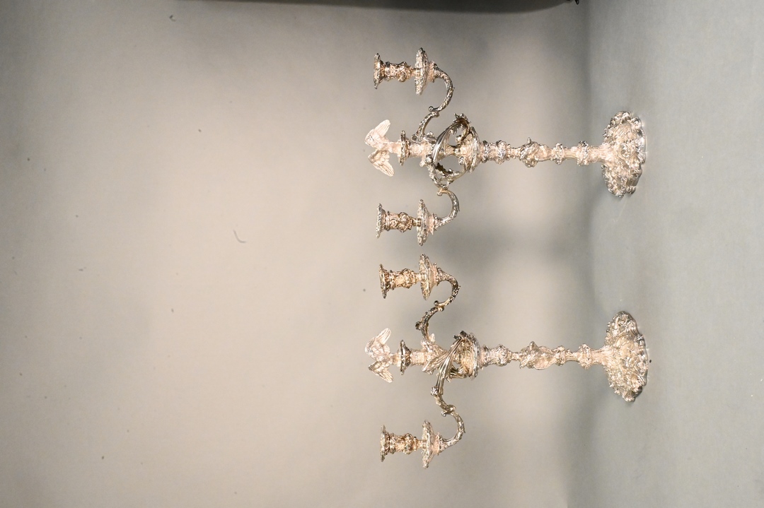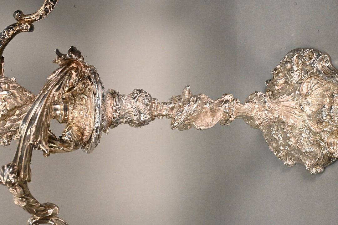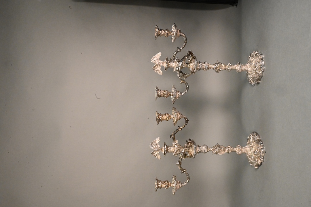 on shaped circular bases, cast and chased, with lion, dragon, dolphins, flowers, scrolls, stems cast with central eagle and lion masks, under two scroll foliage candle holder branches and central light with eagle wings and flowers under cup of branches with full eagles, central bobeche with outspread winged eagles, candlestick William Pitts branches by William Elliot, circa 1809.