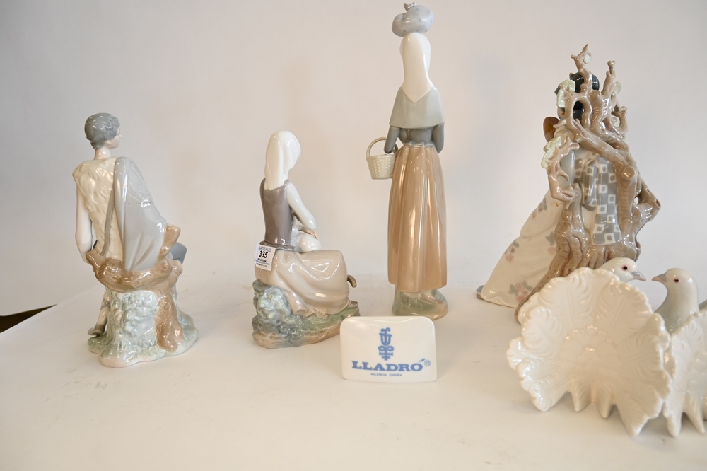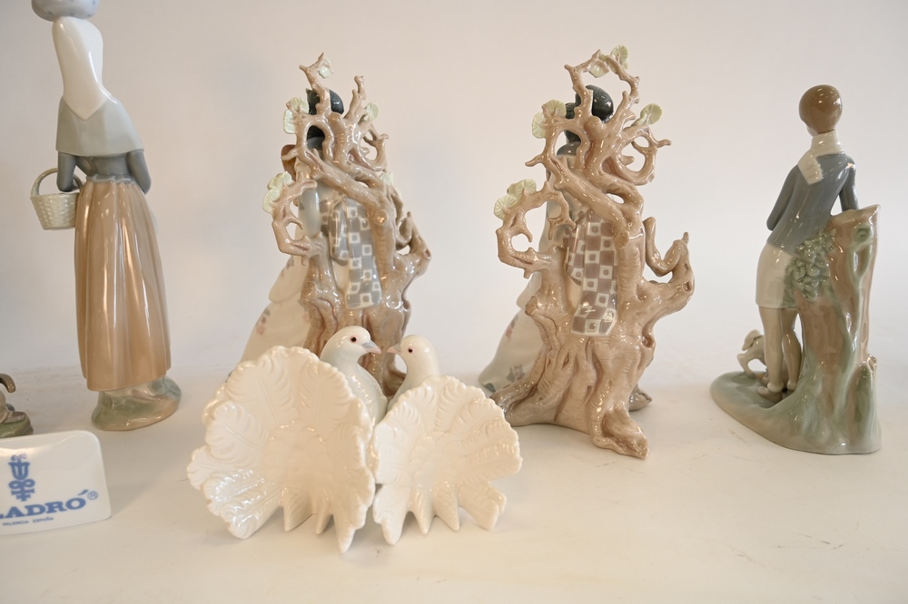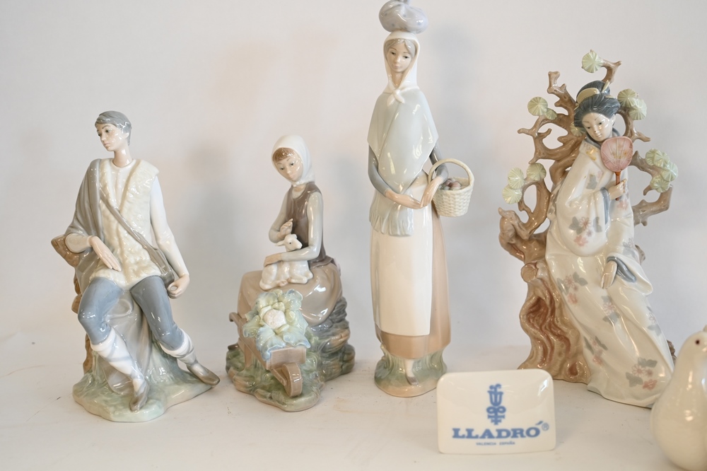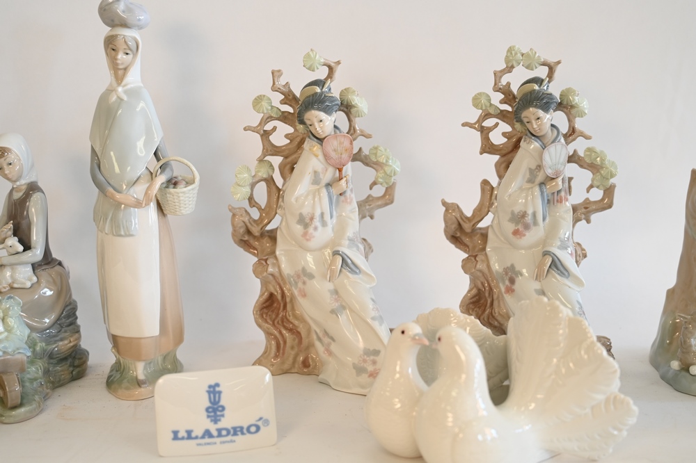 Lot 335: Seven Piece Lot of Porcelain Lladro Figures, to include two geisha figures, doves, a shepherd (missing staph), two children with animals, along with a girl carrying a basket of eggs, some accompanied by their original boxes, height of tallest 14 inches.